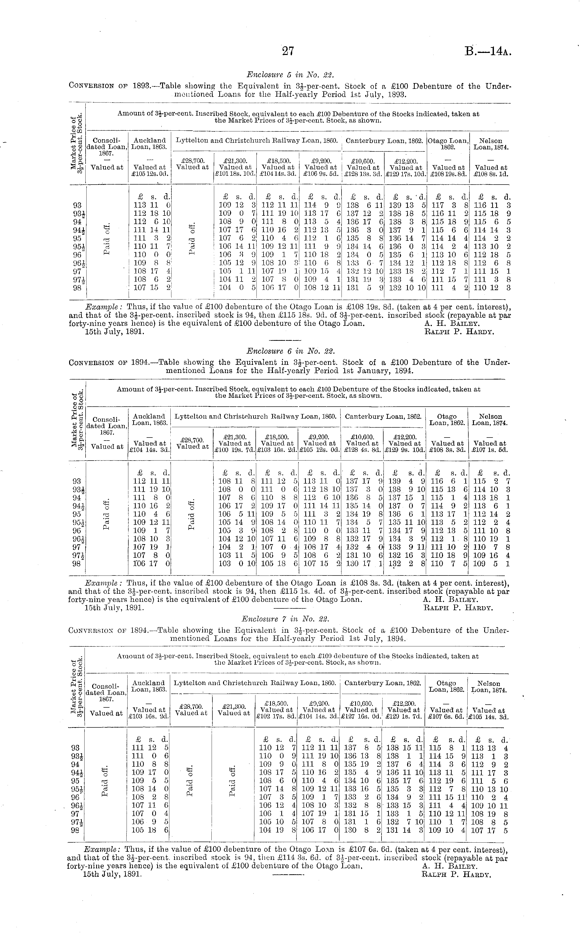 Example : Thus, if the value of £100 debenture of the Otago Loan is £108 3s. 3d. (taken at 4 per cent, interest), and that of the 3J-per-cent. inscribed stock is 94, then £115 Is. 4d. of 3J-per-cent. inscribed stock (repayable at par forty-nine years hence) is the equivalent of £100 debenture of the Otago Loan. A. H. Bailey. 15th July, 1891. Ralph P. Haedy.