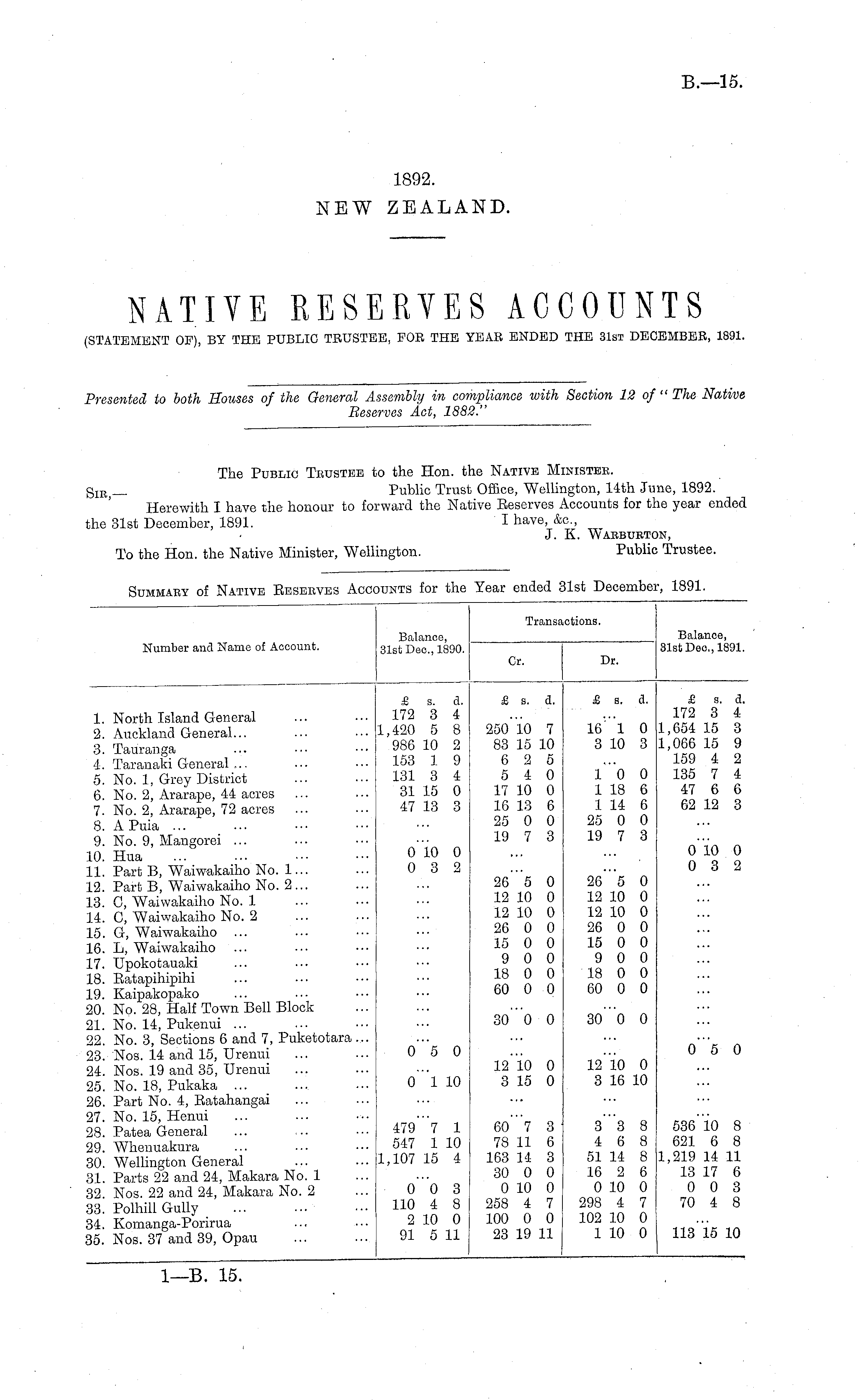 The Public Tbustee to the Hon. the Native Ministee. S IEj _ Public Trust Office, Wellington, 14th June, 1892. Herewith I have the honour to forward the Native Beserves Accounts for the year ended the 31st December, 1891. I have, &c, J. K. Waebueton, To the Hon. the Native Minister, Wellington. Public Trustee.