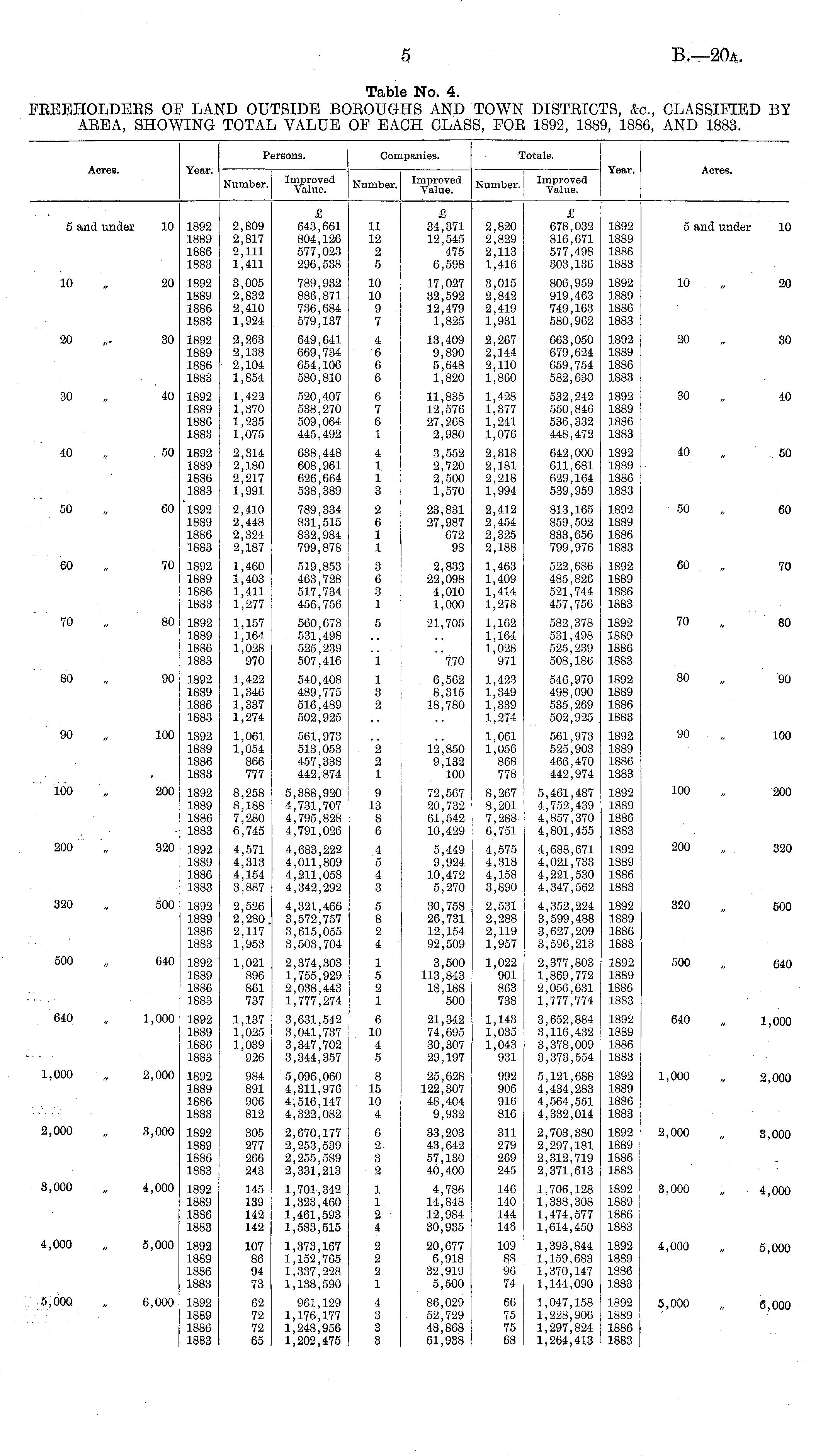 Table No. 4. FREEHOLDERS OF LAND OUTSIDE BOROUGHS AND TOWN DISTRICTS, &c., CLASSIFIED BY AREA, SHOWING TOTAL VALUE OF EACH CLASS, FOR 1892, 1889, 1886, AND 1883.