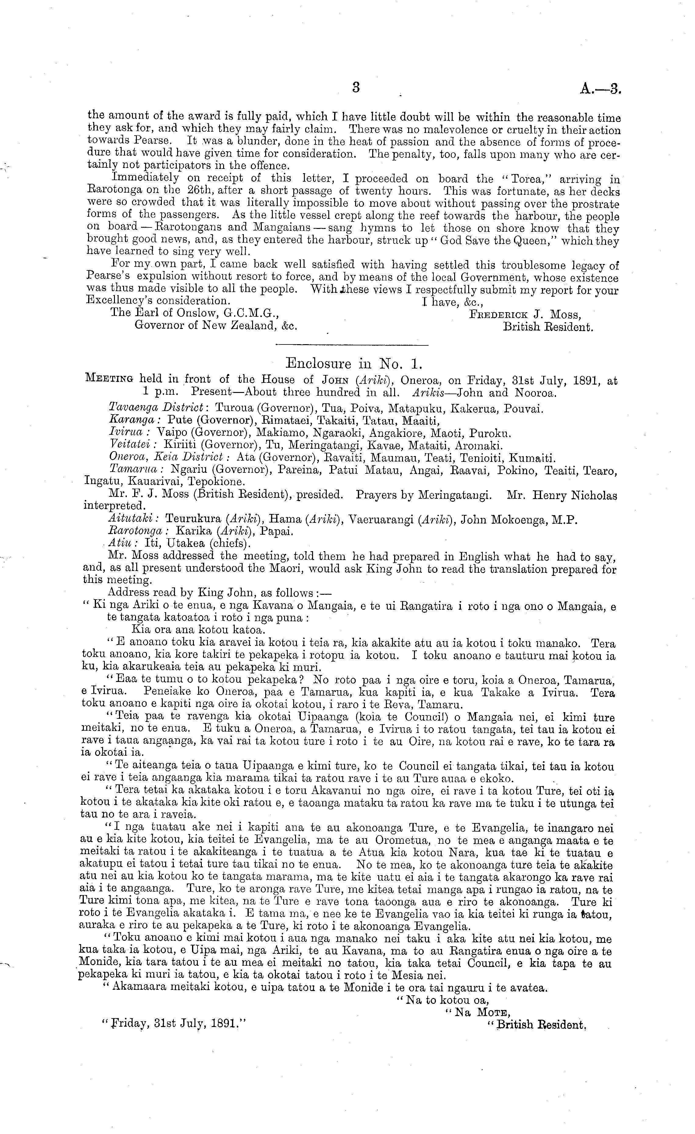 Enclosure in No. 1. Meeting held in front of the House of John {Ariki), Oneroa, on Friday, 31st July, 1891, at 1 p.m. Present —About three hundred, in all. Arikis —John and Nooroa. Tavaenga District: Turoua (Governor), Tua, Poiva, Matapuku, Kakerua, Pouvai. Karanga: Pute (Governor), Eimataei, Takaiti, Tatau, Maaiti, Ivirua : Vaipo (Governor), Makiamo, Ngaraoki, Angakiore, Maoti, Puroku. Veitatei: Kiriiti (Governor), Tv, Meringatangi, Kavae, Mataiti, Aromaki. Oneroa, Keia District .- Ata (Governor), Eavaiti, Maumau, Teati, Tenioiti, Kumaiti. Tamarua: Ngariu (Governor), Pareina, Patui Matau, Angai, Eaavai, Pokino, Teaiti, Tearo, Ingatu, Kauarivai, Tepokione. Mr. F. J. Moss (British Eesident), presided. Prayers by Meringatangi. Mr. Henry Nicholas interpreted. Aitutaki: Teurukura {Ariki), Hama {Ariki), Vaeruarangi {Ariki), John Mokoenga, M.P. Earotonga : Karika {Ariki), Papai. Atiu : Iti, Utakea (chiefs). Mr. Moss addressed the meeting, told them he had prepared in English what he had to say, and, as all present understood the Maori, would ask King John to read the translation prepared for this meeting. Address read by King John, as follows :— " Xi nga Ariki o to enua, c nga Kavana o Mangaia, c te vi Eangatira i roto i nga ono o Mangaia, c te tangata katoatoa i roto i nga puna : Kia ora ana kotou katoa. " E anoano toku kia aravei ia kotou i teia ra, kia akakite atu au ia kotou i toku manako. Tera toku anoano, kiakore takiri te pekapeka i rotopu ia kotou. I toku anoano c tauturu mai kotou ia ku, kia akarukeaia teia au pekapeka ki muri. "Eaa te tumu o to kotou pekapeka? No roto paa i nga oire c toru, koia a Oneroa, Tamarua, c Ivirua. Peneiake ko Oneroa, paa c Tamarua, kua kapiti ia, c kua Takake a Ivirua. Tera toku anoano c kapiti nga oire ia okotai kotou, i raro i te Eeva, Tamaru. " Teia paa te ravenga kia okotai Uipaanga (koia te Council) o Mangaia nei, ci kimi ture meitaki, no te enua. E tuku a Oneroa, a Tamarua, c Ivirua ito ratou tangata, tei tau ia kotou ci rave i taua angaanga, ka vai rai ta kotou ture i roto i te au Oire, na kotou rai c rave, ko te tara ra ia okotai ia. " Te aiteanga teia o taua Uipaanga c kimi ture, ko te Council ci tangata tikai, tei tau ia kotou ci rave i teia angaanga kia marama tikai ta ratou rave i te au Ture auaa c ekoko. " Tera tetai ka akataka kotou i c toru Akavanui no nga oire, ci rave i ta kotou Ture, tei oti ia kotou i te akataka kia kite oki ratou c, c taoanga mataku ta ratou ka rave ma te tuku i te utunga tei tau no te ara i raveia. "I nga tuatau ake nei i kapiti ana te au akonoanga Ture, c te Evangolia, te inangaro nei au c kia kite kotou, kia teitei te Evangelia, ma te au Orometua, no te mea c anganga maata c te meitaki ta ratou i te akakiteanga i te tuatua a te Atua kia kotou Nara, kua tae kite tuatau c akatupu ci tatou i tetai ture tau tikai no te enua. No te mea, ko te akonoanga ture teia te akakite atu nei au kia kotou ko te tangata marama, ma te kite uatu ci aia i te tangata akarongo ka rave rai aia ite angaanga. Ture, ko te aronga rave Ture, me kitea tetai manga apa i rungao ia ratou, na te Turekimi tona apa, me kitea, na te Ture c rave tona taoonga aua c riro te akonoanga. Ture ki roto ite Evangelia akataka i. E tama ma, c neo ke te Evangelia vao ia kia teitei ki runga ia tatou, auraka c riro te au pekapeka a te Ture, ki roto i te akonoanga Evangelia. " Toku anoano c kimi mai kotou i aua nga manako nei taku i aka kite atu nei kia kotou, me kua taka ia kotou, c Uipa mai, nga Ariki, te au Kavana, ma to au Eangatira enua o nga oire a te Monide, kia tara tatou i te au mea ci meitaki no tatou, kia taka tetai Council, c kia tapa te au pekapeka ki muri ia tatou, c kia ta okotai tatou i roto i te Mesia nei. " Akamaara meitaki kotou, c uipa tatou a te Monide i te ora tai ngauru i te avatea. " Na to kotou oa, " Friday, 31st July, 1891." « British Eesident,