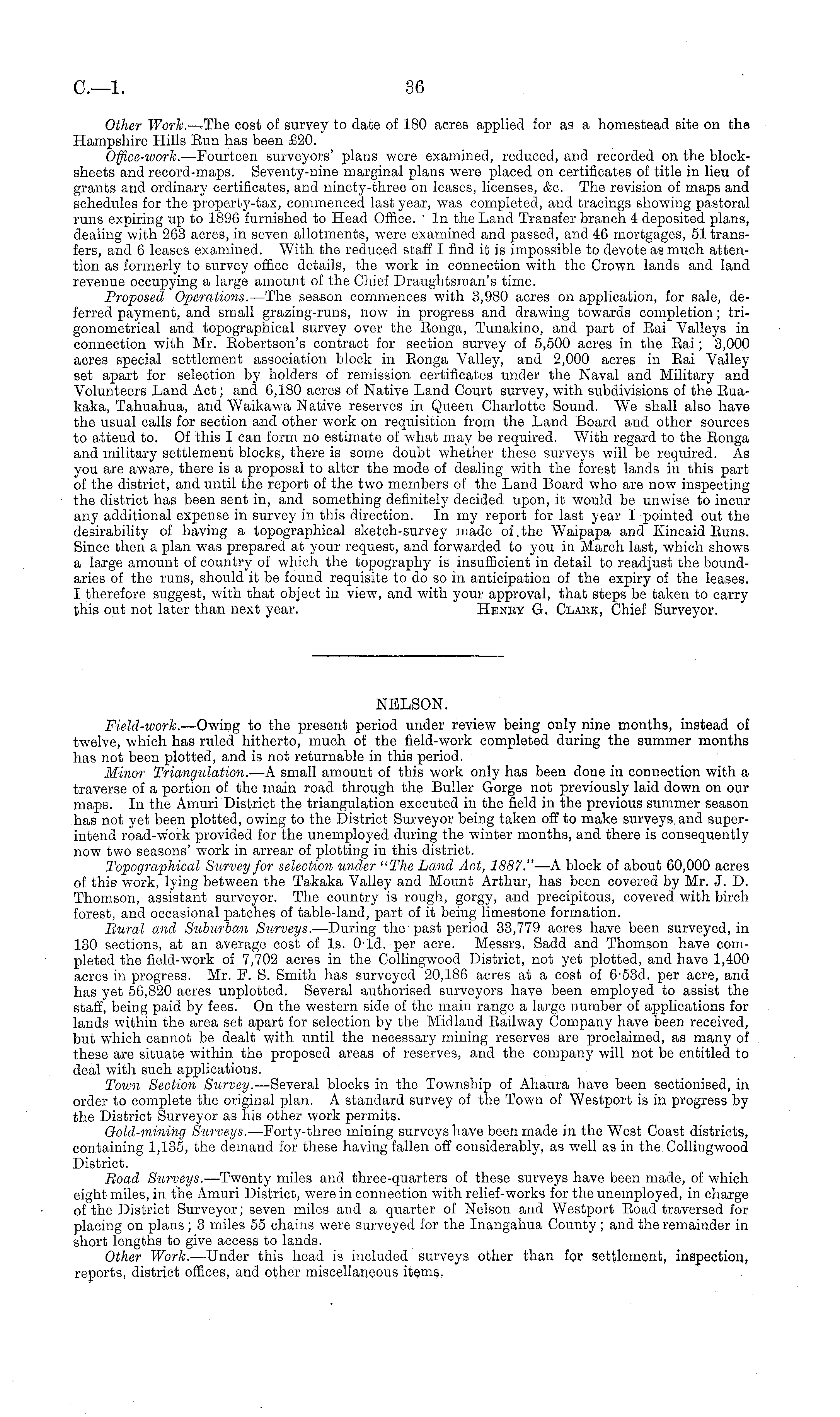 NELSON. Field-work. —Owing to the present period under review being only nine months, instead of twelve, which has ruled hitherto, much of the field-work completed during the summer months has not been plotted, and is not returnable in this period. Minor Triangulation. —A small amount of this work only has been done in connection with a traverse of a portion of the main road through the Buller Gorge not previously laid down on our maps. In the Amuri District the triangulation executed in the field in the previous summer season has not yet been plotted, owing to the District Surveyor being taken off to make surveys and superintend road-work provided for the unemployed during the winter months, and there is consequently now two seasons' work in arrear of plotting in this district. Topographical Survey for selection under "The Land Act, 1887." —A block of about 60,000 acres of this work, lying between the Takaka Valley and Mount Arthur, has been covered by Mr. J. D. Thomson, assistant surveyor. The country is rough, gorgy, and precipitous, covered with birch forest, and occasional patches of table-land, part of it being limestone formation. Rural and Suburban Surveys. —During the past period 33,779 acres have been surveyed, in 130 sections, at an average cost of Is. 0-ld. per acre. Messrs. Sadd and Thomson have completed the field-work of 7,702 acres in the Collingwood District, not yet plotted, and have 1,400 acres in progress. Mr. F. S. Smith has surveyed 20,186 acres at a cost of 6-53 d. per acre, and has yet 56,820 acres unplotted. Several authorised surveyors have been employed to assist the staff, being paid by fees. On the western side of the main range a large number of applications for lands within the area set apart for selection by the Midland Eailway Company have been received, but which cannot be dealt with until the necessary mining reserves are proclaimed, as many of these are situate within the proposed areas of reserves, and the company will not be entitled to deal with such applications. Town Section Survey. —Several blocks in the Township of Ahaura have been sectionised, in order to complete the original plan. A standard survey of the Town of Westport is in progress by the District Surveyor as his other work permits. Gold-mining Surveys. —Forty-three mining surveys have been made in the West Coast districts, containing 1,135, the demand for these having fallen off considerably, as well as in the Collingwood District. Road Surveys. —Twenty miles and three-quarters of these surveys have been made, of which eight miles, in the Amuri District, were in connection with relief-works for the unemployed, in charge of the District Surveyor; seven miles and a quarter of Nelson and Westport Eoad traversed for placing on plans; 3 miles 55 chains were surveyed for the Inangahua County ; and the remainder in short lengths to give access to lands. Other Work. —Under this head is included surveys other than for settlement, inspection, reports, district offices, and other miscellaneous items,