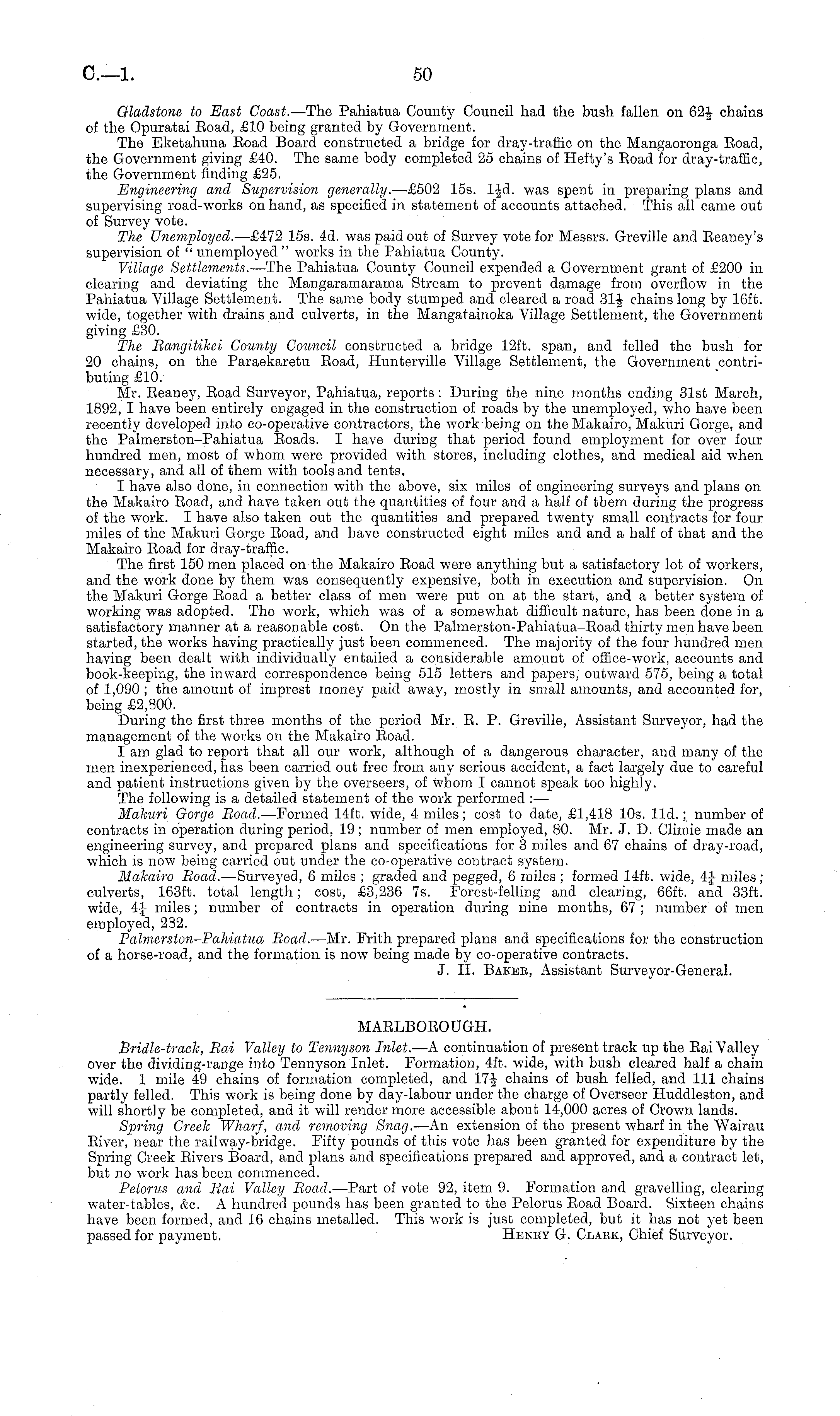 Gladstone to East Coast. —The Pahiatua County Council had the bush fallen on 62J chains of the Opuratai Eoad, £10 being granted by Government. The Eketahuna Eoad Board constructed a bridge for dray-traffic on the Mangaoronga Road, the Government giving £40. The same body completed 25 chains of Hefty's Eoad for dray-trafific, the Government finding £25. Engineering and Supervision generally. —£502 15s. lfd. was spent in preparing plans and supervising road-works on hand, as specified in statement of accounts attached. This all came out of Survey vote. The Unemployed. —£472 15s. 4d. was paid out of Survey vote for Messrs. Greville and Reaney's supervision of "unemployed" works in the Pahiatua County. Village Settlements. —The Pahiatua County Council expended a Government grant of £200 in clearing and deviating the Mangaramarama Stream to prevent damage from overflow in the Pahiatua Village Settlement. The same body stumped and cleared a road 31-J- chains long by 16ft. wide, together with drains and culverts, in the Mangatainoka Village Settlement, the Government giving £30. The Bangitikei County Council constructed a bridge 12ft. span, and felled the bush for 20 chains, on the Paraekaretu Eoad, Hunterville Village Settlement, the Government contributing £10. Mr. Eeaney, Eoad Surveyor, Pahiatua, reports: During the nine months ending 31st March, 1892, I have been entirely engaged in the construction of roads by the unemployed, who have been recently developed into co-operative contractors, the work being on theMakairo, Makuri Gorge, and the Palmerston-Pahiatua Eoads. I have during that period found employment for over four hundred men, most of whom were provided with stores, including clothes, and medical aid when necessary, and all of them with tools and tents. I have also done, in connection with the above, six miles of engineering surveys and plans on the Makairo Eoad, and have taken out the quantities of four and a half of them during the progress of the work. I have also taken out the quantities and prepared twenty small contracts for four miles of the Makuri Gorge Eoad, and have constructed eight miles and and a half of that and the Makairo Eoad for dray-traffic. The first 150 men placed on the Makairo Eoad were anything but a satisfactory lot of workers, and the work done by them was consequently expensive, both in execution and supervision. On the Makuri Gorge Eoad a better class of men were put on at the start, and a better system of working was adopted. The work, which was of a somewhat difficult nature, has been done in a satisfactory manner at a reasonable cost. On the Palmerston-Pahiatua-Eoad thirty men have been started, the works having practically just been commenced. The majority of the four hundred men having been dealt with individually entailed a considerable amount of office-work, accounts and book-keeping, the inward correspondence being 515 letters and papers, outward 575, being a total of 1,090 ; the amount of imprest money paid away, mostly in small amounts, and accounted for, being £2,300. During the first three months of the period Mr. R. P. Greville, Assistant Surveyor, had the management of the works on the Makairo Eoad. I am glad to report that all our work, although of a dangerous character, and many of the men inexperienced, has been carried out free from any serious accident, a fact largely due to careful and patient instructions given by the overseers, of whom I cannot speak too highly. The following is a detailed statement of the work performed : — Makuri Gorge Boad. —Formed 14ft. wide, 4 miles; cost to date, £1,418 10s. lid.; number of contracts in operation during period, 19; number of men employed, 80. Mr. J. D. Climie made an engineering survey, and prepared plans and specifications for 3 miles and 67 chains of dray-road, which is now being carried out under the co-operative contract system. Makairo Boad. —Surveyed, 6 miles ; graded and pegged, 6 miles ; formed 14ft. wide, 4} miles; culverts, 163 ft. total length; cost, £3,236 7s. Forest-felling and clearing, 66ft. and 33ft. wide, 4-J- miles; number of contracts in operation during nine months, 67; number of men employed, 232. Palmerston-Pahiatua Boad. —Mr. Frith prepared plans and specifications for the construction of a horse-road, and the formation is now being made by co-operative contracts. J. H. Baker, Assistant Surveyor-General.