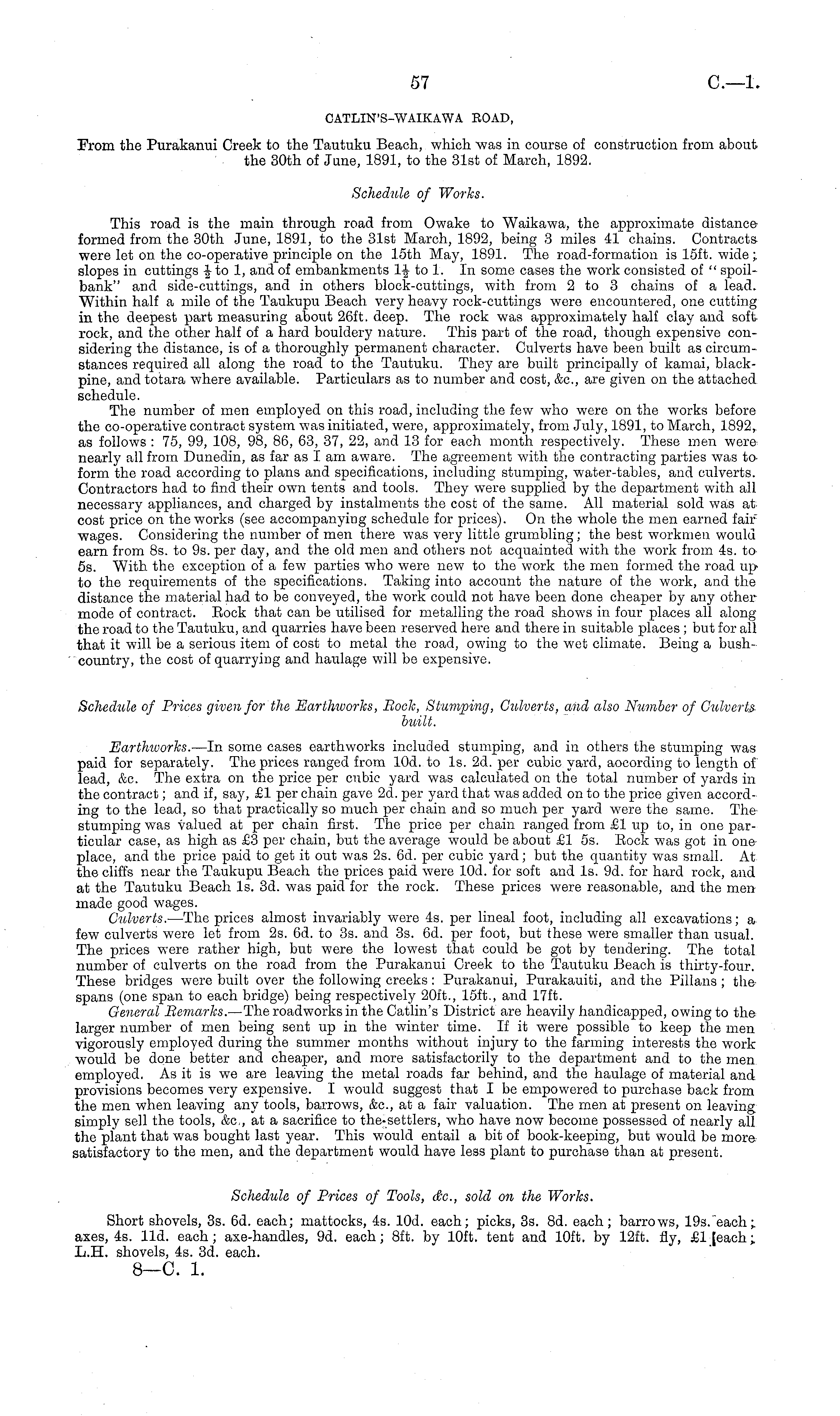 CATLIN'S-WAIKAWA ROAD, From the Purakanui Creek to the Tautuku Beach, which was in course of construction from about the 30th of Jane, 1891, to the 31st of March, 1892. Schedule of Works. This road is the main through road from Owake to Waikawa, the approximate distance formed from the 30th June, 1891, to the 31st March, 1892, being 3 miles 41 chains. Contracts were let on the co-operative principle on the 15th May, 1891. The road-formation is 15ft. wide;. slopes in cuttings \to 1, and of embankments 1-J- to 1. In some cases the work consisted of " spoilbank" and side-cuttings, and in others block-cuttings, with from 2 to 3 chains of a lead. Within half a mile of the Taukupu Beach very heavy rock-cuttings were encountered, one cutting in the deepest part measuring about 26ft. deep. The rock was approximately half clay and soft rock, and the other half of a hard bouldery nature. This part of the road, though expensive considering the distance, is of a thoroughly permanent character. Culverts have been built as circumstances required all along the road to the Tautuku. They are built principally of kamai, blackpine, and totara where available. Particulars as to number and cost, &c, are given on the attached schedule. The number of men employed on this road, including the few who were on the works before the co-operative contract system was initiated, were, approximately, from July, 1891, to March, 1892, as follows : 75, 99, 108, 98, 86, 63, 37, 22, and 13 for each month respectively. These men were nearly all from Dunedin, as far as I am aware. The agreement with the contracting parties was toform the road according to plans and specifications, including stumping, water-tables, and culverts. Contractors had to find their own tents and tools. They were supplied, by the department with all necessary appliances, and charged by instalments the cost of the same. All material sold was at cost price on the works (see accompanying schedule for prices). On the whole the men earned fair wages. Considering the number of men there was very little grumbling ; the best workmen would earn from Bs. to 9s. per day, and the old men and others not acquainted with the work from 4s. to ss. "With the exception of a few parties who were new to the work the men formed the road up to the requirements of the specifications. Taking into account the nature of the work, and the distance the material had to be conveyed, the work could not have been done cheaper by any other mode of contract. Bock that can be utilised for metalling the road shows in four places all along the road to the Tautuku, and quarries have been reserved here and there in suitable places ; but for all that it will be a serious item of cost to metal the road, owing to the wet climate. Being a bushcountry, the cost of quarrying and haulage will be expensive. Schedule of Prices given for the Earthworks, Bock, Stumping, Culverts, and also Number of Culvertsbuilt. Earthworks. —ln some cases earthworks included stumping, and in others the stumping was paid for separately. The prices ranged from 10d. to Is. 2d. per cubic yard, aocording to length of lead, &c. The extra on the price per cubic yard was calculated on the total number of yards in the contract; and if, say, £1 per chain gave 2d. per yard that was added on to the price given according to the lead, so that practically so much per chain and so much per yard were the same. Thestumping was valued at per chain first. The price per chain ranged from £1 up to, in one particular case, as high as £3 per chain, but the average would be about £1 ss. Eock was got in one place, and the price paid to get it out was 2s. 6d. per cubic yard; but the quantity was small. At the cliffs near the Taukupu Beach the prices paid were 10d. for soft and Is. 9d. for hard rock, and at the Tautuku Beach Is. 3d. was paid for the rock. These prices were reasonable, and the men made good wages. Culverts. —The prices almost invariably were 4s. per lineal foot, including all excavations; a few culverts were let from 2s. 6d. to 3s. and 3s. 6d. per foot, but these were smaller than usual. The prices were rather high, but were the lowest that could be got by tendering. The total number of culverts on the road from the Purakanui Creek to the Tautuku Beach is thirty-four. These bridges were built over the following creeks: Purakanui, Purakauiti, and the Pillans; the spans (one span to each bridge) being respectively 20ft., 15ft., and 17ft. General Bemarks. —The roadworks in the Catlin's District are heavily handicapped, owing to the larger number of men being sent up in the winter time. If it were possible to keep the men vigorously employed during the summer months without injury to the farming interests the work would be done better and cheaper, and more satisfactorily to the department and to the men employed. As it is we are leaving the metal roads far behind, and the haulage of material and provisions becomes very expensive. I would suggest that I be empowered to purchase back from the men when leaving any tools, barrows, &c, at a fair valuation. The men at present on leaving simply sell the tools, &c, at a sacrifice to the-settlers, who have now become possessed of nearly all the plant that was bought last year. This would entail a bit of book-keeping, but would be more satisfactory to the men, and the department would have less plant to purchase than at present. Schedule of Prices of Tools, &c, sold on the Works. Short shovels, 3s. 6d. each; mattocks, 4s. 10d. each; picks, 3s. Bd. each; barrows, 19s."each; axes, 4s. lid. each; axe-handles, 9d. each; Bft. by 10ft. tent and 10ft. by 12ft. fly, £l[each; L.H. shovels, 4s. 3d. each.