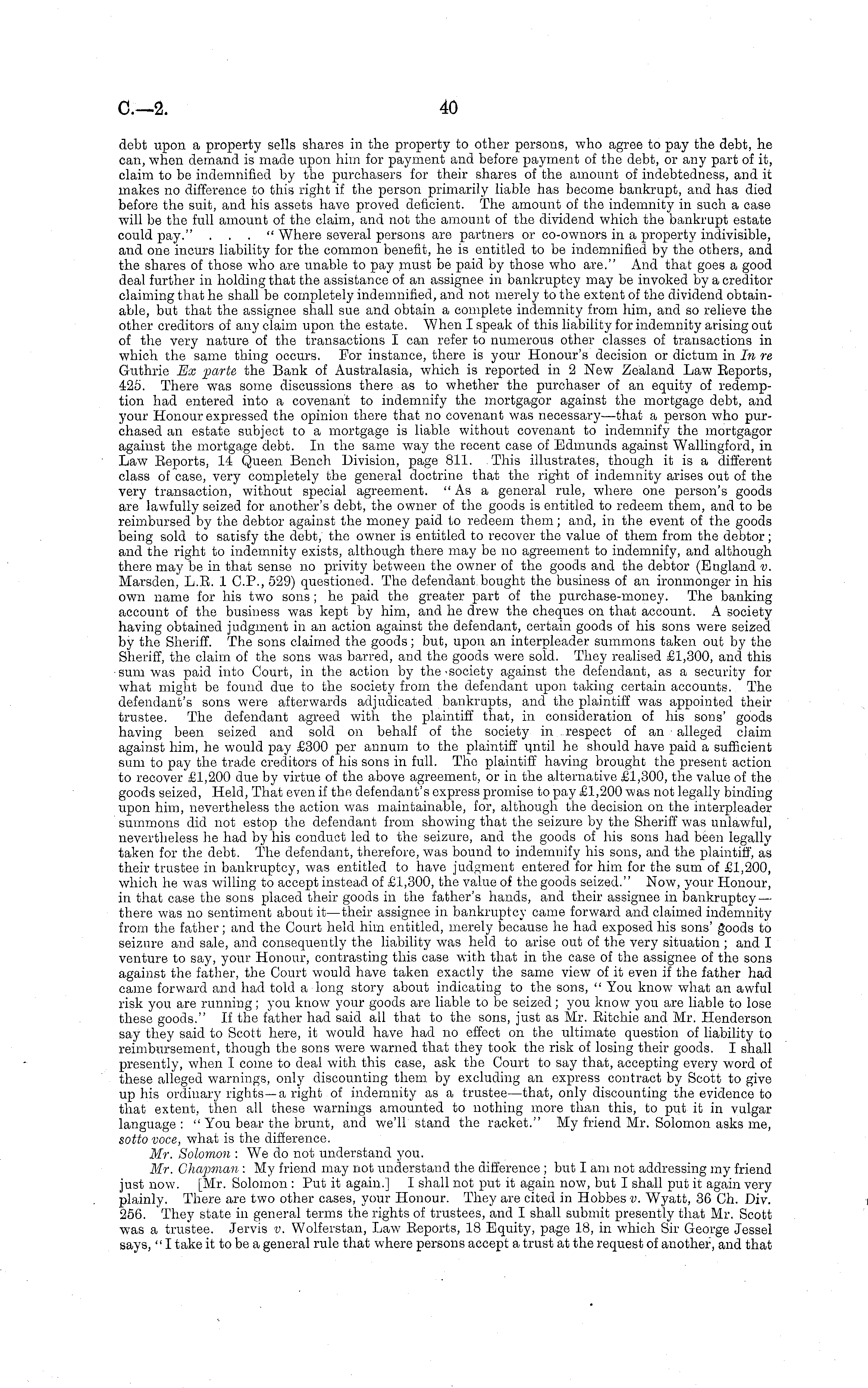 debt upon a property sells shares in the property to other persons, who agree to pay the debt, he can, when demand is made upon him for payment and before payment of the debt, or any part of it, claim to be indemnified by the purchasers for their shares of the amount of indebtedness, and it makes no difference to this right if the person primarily liable has become bankrupt, and has died before the suit, and his assets have proved deficient. The amount of the indemnity in such a case will be the full amount of the claim, and not the amount of the dividend which the bankrupt estate could pay." . . . " Where several persons are partners or co-ownors in a property indivisible, and one incurs liability for the common benefit, he is entitled to be indemnified by the others, and the shares of those who are unable to pay must be paid by those who are." And that goes a good deal further in holding that the assistance of an assignee in bankruptcy may be invoked by a creditor claiming that he shall be completely indemnified, and not merely to the extent of the dividend obtainable, but that the assignee shall sue and obtain a complete indemnity from him, and so relieve the other creditors of any claim upon the estate. When I speak of this liability for indemnity arising out of the very nature of the transactions I can refer to numerous other classes of transactions in which the same thing occurs. For instance, there is your Honour's decision or dictum in In re Guthrie Ex parte the Bank of Australasia, which is reported in 2 New Zealand Law Eeports, 425. There was some discussions there as to whether the purchaser of an equity of redemption had entered into a covenant to indemnify the mortgagor against the mortgage debt, and your Honour expressed the opinion there that no covenant was necessary—that a person who purchased an estate subject to a mortgage is liable without covenant to indemnify the mortgagor against the mortgage debt. In the same way the recent case of Edmunds against Wallingford, in Law Eeports, 14 Queen Bench Division, page 811. This illustrates, though it is a different class of case, very completely the general doctrine that the right of indemnity arises out of the very transaction, without special agreement. "As a general rule, where one person's goods are lawfully seized for another's debt, the owner of the goods is entitled to redeem them, and to be reimbursed by the debtor against the money paid to redeem them; and, in the event of the goods being sold to satisfy the debt, the owner is entitled to recover the value of them from the debtor; and the right to indemnity exists, although there may be no agreement to indemnify, and although there may be in that sense no privity between the owner of the goods and the debtor (England v. Marsden, L.B. 1 C.P., 529) questioned. The defendant bought the business of an ironmonger in his own name for his two sons ;he paid the greater part of the purchase-money. The banking account of the business was kept by him, and he drew the cheques on that account. A society having obtained judgment in an action against the defendant, certain goods of his sons were seized by the Sheriff. The sons claimed the goods; but, upon an interpleader summons taken out by the Sheriff, the claim of the sons was barred, and the goods were sold. They realised £1,300, and this sum was paid into Court, in the action by the -society against the defendant, as a security for what might be found due to the society from the defendant upon taking certain accounts. The defendant's sons were afterwards adjudicated bankrupts, and the plaintiff was appointed their trustee. The defendant agreed with the plaintiff that, in consideration of his sons' goods having been seized and sold on behalf of the society in respect of an alleged claim against him, he would pay £300 per annum to the plaintiff until he should have paid a sufficient sum to pay the trade creditors of his sons in full. The plaintiff having brought the present action to recover £1,200 due by virtue of the above agreement, or in the alternative £1,300, the value of the goods seized, Held, That even if the defendant's express promise to pay £1,200 was not legally binding upon him, nevertheless the action was maintainable, for, although the decision on the interpleader summons did not estop the defendant from showing that the seizure by the Sheriff was unlawful, nevertheless he had by his conduct led to the seizure, and the goods of his sons had been legally taken for the debt. The defendant, therefore, was bound to indemnify his sons, and the plaintiff, as their trustee in bankruptcy, was entitled to have judgment entered for him for the sum of £1,200, which he was willing to accept instead of £1,300, the value of the goods seized." Now, your Honour, in that case the sons placed their goods in the father's hands, and their assignee in bankruptcy — there was no sentiment about it —their assignee in bankruptcy came forward and claimed indemnity from the father; and the Court held him entitled, merely because he had exposed his sons' goods to seizure and sale, and consequently the liability was held to arise out of the very situation ; and I venture to say, your Honour, contrasting this case with that in the case of the assignee of the sons against the father, the Court would have taken exactly the same view of it even if the father had came forward and had told a long story about indicating to the sons, " You know what an awful risk you are running; you know your goods are liable to be seized; you know you are liable to lose these goods." If the father had said all that to the sons, just as Mr. Eitchie and Mr. Henderson say they said to Scott here, it would have had no effect on the ultimate question of liability to reimbursement, though the sons were warned that they took the risk of losing their goods. I shall presently, when I come to deal with this case, ask the Court to say that, accepting every word o