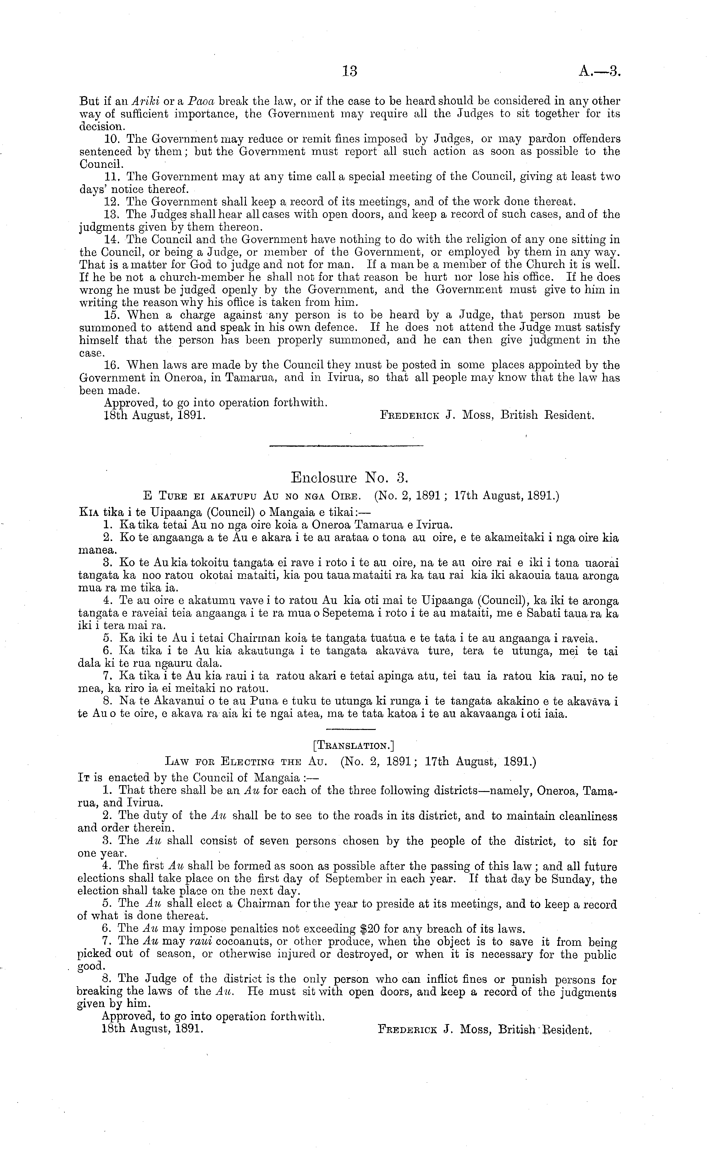Enclosure No. 3. E Ture ci akatupu Au no nga Oire. (No. 2, 1891; 17th August, 1891.) Kia tika i te Uipaanga (Council) o Mangaia c tikai: — 1. Katika tetai Au no nga oire koia a Oneroa Tamarua c Ivirua. 2. Ko te angaanga a te Au c akara i te au arataa o tona au oire, c te akameitaki i nga oire kia manea. 3. Ko te Aukia tokoitu tangata ci rave i roto i te au oire, na te au oire rai c iki i tona uaorai tangata ka noo ratou okotai mataiti, kia pou taua mataiti ra ka tau rai kia iki akaouia taua aronga mua ra me tika ia. 4. Te au oire c akatumu vave i to ratou Au kia oti mai te Uipaanga (Council), ka iki te aronga tangata c raveiai teia angaanga i te ra mua o Sepetema i roto i te au mataiti, me c Sabati taua ra ka iki i tera mai ra. 5. Ka iki te Au i tetai Chairman koia te tangata tuatua c te tata i te au angaanga i raveia. 6. Ka tika i te Au kia akautunga i te tangata akavava ture, tera te utunga, mci te tai dala kite rua ngauru dala. 7. Ka tika i te Au kia raui i ta ratou akari c tetai apinga atu, tei tau ia ratou kia raui, no te mea, ka riro ia ci meitaki no ratou. 8. Na te Akavanui o te au Puna c tuku te utunga ki runga i te tangata akakino c te akavava i te Au o te oire, c akava ra aia kite ngai atea, ma te tata katoa i te au akavaanga i oti iaia.
