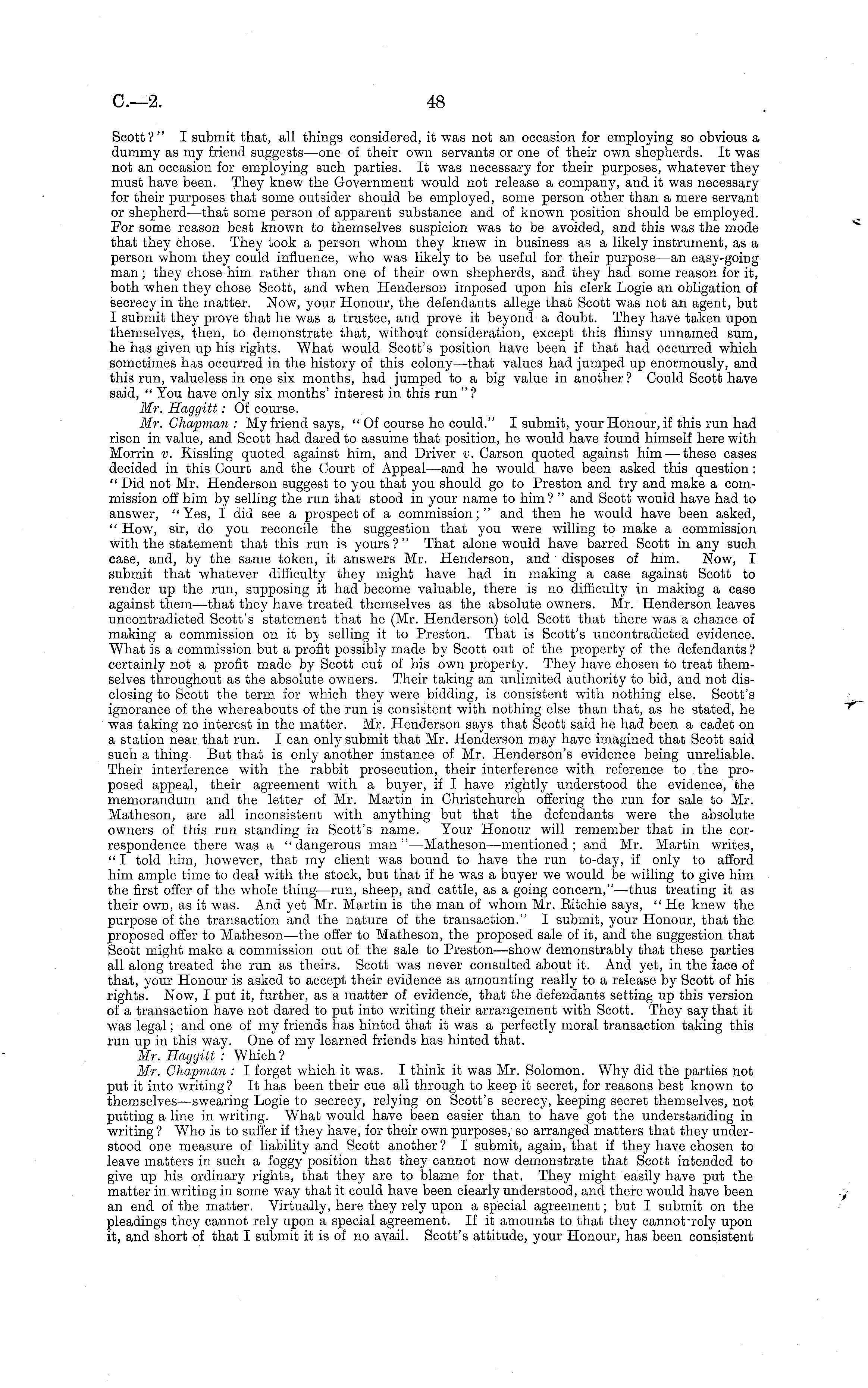 Scott?" I submit that, all things considered, it was not an occasion for employing so obvious a dummy as my friend suggests—one of their own servants or one of their own shepherds. It was not an occasion for employing such parties. It was necessary for their purposes, whatever they must have been. They knew the Government would not release a company, and it was necessary for their purposes that some outsider should be employed, some person other than a mere servant or shepherd—that some person of apparent substance and of known position should be employed. For some reason best known to themselves suspicion was to be avoided, and this was the mode that they chose. They took a person whom they knew in business as a likely instrument, as a person whom they could influence, who was likely to be useful for their purpose—an easy-going man; they chose him rather than one of their own shepherds, and they had some reason for it, both when they chose Scott, and when Henderson imposed upon his clerk Logic an obligation of secrecy in the matter. Now, your Honour, the defendants allege that Scott was not an agent, but I submit they prove that he was a trustee, and prove it beyond a doubt. They have taken upon themselves, then, to demonstrate that, without consideration, except this flimsy unnamed sum, he has given up his rights. What would Scott's position have been if that had occurred which sometimes has occurred in the history of this colony—that values had jumped up enormously, and this run, valueless in one six months, had jumped to a big value in another ? Could Scott have said, " You have only six months' interest in this run " ? Mr. Haggitt: Of course. Mr. Chapman : My friend says, "Of course he could." I submit, your Honour, if this run had risen in value, and Scott had dared to assume that position, he would have found himself here with Morrin v. Kissling quoted against him, and Driver v. Carson quoted against him — these cases decided in this Court and the Court of Appeal—and he would have been asked this question: " Did not Mr. Henderson suggest to you that you should go to Preston and try and make a commission off him by selling the run that stood in your name to him? " and Scott would have had to answer, "Yes, I did see a prospect of a commission;" and then he would have been asked, " How, sir, do you reconcile the suggestion that you were willing to make a commission with the statement that this run is yours?" That alone would have barred Scott in any such case, and, by the same token, it answers Mr. Henderson, and disposes of him. Now, I submit that whatever difficulty they might have had in making a case against Scott to render up the run, supposing it had become valuable, there is no difficulty in making a case against them—that they have treated themselves as the absolute owners. Mr. Henderson leaves uncontradicted Scott's statement that he (Mr. Henderson) told Scott that there was a chance of making a commission on it bj selling it to Preston. That is Scott's uncontradicted evidence. What is a commission but a profit possibly made by Scott out of the property of the defendants ? certainly not a profit made by Scott out of his own property. They have chosen to treat themselves throughout as the absolute owners. Their taking an unlimited authority to bid, and not disclosing to Scott the term for which they were bidding, is consistent with nothing else. Scott's ignorance of the whereabouts of the run is consistent with nothing else than that, as he stated, he was taking no interest in the matter. Mr. Henderson says that Scott said he had been a cadet on a station near that run. I can only submit that Mr. Henderson may have imagined that Scott said such a thing. But that is only another instance of Mr. Henderson's evidence being unreliable. Their interference with the rabbit prosecution, their interference with reference to the proposed appeal, their agreement with a buyer, if I have rightly understood the evidence, the memorandum and the letter of Mr. Martin in Christchurch offering the run for sale to Mr. Matheson, are all inconsistent with anything but that the defendants were the absolute owners of this run standing in Scott's name. Your Honour will remember that in the correspondence there was a "dangerous man" —Matheson —mentioned; and Mr. Martin writes, " I told him, however, that my client was bound to have the run to-day, if only to afford him ample time to deal with the stock, but that if he was a buyer we would be willing to give him the first offer of the whole thing—run, sheep, and cattle, as a going concern," —thus treating it as their own, as it was. And yet Mr. Martin is the man of whom Mr. Eitchie says, "He knew the purpose of the transaction and the nature of the transaction." I submit, your Honour, that the proposed offer to Matheson—the offer to Matheson, the proposed sale of it, and the suggestion that Scott might make a commission out of the sale to Preston —show demonstrably that these parties all along treated the run as theirs. Scott was never consulted about it. And yet, in the face of that, your Honour is asked to accept their evidence as amounting really to a release by Scott of his rights. Now, I put it, further, as a matter of evidence, that the defendants setting up this version of a transaction have not dared to put into writing their arrangement with Scott. They say that it was legal; and one of my friends has hinted that it was a perfectly moral transaction taking this run up in this way. One of my learned friends has hinted that. Mr. Haggitt : Which? Mr. Chapman : I forget which it was. I think it was Mr. Solomon. Why did the parties not put it into writing? It has been their cue all through to keep it secret, for reasons best known to themselves —swearing Logic to secrecy, relying on Scott's secrecy, keeping secret themselves, not putting a line in writing. What would have been easier than to have got the understanding in