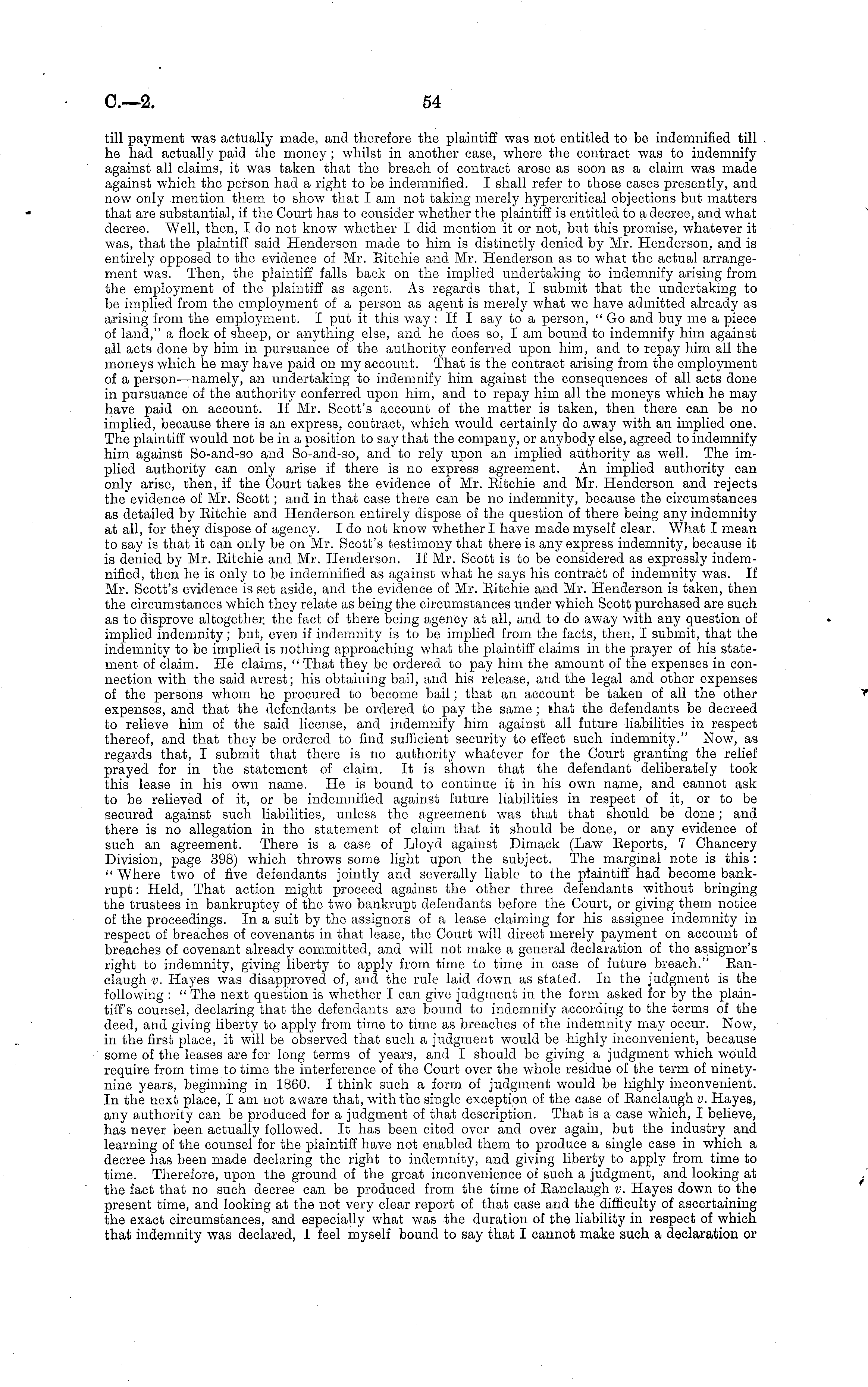 till payment was actually made, and therefore the plaintiff was not entitled to be indemnified till he had actually paid the money ; whilst in another case, where the contract was to indemnify against all claims, it was taken that the breach of contract arose as soon as a claim was made against which the person had a right to be indemnified. I shall refer to those cases presently, and now only mention them to show that I am not taking merely hypercritical objections but matters that are substantial, if the Court has to consider whether the plaintiff is entitled to a decree, and what decree. Well, then, Ido not know whether I did mention it or not, but this promise, whatever it was, that the plaintiff said Henderson made to him is distinctly denied by Mr. Henderson, and is entirely opposed to the evidence of Mr. Eitchie and Mr. Henderson as to what the actual arrangement was. Then, the plaintiff falls back on the implied undertaking to indemnify arising from the employment of the plaintiff as agent. As regards that, I submit that the undertaking to be implied from the employment of a person as agent is merely what we have admitted already as arising from the employment. I put it this way: If I say to a person, "Go and buy me a piece of land," a flock of sheep, or anything else, and he does so, I am bound to indemnify him against all acts done by him in pursuance of the authority conferred upon him, and to repay him all the moneys which he may have paid on my account. That is the contract arising from the employment of a person —namely, an undertaking to indemnify him against the consequences of all acts done in pursuance of the authority conferred upon him, and to repay him all the moneys which he may have paid on account. If Mr. Scott's account of the matter is taken, then there can be no implied, because there is an express, contract, which would certainly do away with an implied one. The plaintiff would not be in a position to say that the company, or anybody else, agreed to indemnify him against So-and-so and So-and-so, and to rely upon an implied authority as well. The implied authority can only arise if there is no express agreement. An implied authority can only arise, then, if the Court takes the evidence of Mr. Eitchie and Mr. Henderson and rejects the evidence of Mr. Scott; and in that case there can be no indemnity, because the circumstances as detailed by Eitchie and Henderson entirely dispose of the question of there being any indemnity at all, for they dispose of agency. Ido not know whether I have made myself clear. What I mean to say is that it can only be on Mr. Scott's testimony that there is any express indemnity, because it is denied by Mr. Eitchie and Mr. Henderson. If Mr. Scott is to be considered as expressly indemnified, then he is only to be indemnified as against what he says his contract of indemnity was. If Mr. Scott's evidence is set aside, and the evidence of Mr. Eitchie and Mr. Henderson is taken, then the circumstances which they relate as being the circumstances under which Scott purchased are such as to disprove altogether, the fact of there being agency at all, and to do away with any question of implied indemnity; but, even if indemnity is to be implied from the facts, then, I submit, that the indemnity to be implied is nothing approaching what the plaintiff claims in the prayer of his statement of claim. He claims, " That they be ordered to pay him the amount of the expenses in connection with the said arrest; his obtaining bail, and his release, and the legal and other expenses of the persons whom he procured to become bail; that an account be taken of all the other expenses, and that the defendants be ordered to pay the same ; that the defendants be decreed to relieve him of the said license, and indemnify him against all future liabilities in respect thereof, and that they be ordered to find sufficient security to effect such indemnity." Now, as regards that, I submit that there is no authority whatever for the Court granting the relief prayed for in the statement of claim. It is shown that the defendant deliberately took this lease in his own name. He is bound to continue it in his own name, and cannot ask to be relieved of it, or be indemnified against future liabilities in respect of it, or to be secured against such liabilities, unless the agreement was that that should be done; and there is no allegation in the statement of claim that it should be done, or any evidence of such an agreement. There is a case of Lloyd against Dimack (Law Eeports, 7 Chancery Division, page 398) which throws some light upon the subject. The marginal note is this : " Where two of five defendants jointly and severally liable to the plaintiff had become bankrupt : Held, That action might proceed against the other three defendants without bringing the trustees in bankruptcy of the two bankrupt defendants before the Court, or giving them notice of the proceedings. In a suit by the assignors of a lease claiming for his assignee indemnity in respect of breaches of covenants in that lease, the Court will direct merely payment on account of breaches of covenant already committed, and will not make a general declaration of the assignor's right to indemnity, giving liberty to apply from time to time in case of future breach." Eanclaugh v. Hayes was disapproved of, and the rule laid down as stated. In the judgment is the following : " The next question is whether I can give judgment in the form asked for by the plaintiff's counsel, declaring that the defendants are bound to indemnify according to the terms of the deed, and giving liberty to apply from time to time as breaches of the indemnity may occur. Now, in the first place, it will be observed that such a judgment would be highly inconvenient, because some of the leases are for long terms of years, and I should be giving a judgment which would require from time to time the interference of the Court over the whole residue 