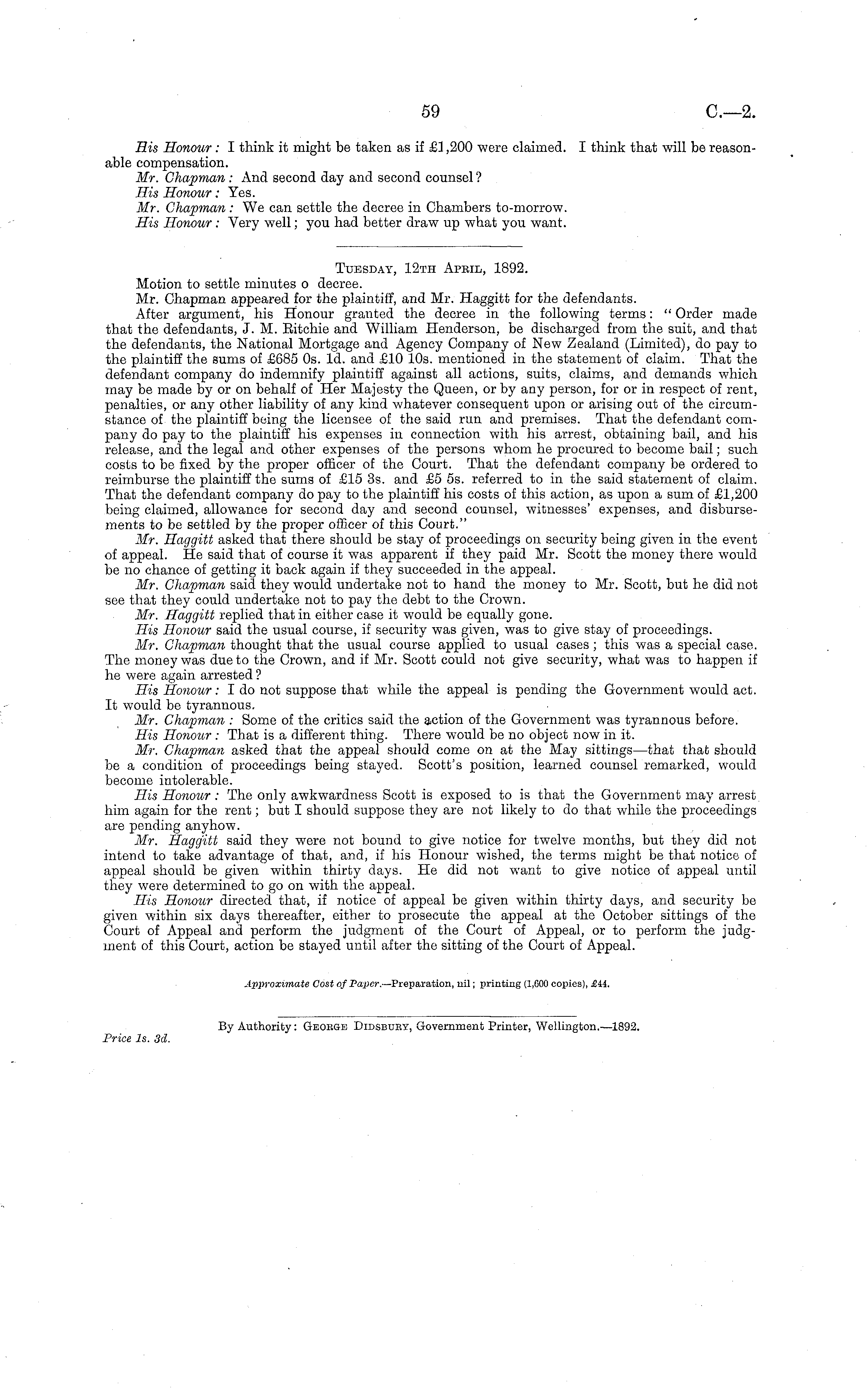Tuesday, 12th April, 1892. Motion to settle minutes o decree. Mr. Chapman appeared for the plaintiff, and Mr. Haggitt for the defendants. After argument, his Honour granted the decree in the following terms: " Order made that the defendants, J. M. Ritchie and William Henderson, be discharged from the suit, and that the defendants, the National Mortgage and Agency Company of New Zealand (Limited), do pay to the plaintiff the sums of £685 os. Id. and £10 10s. mentioned in the statement of claim. That the defendant company do indemnify plaintiff against all actions, suits, claims, and demands which may be made by or on behalf of Her Majesty the Queen, or by any person, for or in respect of rent, penalties, or any other liability of any kind whatever consequent upon or arising out of the circumstance of the plaintiff being the licensee of the said run and premises. That the defendant company do pay to the plaintiff his expenses in connection with his arrest, obtaining bail, and his release, and the legal and other expenses of the persons whom he procured to become bail; such costs to be fixed by the proper officer of the Court. That the defendant company be ordered to reimburse the plaintiff the sums of £15 3s. and £5 ss. referred to in the said statement of claim. That the defendant company do pay to the plaintiff his costs of this action, as upon a sum of £1,200 being claimed, allowance for second day and second counsel, witnesses' expenses, and disbursements to be settled by the proper officer of this Court." Mr. Haggitt asked that there should be stay of proceedings on security being given in the event of appeal. He said that of course it was apparent if they paid Mr. Scott the money there would be no chance of getting it back again if they succeeded in the appeal. Mr. Chapman said they would undertake not to hand the money to Mr. Scott, but he did not see that they could undertake not to pay the debt to the Crown. Mr. Haggitt replied that in either case it would be equally gone. His Honour said the usual course, if security was given, was to give stay of proceedings. Mr. Chapman thought that the usual course applied to usual cases ; this was a special case. The money was due to the Crown, and if Mr. Scott could not give security, what was to happen if he were again arrested ? His Honour: Ido not suppose that while the appeal is pending the Government would act. It would be tyrannous. Mr. Chapman : Some of the critics said the action of the Government was tyrannous before. His Honour : That is a different thing. There would be no object now in it. Mr. Chapman asked that the appeal should come on at the May sittings—that that should be a condition of proceedings being stayed. Scott's position, learned counsel remarked, would become intolerable. His Honour : The only awkwardness Scott is exposed to is that the Government may arrest him again for the rent; but I should suppose they are not likely to do that while the proceedings are pending anyhow. Mr. Haggitt said they were not bound to give notice for twelve months, but they did not intend to take advantage of that, and, if his Honour wished, the terms might be that notice of appeal should be given within thirty days. He did not want to give notice of appeal until they were determined to go on with the appeal. His Honour directed that, if notice of appeal be given within thirty days, and security be given within six days thereafter, either to prosecute the appeal at the October sittings of the Court of Appeal and perform the judgment of the Court of Appeal, or to perform the judgment of this Court, action be stayed until after the sitting of the Court of Appeal.