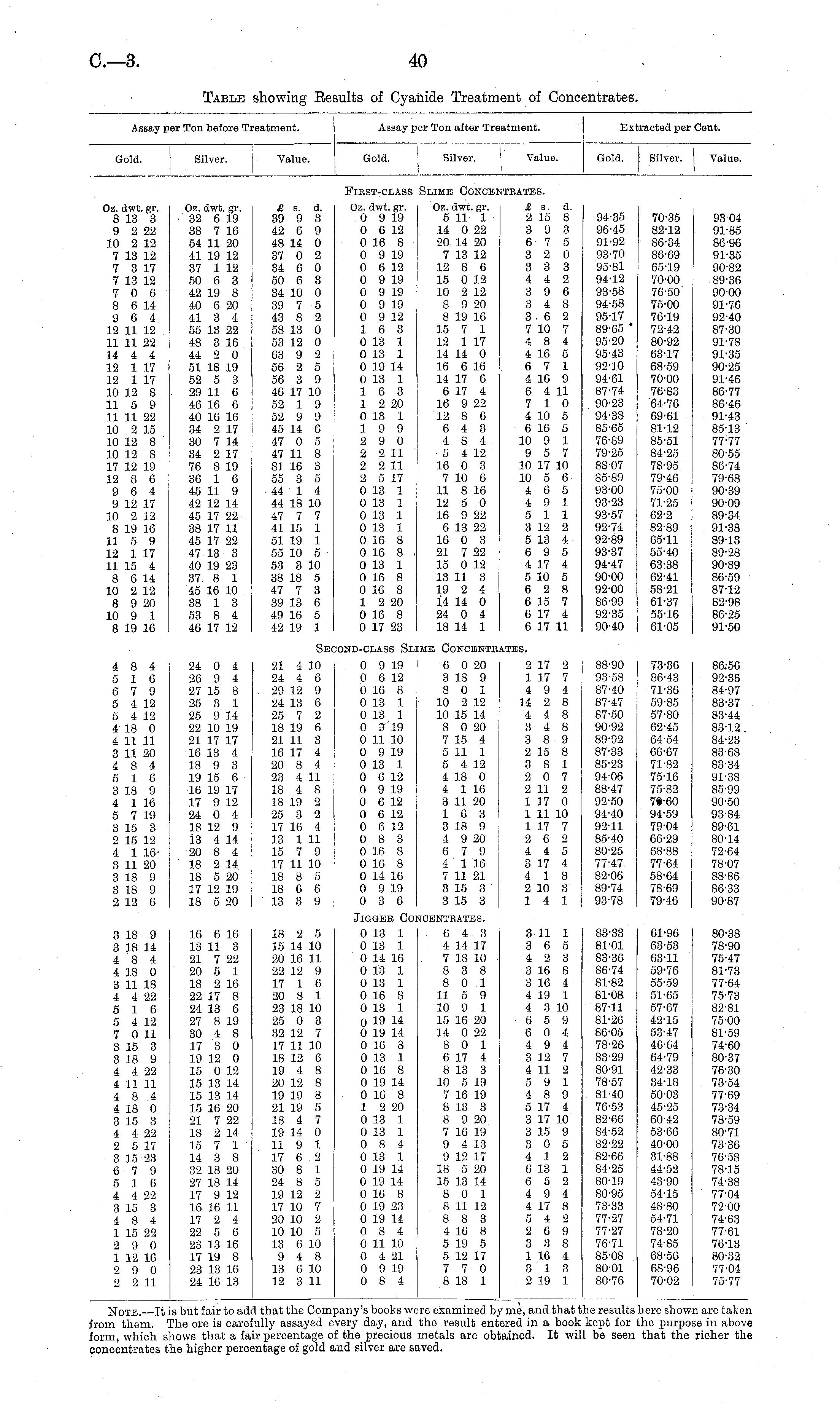 Assay per Ton before Treatment. Assay per Ton after Treatment. Extracted per Cent. Gold. Silver. Value. Gold. I Silver. Value. Gold. Silver, i I Value. FlBST-CLASS Slime Concbs URATES. Oz. dwt. gr. 8 13 3 9 2 22 10 2 12 7 13 12 7 3 17 7 13 12 7 0 6 8 6 14 9 6 4 12 11 12 11 11 22 14 4 4 12 1 17 12 1 17 10 12 8 11 5 9 11 11 22 10 2 15 10 12 8 10 12 8 17 12 19 12 8 6 9 6 4 9 12 17 10 2 12 8 19 16 11 5 9 12 1 17 11 15 4 8 6 14 10 2 12 8 9 20 10 9 1 8 19 16 Oz. dwt. gr. 32 6 19 38 7 16 54 11 20 41 19 12 37 1 12 50 6 3 42 19 8 40 6 20 41 3 4 55 13 22 48 3 16 44 2 0 51 18 19 52 5 3 29 11 6 46 16 6 40 16 16 34 2 17 30 7 14 34 2 17 76 8 19 36 1 6 45 11 9 42 12 14 45 17 22 38 17 11 45 17 22 47 13 3 40 19 23 37 8 1 45 16 10 38 1 3 53 8 4 46 17 12 £ s. d. 39 9 3 42 6 9 48 14 0 37 0 2 34 6 0 50 6 3 34 10 0 39 7 5 43 8 2 58 13 0 53 12 0 63 9 2 56 2 5 56 3 9 46 17 10 52 1 9 52 9 9 45 14 6 47 0 5 47 11 8 81 16 3 55 3 5 44 1 4 44 18 10 47 7 7 41 15 1 51 19 1 55 10 5 53 3 10 38 18 5 47 7 3 39 13 6 49 16 5 42 19 1 Oz. dwt. gr. 0 9 19 0 6 12 0 16 8 0 9 19 0 6 12 0 9 19 0 9 19 0 9 19 0 9 12 16 3 0 13 1 0 13 1 0 19 14 0 13 1 16 3 1 2 20 0 13 1 19 9 2 9 0 2 2 11 2 2 11 2 5 17 0 13 1 0 13 1 0 13 1 0 13 1 0 16 8 0 16 8 0 13 1 0 16 8 0 16 8 1 2 20 0 16 8 0 17 23 Oz. dwt. gr. 5 11 1 14 0 22 20 14 20 7 13 12 12 8 6 15 0 12 10 2 12 8 9 20 8 19 16 15 7 1 12 1 17 14 14 0 16 6 16 14 17 6 6 17 4 16 9 22 12 8 6 6 4 3 4 8 4 5 4 12 16 0 3 7 10 6 11 8 16 12 5 0 16 9 22 6 13 22 16 0 3 21 7 22 15 0 12 13 11 3 19 2 4 14 14 0 24 0 4 18 14 1 £ s. A. 2 15 8 3 9 3 6 7 5 3 2 0 3 3 3 4 4 2 3 9 6 3 4 8 3.6 2 7 10 7 4 8 4 4 16 5 6 7 1 4 16 9 6 4 11 7 10 4 10 5 6 16 5 10 9 1 9 5 7 10 17 10 10 5 6 4 6 5 4 9 1 5 11 3 12 2 5 13 4 6 9 5 4 17 4 5 10 5 6 2 8 6 15 7 6 17 4 6 17 11 94-35 96-45 91-92 93-70 95-81 94-12 93-58 94-58 95-17 89-65 • 95-20 95-43 92-10 94-61 87-74 90-23 94-38 85-65 76-89 79-25 88-07 85-89 93-00 93-23 93-57 92-74 92-89 93-37 94-47 90-00 92-00 86-99 92-35 90-40 70-35 82-12 86-34 86-69 65-19 70-00 76-50 75-00 76-19 72-42 80-92 63-17 68-59 70-00 76-83 64-76 69-61 81-12 85-51 84-25 78-95 79'46 75-00 71-25 62-2 82-89 65-11 55-40 63-38 62-41 58-21 61-37 55-16 61-05 9304 91-85 86-96 91-35 90-82 89-36 9000 91-76 92-40 87-30 91-78 91-35 90-25 91-46 86-77 86-46 91-43 85-13 77 : 77 80-55 86-74 79-68 90-39 90-09 89-34 91-38 89-13 89-28 90-89 86-59 87-12 82-98 86-25 91-50 Sbi !OND-OLASS Su [ME CONCENTE. iTES. 88-90 93-58 87-40 87-47 87-50 9092 89-92 87-33 85-23 94-06 88-47 92-50 94-40 92-11 85-40 80-25 77-47 82-06 89-74 93-78 73-36 86-43 71-36 59-85 57-80 62-45 64-54 66-67 71-82 75-16 75-82 79-60 94-59 79-04 66-29 68-88 77-64 58-64 78-69 79-46 86;56 92-36 84-97 83-37 83-44 83-12 . 84-23 83-68 83-34 91-38 85-99 90-50 93-84 89-61 80-14 72-64 78-07 88-86 86-33 90-87 4 8 4 5 16 6 7 9 5 4 12 5 4 12 4 18 0 4 11 11 3 11 20 4 8 4 5 16 3 18 9 4 1 16 5 7 19 3 15 3 2 15 12 4 1 163 11 20 3 18 9 3 18 9 2 12 6 24 0 4 26 9 4 27 15 8 25 3 1 25 9 14 22 10 19 21 17 17 16 13 4 18 9 3 19 15 6 16 19 17 17 9 12 24 0 4 18 12 9 13 4 14 20 8 4 18 2 14 18 5 20 17 12 19 18 5 20 21 4 10 24 4 C 29 12 9 24 13 6 25 7 2 18 19 6 21 11 3 16 17 4 20 8 4 23 4 11 18 4 8 18 19 2 25 3 2 17 16 4 13 1 11 15 7 9 17 11 10 18 8 5 18 6 6 13 3 9 0 9 19 0 6 12 0 16 8 0 13 1 0 13 1 0 9 19 0 11 10 0 9 19 0 13 1 0 6 12 0 9 19 0 6 12 i 0 6 12 0 6 12 I 0 8 3 0 16 8 0 16 8 0 14 16 0 9 19 0 3 6 6 0 20 3 18 9 8 0 1 10 2 12 10 15 14 8 0 20 7 15 4 5 11 1 5 4 12 4 18 0 4 1 16 3 11 20 16 8 3 18 9 4 9 20 6 7 9 4 1 16 7 11 21 3 15 3 3 15 3 2 17 2 1 17 7 4 9 4 14 2 8 4 4 8 3 4 8 3 8 9 2 15 8 3 8 1 2 0 7 2 11 2 1 17 0 1 11 10 1 17 7 2 6 2 4 4 5 3 17 4 4 18 2 10 3 14 1 JlGGEB GO] SCENTBATES. 3 11 1 3 0 5 4 2 3 3 16 8 3 1C 4 4 19 1 4 3 10 6 5 9 6 0 4 4 9 4 3 12 7 4 11 2 5 9 1 4 8 9 5 17 4 3 17 10 3 15 9 3 0 5 4 12 6 13 1 6 5 2 4 9 4 4 17 8 5 4 2 2 6 9 3 3 8 1 16 4 3 13 2 19 1 83-33 81-01 83-36 86-74 81-82 81-08 87-11 81-26 86-05 78-26 83-29 80-91 78-57 81-40 76-53 82-66 84-52 82-22 82-66 84-25 80-19 80-95 73-33 77-27 77-27 76-71 85-08 80-01 80-76 61-96 63-53 63-11 59-76 55-59 51-65 57-67 42-15 53-47 46-64 64-79 42-33 34-18 50-03 45-25 60-42 53-66 40-00 31-88 44-52 43-90 54-15 48-80 54-71 78-20 74-85 68-56 68-96 70-02 3 18 9 3 18 14 4 8 4 4 18 0 3 11 18 4 4 22 5 16 5 4 12 7 0 11 3 15 3 3 18 9 4 4 22 4 11 11 4 8 4 4 18 0 3 15 8 4 4 22 2 5 17 3 15 23 6 7 9 5 16 4 4 22 3 15 3 4 8 4 1 15 22 2 9 0 1 12 16 2 9 0 2 2 11 16 6 16 13 11 3 21 7 22 20 5 1 18 2 16 22 17 8 24 13 6 27 8 19 30 4 8 17 3 0 19 12 0 15 0 12 15 13 14 15 13 14 15 16 20 21 7 22 18 2 14 15 7 1 14 3 8 32 18 20 27 18 14 17 9 12 16 16 11 17 2 4 22 5 6 23 13 16 17 19 8 23 13 16 24 16 13 18 2 5 15 14 10 20 16 11 22 12 9 17 1 6 20 8 1 23 18 10 25 0 3 32 12 7 17 11 10 18 12 G 19 4 8 20 12 8 19 19 8 21 19 5 18 4 7 19 14 0 11 9 1 17 6 2 30 8 1 24 8 5 19 12 2 17 10 7 20 10 2 10 10 5 13 0 10 9 4 8 13 6 10 12 3 11 0 13 1 0 13 1 0 14 16 0 13 1 0 13 1 0 16 8 0 13 1 0 19 14 0 19 14 0 16 8 0 13 1 0 16 8 0 19 14 0 16 8 1 2 20 0 13 1 0 13 1 0 8 4 0 13 1 0 19 14 0 19 14 0 16 8 0 19 23 0 19 14 0 8 4 0 11 10 0 4 21 0 9 19 0 8 4 6 4 3 4 14 17 7 18 10 8 3 8 8 0 1 11 5 9 10 9 1 15 16 20 14 0 22 8 0 1 6 17 4 8 13 3 10 5 19 7 16 19 8 13 3 8 9 20 7 16 19 9 4 13 9 12 17 18 5 20 15 13 14 8 0 1 8 11 12 8 8 3 4 1C 8 5 19 5 5 12 17 7 7 0 8 18 1 80-38 78-90 75-47 81-73 77-64 75-73 82-81 75-00 81-59 74-60 80-37 76-30 73-54 77-69 73-34 78-59 80-71 73-36 76-58 78-15 74-38 77-04 72-00 74-63 77-61 76-13 80-32 77-04 75-77