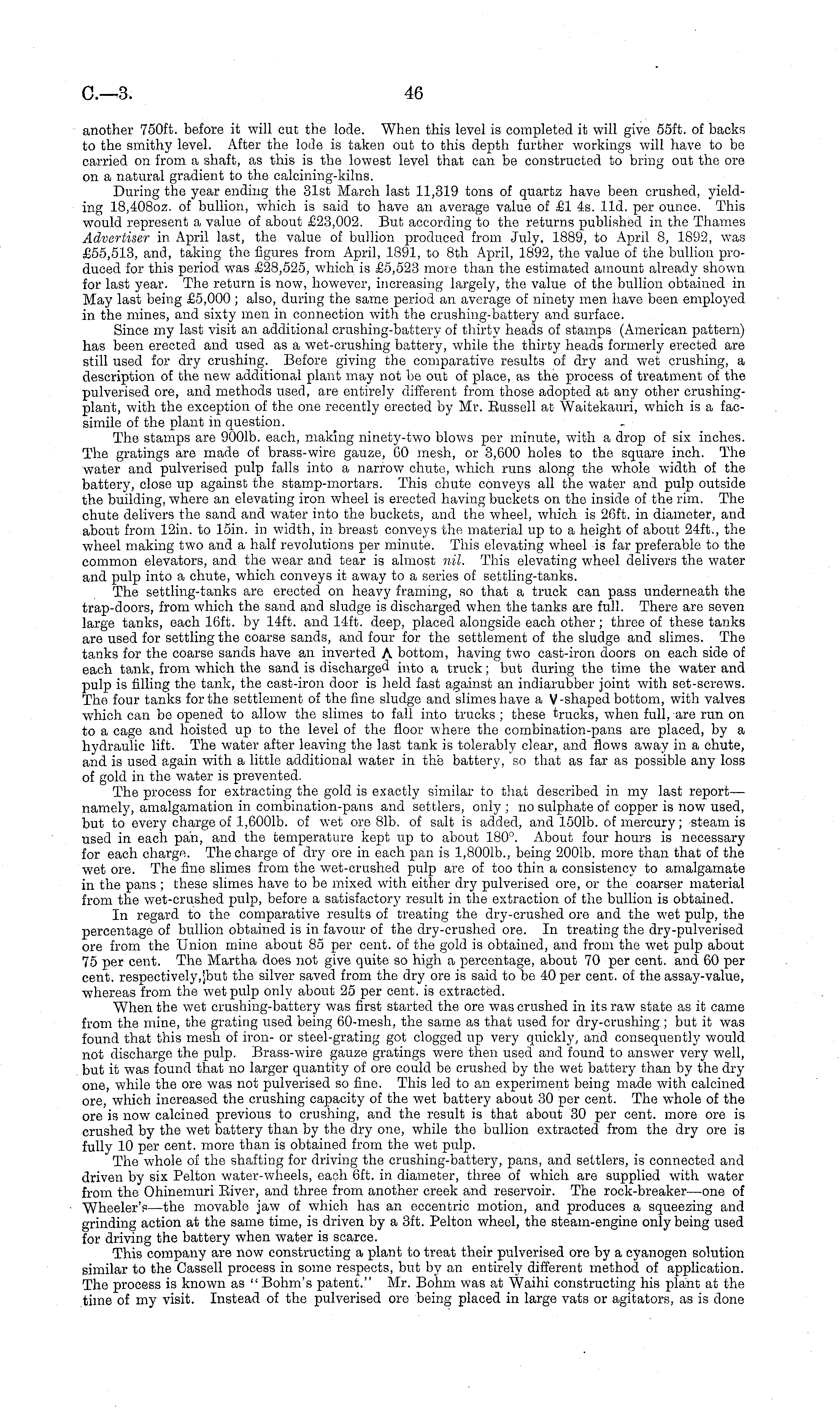 another 750 ft. before it will cut the lode. When this level is completed it will give 55ft. of backs to the smithy level. After the lode is taken out to this depth further workings will have to bo carried on from a shaft, as this is the lowest level that can be constructed to bring out the ore on a natural gradient to the calcining-kilns. During the year ending the 31st March last 11,319 tons of quartz have been crushed, yielding 18,4080z. of bullion, which is said to have an average value of £1 4s. lid. per ounce. This would represent a value of about £23,002. But according to the returns published in the Thames Advertiser in April last, the value of bullion produced from July, 1889, to April 8, 1892, was £55,513, and, taking the figures from April, 1891, to Bth April, 1892, the value of the bullion produced for this period, was £28,525, which is £5,523 more than the estimated amount already shown for last year. The return is now, however, increasing largely, the value of the bullion obtained in May last being £5,000 ; also, during the same period an average of ninety men have been employed in the mines, and sixty men in connection with the crushing-battery and surface. Since my last visit an additional crushing-battery of thirty heads of stamps (American pattern) has been erected and used as a wet-crushing battery, while the thirty heads formerly erected are still used for dry crushing. Before giving the comparative results of dry and wet crushing, a description of the new additional plant may not be out of place, as the process of treatment of the pulverised ore, and methods used, are entirely different from those adopted at any other crushingplant, with the exception of the one recently erected by Mr. Eussell at Waitekauri, which is a facsimile of the plant in question. The stamps are 9001b. each, making ninety-two blows per minute, with a drop of six inches. The gratings are made of brass-wire gauze, 60 mesh, or 3,600 holes to the square inch. The water and pulverised pulp falls into a narrow chute, which runs along the whole width of the battery, close up against the stamp-mortars. This chute conveys all the water and pulp outside the building, where an elevating iron wheel is erected having buckets on the inside of the rim. The chute delivers the sand and water into the buckets, and the wheel, which is 26ft. in diameter, and about from 12in. to loin, in width, in breast conveys the material up to a height of about 24ft., the wheel making two and a half revolutions per minute. This elevating wheel is far preferable to the common elevators, and the wear and tear is almost nil. This elevating wheel delivers the water and pulp into a chute, which conveys it away to a series of settling-tanks. The settling-tanks are erected on heavy framing, so that a truck can pass underneath the trap-doors, from which the sand and sludge is discharged when the tanks are full. There are seven large tanks, each 16ft. by 14ft. and 14ft. deep, placed alongside each other; three of these tanks are used for settling the coarse sands, and four for the settlement of the sludge and slimes. The tanks for the coarse sands have an inverted A bottom, having two cast-iron doors on each side of each tank, from which the sand is discharged into a truck; but during the time the water and pulp is filling the tank, the cast-iron door is held fast against an indiarubber joint with set-screws. The four tanks for the settlement of the fine sludge and slimes have a V-shaped bottom, with valves which can be opened to allow the slimes to fall into trucks ; these trucks, when full, are run on to a cage and hoisted up to the level of the floor where the combination-pans are placed, by a hydraulic lift. The water after leaving the last tank is tolerably clear, and flows away in a chute, and is used again with a little additional water in the battery, so that as far as possible any loss of gold in the water is prevented. The process for extracting the gold is exactly similar to that described in my last report— namely, amalgamation in combination-pans and settlers, only ; no sulphate of copper is now used, but to every charge of 1,6001b. of wet ore 81b. of salt is added, and 1501b. of mercury; steam is used in each pah, and the temperature kept up to about 180°. About four hours is necessary for each charge. The charge of dry ore in each pan is 1,8001b., being 2001b. more than that of the wet ore. The fine slimes from the wet-crushed pulp are of too thin a consistency to amalgamate in the pans ; these slimes have to be mixed with either dry pulverised ore, or the coarser material from the wet-crushed pulp, before a satisfactory result in the extraction of the bullion is obtained. In regard to the comparative results of treating the dry-crushed ore and the wet pulp, the percentage of bullion obtained is in favour of the dry-crushed ore. In treating the dry-pulverised ore from the Union mine about 85 per cent, of the gold is obtained, and from the wet pulp about 75 per cent. The Martha does not give quite so high a percentage, about 70 per cent, and 60 per cent, respectively,)but the silver saved from the dry ore is said to be 40 per cent, of the assay-value, whereas from the wet pulp only about 25 per cent, is extracted. When the wet crushing-battery was first started the ore was crushed in its raw state as it came from the mine, the grating used being 60-mesh, the same as that used for dry-crushing ; but it was found that this mesh of iron- or steel-grating got clogged up very quickly, and consequently would not discharge the pulp. Brass-wire gauze gratings were then used and found to answer very well, but it was found that no larger quantity of ore could be crushed by the wet battery than by the dry one, while the ore was not pulverised so fine. This led to an experiment being made with calcined ore, which increased the crushing capacity of the wet battery about 30 per cent. The whole of the ore is now calcined previo