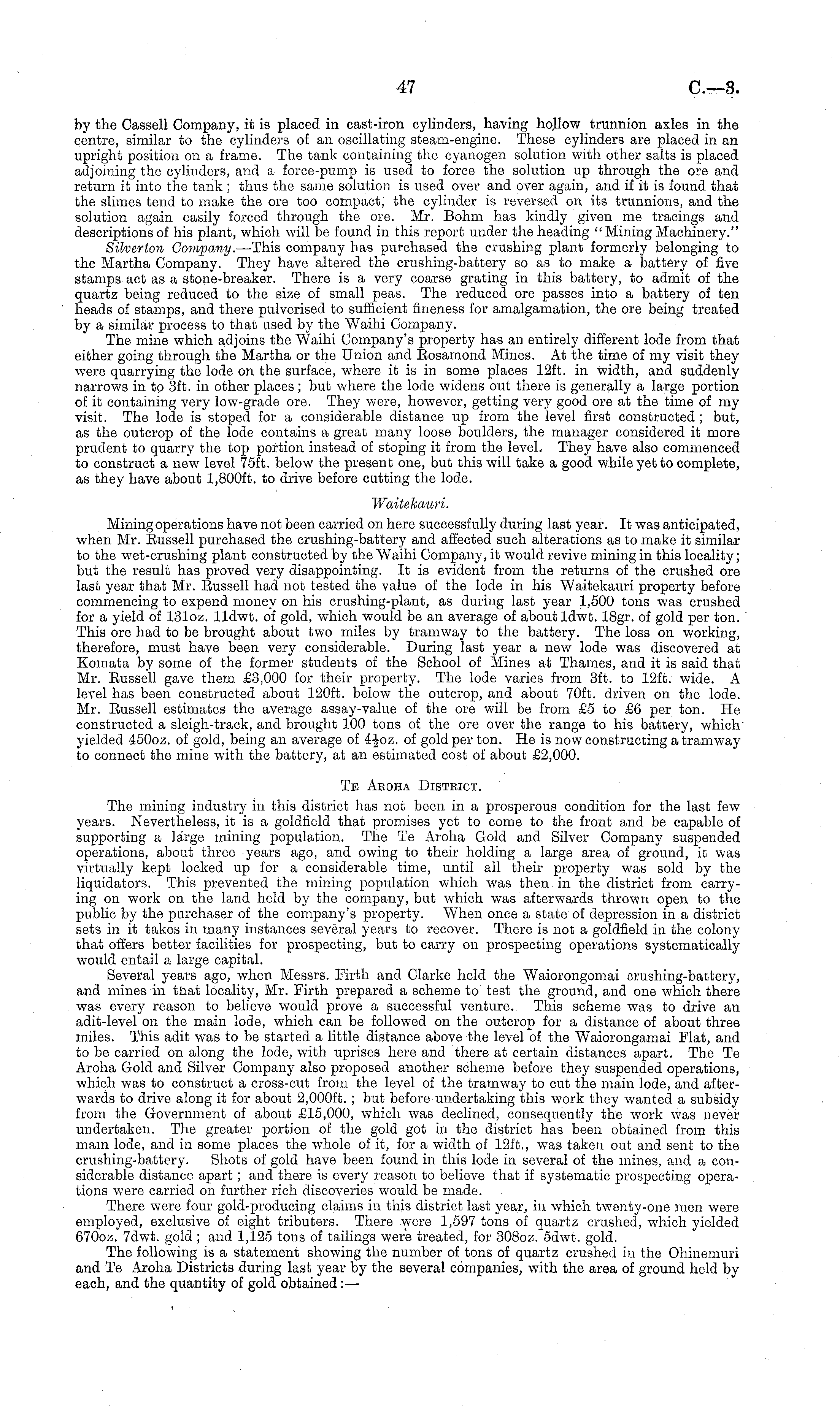 by the Cassell Company, it is placed in cast-iron cylinders, having hollow trunnion axles in the centre, similar to the cylinders of an oscillating steam-engine. These cylinders are placed in an upright position on a frame. The tank containing the cyanogen solution with other salts is placed adjoining the cylinders, and a force-pump is used to force the solution up through the ore and return it into the tank ; thus the same solution is used over and over again, and if it is found that the slimes tend to make the ore too compact, the cylinder is reversed on its trunnions, and the solution again easily forced through the ore. Mr. Bohm has kindly given me tracings and descriptions of his plant, which will be found in this report under the heading " Mining Machinery." Silverton Company. —This company has purchased the crushing plant formerly belonging to the Martha Company. They have altered the crushing-battery so as to make a battery of five stamps act as a stone-breaker. There is a very coarse grating in this battery, to admit of the quartz being reduced to the size of small peas. The reduced ore passes into a battery of ten heads of stamps, and there pulverised to sufficient fineness for amalgamation, the ore being treated by a similar process to that used by the Waihi Company. The mine which adjoins the Waihi Company's property has an entirely different lode from that either going through the Martha or the Union and Eosamond Mines. At the time of my visit they were quarrying the lode on the surface, where it is in some places 12ft. in width, and suddenly narrows in to 3ft. in other places; but where the lode widens out there is generally a large portion of it containing very low-grade ore. They were, however, getting very good ore at the time of my visit. The lode is stoped for a considerable distance up from the level first constructed ; but, as the outcrop of the lode contains a great many loose boulders, the manager considered it more prudent to quarry the top portion instead of stoping it from the level. They have also commenced to construct a new level 75ft. below the present one, but this will take a good while yet to complete, as they have about I,Booft. to drive before cutting the lode. Waitekauri. Mining operations have not been carried on here successfully during last year. It was anticipated, when Mr. Eussell purchased the crushing-battery and affected such alterations as to make it similar to the wet-crushing plant constructed by the Waihi Company, it would revive mining in this locality; but the result has proved very disappointing. It is evident from the returns of the crushed ore last year that Mr. Eussell had not tested the value of the lode in his Waitekauri property before commencing to expend money on his crushing-plant, as during last year 1,500 tons was crushed for a yield of 131oz. lldwt. of gold, which would be an average of about Idwt. 18gr. of gold per ton. This ore had to be brought about two miles by tramway to the battery. The loss on working, therefore, must have been very considerable. During last year a new lode was discovered at Komata by some of the former students of the School of Mines at Thames, and it is said that Mr. Eussell gave them £3,000 for their property. The lode varies from 3ft. to 12ft. wide. A level has been constructed about 120 ft. below the outcrop, and about 70ft. driven on the lode. Mr. Eussell estimates the average assay-value of the ore will be from £5 to £6 per ton. He constructed a sleigh-track, and brought 100 tons of the ore over the range to his battery, which yielded 4500z. of gold, being an average of 4-Joz. of gold per ton. He is now constructing a tramway to connect the mine with the battery, at an estimated cost of about £2,000. Te Aroha District. The mining industry in this district has not been in a prosperous condition for the last few years. Nevertheless, it is a goldfield that promises yet to come to the front and be capable of supporting a large mining population. The Te Aroha Gold and Silver Company suspended operations, about three years ago, and owing to their holding a large area of ground, it was virtually kept locked up for a considerable time, until all their property was sold by the liquidators. This prevented the mining population which was then in the district from carrying on work on the land held by the company, but which was afterwards thrown open to the public by the purchaser of the company's property. When once a state of depression in a district sets in it takes in many instances several years to recover. There is not a goldfield in the colony that offers better facilities for prospecting, but to carry on prospecting operations systematically would entail a large capital. Several years ago, when Messrs. Firth and Clarke held the Waiorongomai crushing-battery, and mines in that locality, Mr. Firth prepared a scheme to test the ground, and one which there was every reason to believe would prove a successful venture. This scheme was to drive an adit-level on the main lode, which can be followed on the outcrop for a distance of about three miles. This adit was to be started a little distance above the level of the Waiorongamai Flat, and to be carried on along the lode, with uprises here and there at certain distances apart. The Te Aroha Gold and Silver Company also proposed another scheme before they suspended operations, which was to construct a cross-cut from the level of the tramway to cut the main lode, and afterwards to drive along it for about 2,000 ft. ; but before undertaking this work they wanted a subsidy from the Government of about £15,000, which was declined, consequently the work was never undertaken. The greater portion of the gold got in the district has been obtained from this mam lode, and in some places the whole of it, for a width of 12ft., w r as taken out and sent to the crushing-battery. Shots of gold have been found in this lode in several of the mines, and a considerable d