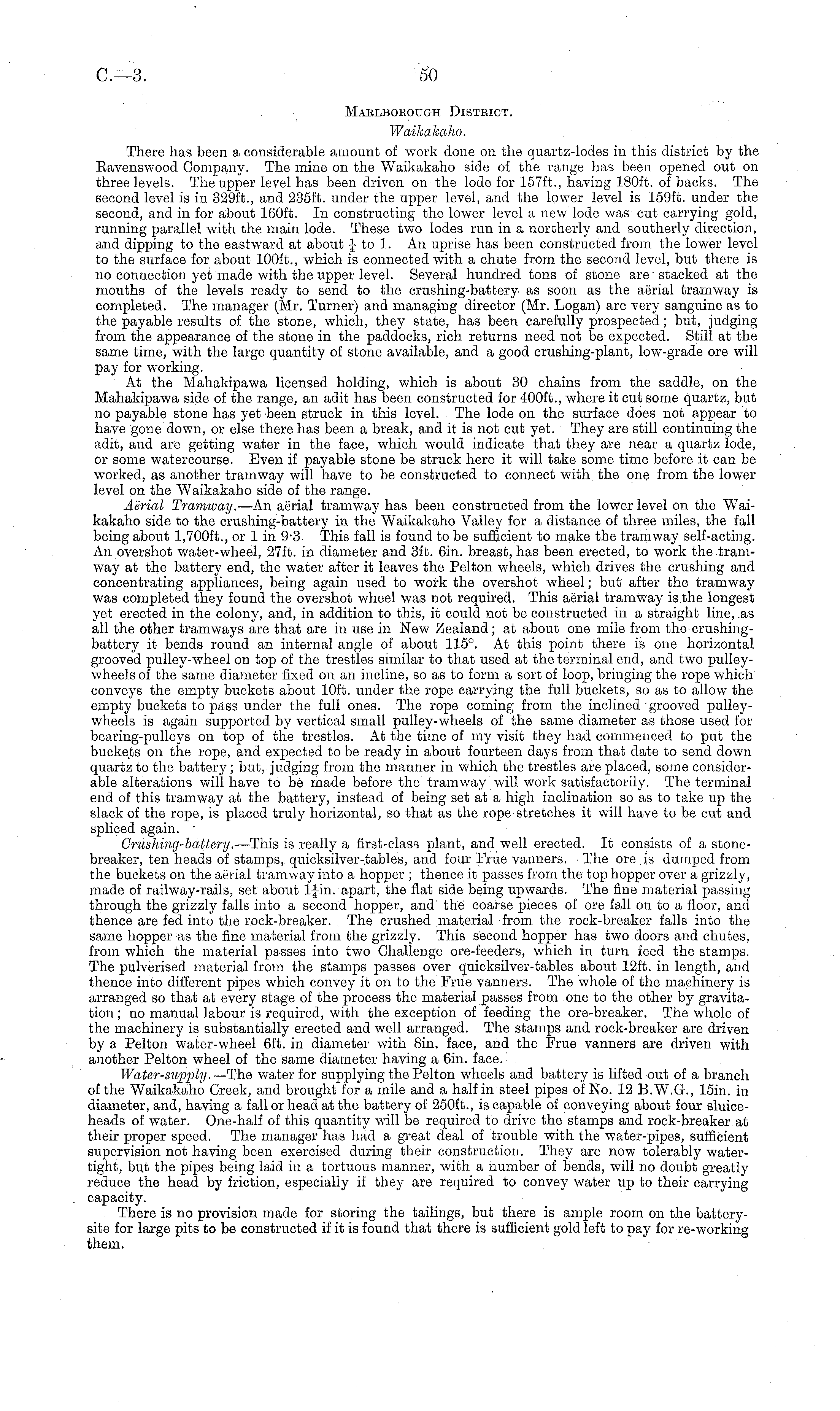 Mablboeough Disteict. Waikakaho. There has been a considerable amount of work done on the quartz-lodes in this district by the Eavenswood Company. The mine on the Waikakaho side of the range has been opened out on three levels. The upper level has been driven on the lode for 157 ft., having 180 ft. of backs. The second level is in 329 ft., and 235 ft. under the upper level, and the lower level is 159 ft. under the second, and in for about 160 ft. In constructing the lower level a new lode was cut carrying gold, running parallel with the main lode. These two lodes run in a northerly and southerly direction, and dipping to the eastward at about Jto 1. An uprise has been constructed from the lower level to the surface for about 100 ft., which is connected with a chute from the second level, but there is no connection yet made with the upper level. Several hundred tons of stone are stacked at the mouths of the levels ready to send to the crushing-battery as soon as the aerial tramway is completed. The manager (Mr. Turner) and managing director (Mr. Logan) are very sanguine as to the payable results of the stone, which, they state, has been carefully prospected; but, judging from the appearance of the stone in the paddocks, rich returns need not be expected. Still at the same time, with the large quantity of stone available, and a good crushing-plant, low 7 -grade ore will pay for working. At the Mahakipawa licensed holding, which is about 30 chains from the saddle, on the Mahakipawa side of the range, an adit has been constructed for 400 ft., where it cut some quartz, but no payable stone has yet been struck in this level. The lode on the surface does not appear to have gone down, or else there has been a break, and it is not cut yet. They are still continuing the adit, and are getting water in the face, which would indicate that they are near a quartz lode, or some watercourse. Even if payable stone be struck here it will take some time before it can be worked, as another tramway will have to be constructed to connect with the one from the lower level on the Waikakaho side of the range. Aerial Tramway. —An aerial tramway has been constructed from the low 7 er level on the Waikakaho side to the crushing-battery in the Waikakaho Valley for a distance of three miles, the fall being about 1,700 ft., or lin 9-3. This fall is found to be sufficient to make the tramway self-acting. An overshot water-wheel, 27ft. in diameter and 3ft. 6in. breast, has been erected, to work the tramway at the battery end, the water after it leaves the Pelton wheels, which drives the crushing and concentrating appliances, being again used to work the overshot wheel; but after the tramway was completed they found the overshot wheel was not required. This aerial tramway is the longest yet erected in the colony, and, in addition to this, it could not be constructed in a straight line, .as all the other tramways are that are in use in New Zealand; at about one mile from the crushingbattery it bends round an internal angle of about 115°. At this point there is one horizontal grooved pulley-wheel on top of the trestles similar to that used at the terminal end, and two pulleywheels of the same diameter fixed on an incline, so as to form a sort of loop, bringing the rope which conveys the empty buckets about 10ft. under the rope carrying the full buckets, so as to allow the empty buckets to pass under the full ones. The rope coming from the inclined grooved pulleywheels is again supported by vertical small pulley-wheels of the same diameter as those used for bearing-pulleys on top of the trestles. At the time of my visit they had commenced to put the buckets on the rope, and expected to be ready in about fourteen days from that date to send down quartz to the battery ; but, judging from the manner in which the trestles are placed, some considerable alterations will have to be made before the tramway will work satisfactorily. The terminal end of this tramway at the battery, instead of being set at a high inclination so as to take up the slack of the rope, is placed truly horizontal, so that as the rope stretches it will have to be cut and spliced again. - Crushing-battery. —This is really a first-class plant, and well erected. It consists of a stonebreaker, ten heads of stamps, quicksilver-tables, and four True vanners. The ore is dumped from the buckets on the aerial tramway into a hopper ; thence it passes from the top hopper over a grizzly, made of railway-rails, set about l|-in. apart, the flat side being upwards. The fine material passing through the grizzly falls into a second hopper, and the coarse pieces of ore fall on to a floor, and thence are fed into the rock-breaker. The crushed material from the rock-breaker falls into the same hopper as the fine material from the grizzly. This second hopper has two doors and chutes, from which the material passes into two Challenge ore-feeders, which in turn feed the stamps. The pulverised material from the stamps passes over quicksilver-tables about 12ft. in length, and thence into different pipes which convey it on to the Frue vanners. The whole of the machinery is arranged so that at every stage of the process the material passes from one to the other by gravitation ; no manual labour is required, with the exception of feeding the ore-breaker. The whole of the machinery is substantially erected and well arranged. The stamps and rock-breaker are driven by a Pelton water-wheel 6ft. in diameter with Bin. face, and the Prue vanners are driven with another Pelton wheel of the same diameter having a 6in. face. Water-supply.— The water for supplying the Pelton wheels and battery is lifted out of a branch of the Waikakaho Creek, and brought for a mile and a half in steel pipes of No. 12 8.W.G., 15in. in diameter, and, having a fall or head at the battery of 250 ft., is capable of conveying about four sluiceheads of water. One-half of this quantity will be required to drive the