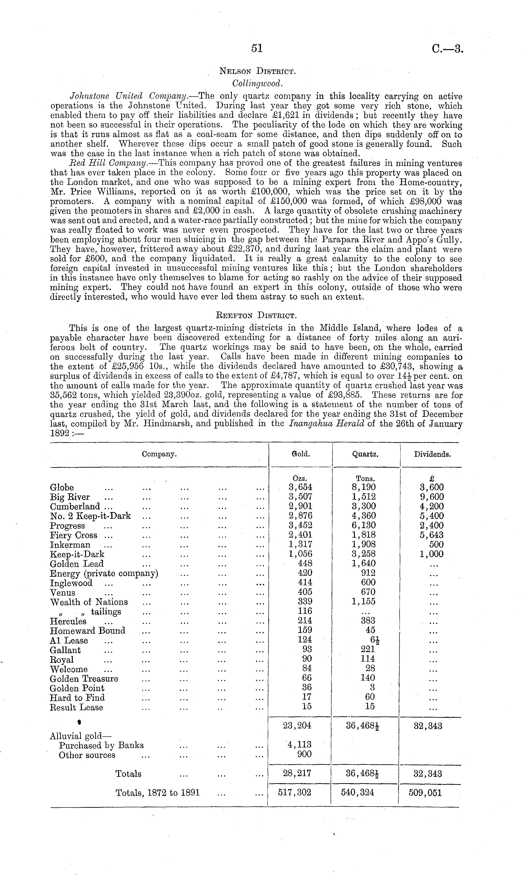 Nelson Disteiot. Collingwood. Johnstone United Company. —The only quartz company in this locality carrying on active operations is the Johnstone United. During last year they got some very rich stone, which enabled them to pay off their liabilities and declare £1,621 in dividends ; but recently they have not been so successful in their operations. The peculiarity of the lode on which they are working is that it runs almost as flat as a coal-seam for some distance, and then dips suddenly off on to another shelf. Wherever these dips occur a small patch of good stone is generally found. Such was the case in the last instance when a rich patch of stone was obtained. Red Hill Company. —This company has proved one of the greatest failures in mining ventures that has ever taken place in the colony. Some four or five years ago this property was placed on the London market, and one who was supposed to be a mining expert from the Home-country, Mr. Price Williams, reported on it as worth £100,000, which was the price set on it by the promoters. A company with a nominal capital of £150,000 was formed, of which £98,000 was given the promoters in shares and £2,000 in cash. A large quantity of obsolete crushing machinery was sent out and erected, and a water-race partially constructed; but the mine for which the company was really floated to work was never even prospected. They have for the last two or three years been employing about four men sluicing in the gap between the Parapara Eiver and Appo's Gully. They have, however, frittered away about £22,370, and during last year the claim and plant were sold for £600, and the company liquidated. It is really a great calamity to the colony to see foreign capital invested in unsuccessful mining ventures like this ; but the London shareholders in this instance have only themselves to blame for acting so rashly on the advice of their supposed mining expert. They could not have found an expert in this colony, outside of those who were directly interested, who would have ever led them astray to such an extent. Eeefton Disteict. This is one of the largest quartz-mining districts in the Middle Island, where lodes of a payable character have been discovered extending for a distance of forty miles along an auriferous belt of country. The quartz workings may be said to have been, on the whole, carried on successfully during the last year. Calls have been made in different mining companies to the extent of £25,956 10s., while the dividends declared have amounted to £30,743, snowing a surplus of dividends in excess of calls to the extent of £4,787, which is equal to over 14-|per cent, on the amount of calls made for the year. The approximate quantity of quartz crushed last year was 35,562 tons, which yielded 23,3900z. gold, representing a value of £93,885. These returns are for the year ending the 31st March last, and the following is a statement of the number of tons of quartz crushed, the yield of gold, and dividends declared for the year ending the 31st of December last, compiled by Mr. Hindmarsh, and published in the Inangahua Herald of the 26th of January 1892 :—