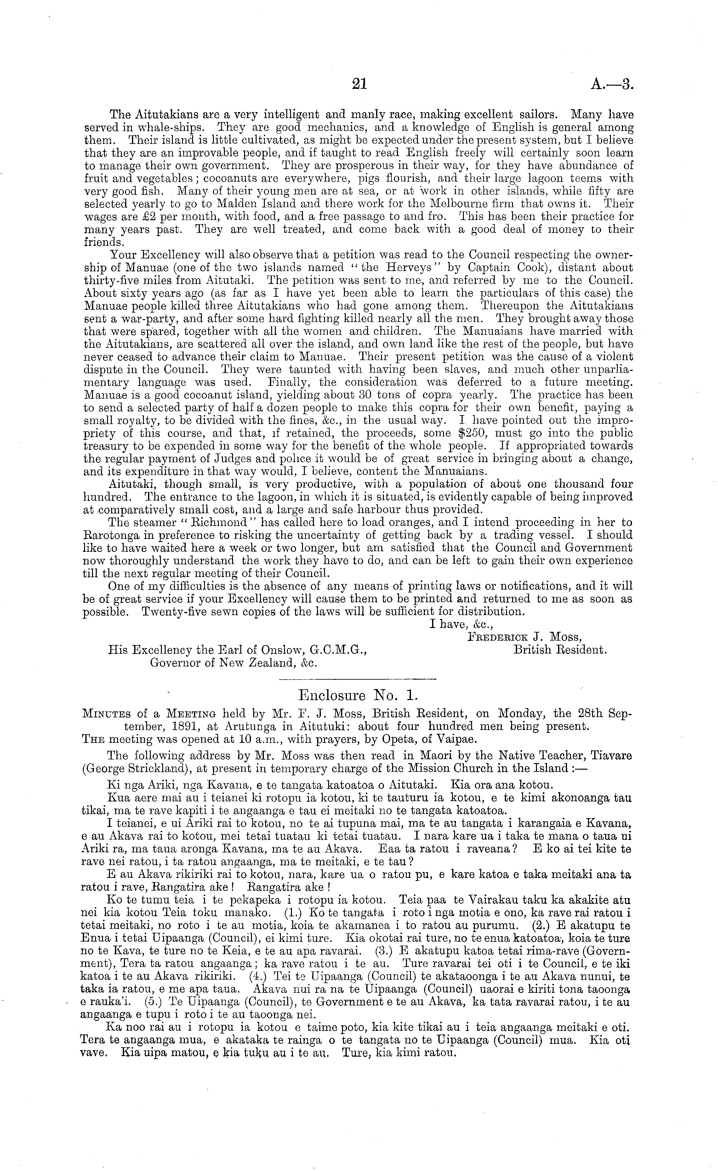 Enclosure No. 1. Minutes of a Meeting held by Mr. F. J. Moss, British Eesident, on Monday, the 28th September, 1891, at Arutunga in Aitutuki: about four hundred men being present. The meeting was opened at 10 a.m., with prayers, by Opeta, of Vaipae. The following address by Mr. Moss was then read in Maori by the Native Teacher, Tiavare (George Strickland), at present in temporary charge of the Mission Church in the Island : — Xi nga Ariki, nga Kavana, etc tangata katoatoa o Aitutaki. Kia ora ana kotou. Kua acre mai au i teianei ki rotopu ia kotou, kite tauturu ia kotou, c te kimi akonoanga tau tikai, ma te rave kapiti i te angaanga c tau ci meitaki no te tangata katoatoa. I teianei, c vi Ariki rai to kotou, no te ai tupuna mai, ma te au tangata i karangaia c Kavana, eau Akava rai to kotou, mci tetai tuatau ki tetai tuatau. I nara kare ua i taka te mana o taua vi Ariki ra, ma taua aronga Kavana, ma te au Akava. Eaa ta ratou i raveana? Eko ai tei kite te rave nei ratou, i ta ratou angaanga, ma te meitaki, c te tau ? E au Akava rikiriki rai to kotou, nara, kare ua o ratou pu, c kare katoa c taka meitaki ana ta ratou i rave, Eangatira ake ! Eangatira ake ! Ko te tumu teia i te pekapeka i rotopu ia kotou. Teia paa te Vairakau taku ka akakite atu nei kia kotou Teia toku manako. (1.) Ko te tangata i roto i nga motia c ono, ka rave rai ratou i tetai meitaki, no roto i te au motia, koia te akamanea ito ratou au purumu. (2.) E akatupu te Enua i tetai Uipaanga (Council), ci kimi ture. Kia okotai rai ture, no te enua katoatoa, koia te ture no te Kava, te ture no te Keia, etc au apa ravarai. (3.) E akatupu katoa tetai rima-rave (Government), Tera ta ratou angaanga; ka rave ratou i te au. Ture ravarai tei oti ite Council, etc iki katoa ite au Akava rikiriki. (4.) Tei te Uipaanga (Council) te akataoonga ite au Akava nunui, te taka ia ratou, cmc apa taua. Akava nui ra na te Uipaanga (Council) uaorai c kiriti tona taoonga c rauka'i. (5.) Te Uipaanga (Council), te Government etc au Akava, ka tata ravarai ratou, ite au angaanga c tupu i roto i te au taoonga nei. Ka noo rai au i rotopu ia kotou c taime poto, kia kite tikai au i teia angaanga meitaki c oti. Tera te angaanga mua, c akataka te rainga o te tangata no te Uipaanga (Council) mua. Kia oti vave. Kia uipa matou, c kia tuku au ite au, Ture, kia kimi ratou.