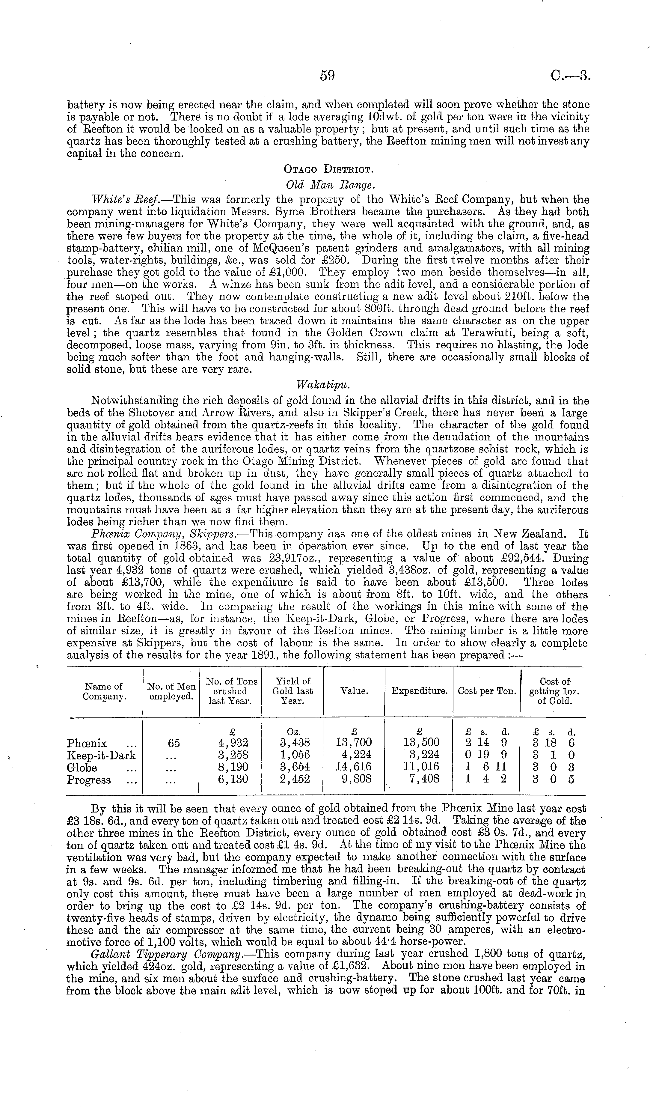 battery is now being erected near the claim, and when completed will soon prove whether the stone is payable or not. There is no doubt if a lode averaging lOdwt. of gold per ton were in the vicinity of Eeefton it would be looked on as a valuable property; but at present, and until such time as the quartz has been thoroughly tested at a crushing battery, the Eeefton mining men will not invest any capital in the concern. Otago Disteict. Old Man Range. White's Reef. —This was formerly the property of the White's Eeef Company, but when the company went into liquidation Messrs. Syme Brothers became the purchasers. As they had both been mining-managers for White's Company, they were well acquainted with the ground, and, as there were few buyers for the property at the time, the whole of it, including the claim, a five-head stamp-battery, Chilian mill, one of McQueen's patent grinders and amalgamators, with all mining tools, water-rights, buildings, &c, was sold for £250. During the first twelve months after their purchase they got gold to the value of £1,000. They employ two men beside themselves—in all, four men —on the works. A winze has been sunk from the adit level, and a considerable portion of the reef stoped out. They now contemplate constructing a new adit level about 210 ft. below the present one. This will have to be constructed for about 800 ft. through dead ground before the reef is cut. As far as the lode has been traced down it maintains the same character as on the upper level; the quartz resembles that found in the Golden Crown claim at Terawhiti, being a soft, decomposed, loose mass, varying from 9in. to 3ft. in thickness. This requires no blasting, the lode being much softer than the foot and hanging-walls. Still, there are occasionally small blocks of solid stone, but these are very rare. Wakatipu. Notwithstanding the rich deposits of gold found in the alluvial drifts in this district, and in the beds of the Shotover and Arrow Eivers, and also in Skipper's Creek, there has never been a large quantity of gold obtained from the quartz-reefs in this locality. The character of the gold found in the alluvial drifts bears evidence that it has either come from the denudation of the mountains and disintegration of the auriferous lodes, or quartz veins from the quartzose schist rock, which is the principal country rock in the Otago Mining District. Whenever pieces of gold are found that are not rolled flat and broken up in dust, they have generally small pieces of quartz attached to them; but if the whole of the gold found in the alluvial drifts came from a disintegration of the quartz lodes, thousands of ages must have passed away since this action first commenced, and the mountains must have been at a far higher elevation than they are at the present day, the auriferous lodes being richer than we now find them. Phoenix Company, Skippers. —This company has one of the oldest mines in New Zealand. It was first opened in 1863, and has been in operation ever since. Up to the end of last year the total quantity of gold obtained was 23,9170z., representing a value of about £92,544. During last year 4,932 tons of quartz were crushed, which yielded 3,4380z. of gold, representing a value of about £13,700, while the expenditure is said to have been about £13,500. Three lodes are being worked in the mine, one of which is about from Bft. to 10ft. wide, and the others from 3ft. to 4ft. wide. In comparing the result of the workings in this mine with some of the mines in Eeefton—as, for instance, the Keep-it-Dark, Globe, or Progress, where there are lodes of similar size, it is greatly in favour of the Eeefton mines. The mining timber is a little more expensive at Skippers, but the cost of labour is the same. In order to show clearly a complete analysis of the results for the year 1891, the following statement has been prepared :—
