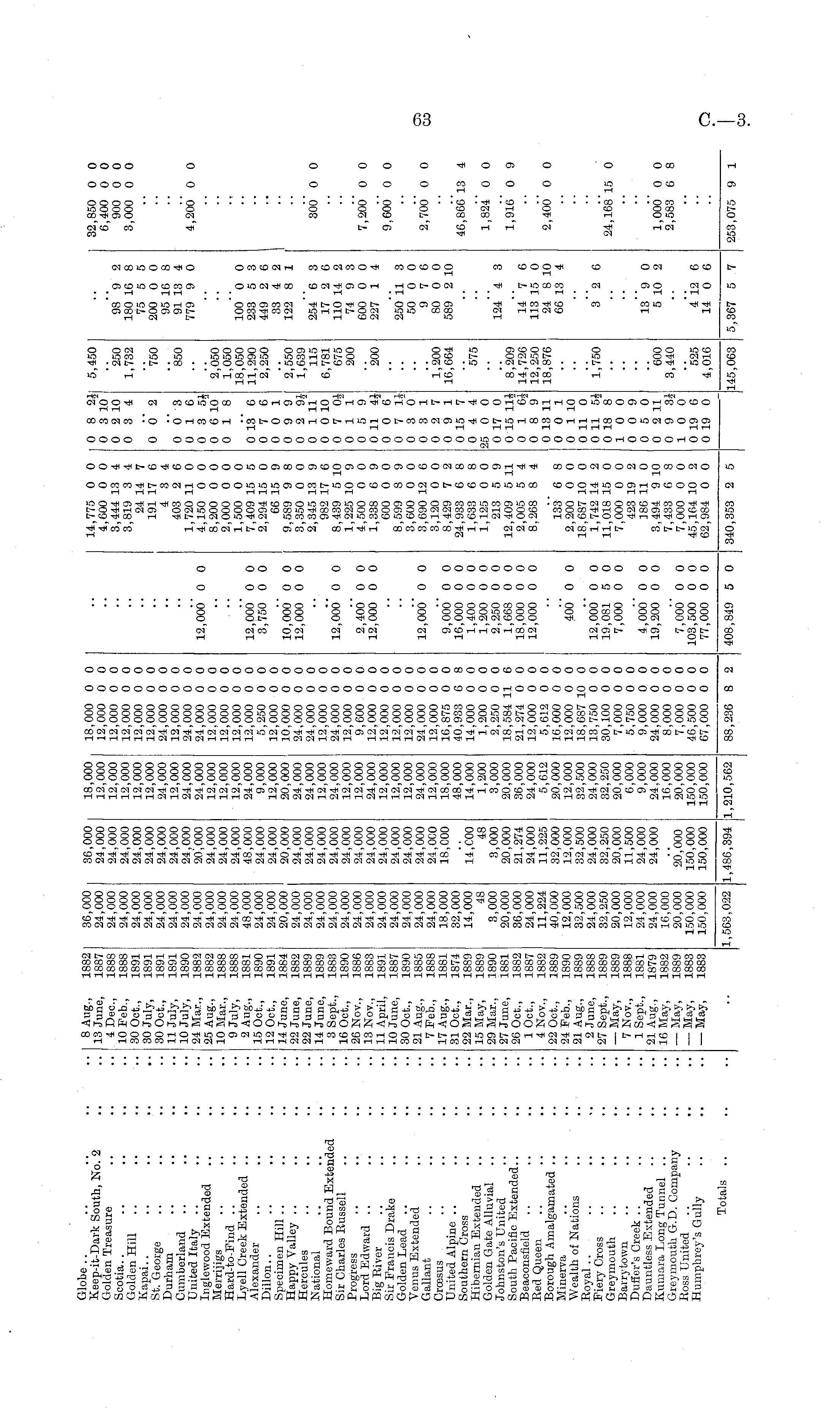 Globe .. Keep-it-Dark South, No. 2 Golden Treasure Scotia.. Golden Hill .. Kapai.. St. George Durham Cumberland United Italy Ingle-wood Extended Merrijigs Hard-to-Find Lyell Creek Extended .. Alexander Dillon.. Specimen Hill Happy Valley Hercules National Homeward Bound Extended Sir Charles Eussell Progress Lord Edward Big Eiver Sir Francis Drake Golden Lead Venus Extended Gallant Croesus United Alpine Southern Cross Hibernian Extended Golden Gate Alluvial Johnston's United South Pacific Extended.. Beaconsfield Red Queen Borough Amalgamated .. Minerva Wealth of Nations Royal Fiery Cross Greymouth Barrytown Duffer's Creek Dauntless Extended Kuniara Long Tunnel .. Greymouth G.D. Company Ross United Humphrey's Gully 8 Aug., 13 June, 4 Dec, 10 Feb., 30 Oct., 30 July, 30 Oct., 11 July, 10 July, 24 Mar., 25 Aug., 10 Mar., 9 July, 2 Aug., 15 Oct., 12 Oct., 14 June, 22 June, 22 June, 14 June, 3 Sept., 16 Oct., 26 Nov., 13 Nov., 11 April, 10 June, 30 Oct., 21 Aug., 7 Feb., 17 Aug., 31 Oct., 22 Mar., 15 May, 29 Mar., 27 June, 26 Oct., 1 Oct., 4 Nov., 22 Oct., 24 Feb., 21 Aug., 2 June, 27 Sept., — May, 7 Nov., 1 Sept., 21 Aug., 16 May, — May, — May, — May, 1882 1887 1888 1888 1891 1891 1891 1891 1890 1882 1882 1888 1888 1881 1890 1891 1884 1882 1889 1889 1883 1890 1886 1883 1891 1887 1890 1885 1888 1881 1874 1889 1889 1890 1881 1882 1887 1882 1889 1890 1889 1888 1889 1889 1888 1881 1879 1882 1889 1883 1883 36,000 24,000 24,000 24,000 24,000 24,000 24,000 24,000 24,000 24,000 24,000 24,000 24,000 48,000 24,000 24.000 20,000 24,000 24,000 24,000 24,000 24,000 24,000 24,000 24,000 24,000 24,000 24,000 24,000 18,000 32,000 14,000 48 3,000 20,000 36,000 24,000 11,224 40,000 12,000 32,500 24,000 32,250 20,000 12,000 24,000 24,000 16,000 20,000 150,000 150,000 36,000 24,000 24,000 24,000 24,000 24,000 24,000 24,000 24,000 20,000 24,000 24,000 24,000 48,000 24,000 24,000 20,000 24,000 24,000 24,000 24,000 24,000 24,000 24,000 24,000 24,000 24,000 24,000 24.0C0 18,000 18,000 12,000 12,000 12,000 12,000 12,000 24,000 12,000 24,000 24,000 12,000 12,000 12,000 24,000 9,000 12,000 20,000 24,000 24,000 12,000 24,000 12,000 12,000 24,000 12,000 12,000 12,000 24,000 12,000 18,000 48,000 14,000 1,200 3,000 20,000 36,000 24,000 5,612 20,000 12,000 32,500 24,000 32,250 20,000 6,000 9,000 24,000 16,000 20,000 150,000 150,000 18,000 0 0 12,000 0 0 12,000 0 0 12,000 0 0 12,000 0 0 12,000 0 0 24,000 0 0 12,000 0 0 24,000 0 0 24,000 0 0 12,000 0 0 12,000 0 0 12,000 0 0 12,000 0 0 5,250 0 0 12,000 0 0 10,000 0 0 24,000 0 0 24,000 0 0 12,000 0 0 24,000 0 0 12,000 0 0 9,600 0 0 12,000 0 0 12,000 0 0 12,000 0 0 12,000 0 0 24,000 0 0 12,000 0 0 16,875 0 0 40,933 6 8 14,000 0 0 1,200 0 0 2,250 0 0 18,584 11 6 21,274 0 0 12,000 0 0 5,612 0 0 16,000 0 0 12,000 0 0 18,687 10 0 13,750 0 0 30,100 0 0 7,000 0 0 5,750 0 0 9,000 0 0 24,000 0 0 8,000 0 0 7,000 0 0 46,500 0 0 C7,000 0 0 12,000 0 0 12,000* 0 0 3,750 0 0 10,000 0 0 12,000 0 0 12,006' o o 2,400 0 0 12,000 0 0 14,775 0 0 4,600 0 0 3,444 13 4 3,819 3 4 24 14 7 191 17 6 4 3 4 403 2 6 1,720 11 0 4,150 0 0 8,200 0 0 2,000 0 0 1,500 0 0 7,409 15 5 2,294 15 0 66 15 9 9,589 9 8 3,350 0 0 2,345 13 9 982 17 6 8,439 5 10 1,225 10 9 4,500 0 0 1,338 6 9 600 0 0 8.599 8 9 3.600 0 0 3,690 12 6 3,120 0 0 8,429 7 2 24,933 6 8 1,633 6 8 1,125 0 0 213 5 9 12,409 5 11 2,005 5 4 8,268 8 4 0 8 2} 0 3 10 0 2 10 0 3 4 0 6' 2 0 0 3 0 16 0 3 5J 0 6 10 0 18 0 13 6 0 7 6 0 0 1 0 9 9 0 2 9J 0 1 11 0 0 10 0 7 0i Oil" 0 5 9 0 11 4J 0 0 6 0 7 1* 0 3 0 0 3 1 0 2 7 0 9 1 0 15 7 0 4 4 25 0 0 0 17 0 0 15 11 J 0 1 6J 0 8 9 0 13 11 0 0 1 0 1 10 0 11 0 0 11 5J 0 18 8 10 0 0 0 9 0 5 0 0 2 11 0 9 31 10 0 0 19 6 0 19 0 5,450 *250 1,732 - 750 '850 2,050 1,050 18,050 11,290 2,250 2,550 1,639 115 6,781 675 200 - 200 98 9 2 180 16 8 75 5 5 200 0 0 95 16 8 91 13 4 779 9 0 100 0 0 233 5 3 449 2 6 33 4 2 122 8 1 254 6 3 17 2 6 110 14 2 74 9 3 600 0 0 227 1 4 250 11 3 50 0 0 9 7 6 80 0 0 589 2 10 32,850 0 0 6,400 0 0 900 0 0 3,000 0 0 4,200 0 0 300' 0 0 7,200' 0 0 9,600' 0 0 12,000' 0 0 2,700 0 0 9,000 0 0 16,000 0 0 1,400 0 0 1,200 0 0 2,250 0 0 1,668 0 0 18,000 0 0 12,000 0 0 1,200 16,664 14,C00 48 3,000 20,000 21,274 24,000 11,225 32,000 12,000 32,500 24,000 32,250 20,000 11,500 24,000 24,000 46,866 13 4 575 124 4 3 1,824 0 0 8,209 14,726 12,250 18,876 14 7 6 113 15 0 24 8 10 66 13 4 1,916 0 9 133 6 8 2,200 0 0 18,687 10 0 1,742 14 2 11,018 15 0 7,000 0 0 423 19 2 ]86 11 0 3,494 9 10 7,433 6 8 7,000 0 0 45,164 10 2 62,984 0 0 2,400' 0 0 400' 0 0 12,000 0 0 19,081 5 0 7,000 0 0 l - 750 3 "2 6 24,168 15 0 4,000 0 0 19,200 0 0 '(500 3,440 13 "9 0 5 10 2 1,006' o o 2,583 6 8 20,000 150,000 150,000 7,000 0 0 103,500 0 0 77,000 0 0 525 4,016 4 12 6 14 0 6 Totals .. 1,563,022 1,486,394 1,210,562 88,236 8 2 408,849 5 0 340,353 2 5 145,063 5,367 5 7 253,075 9 1