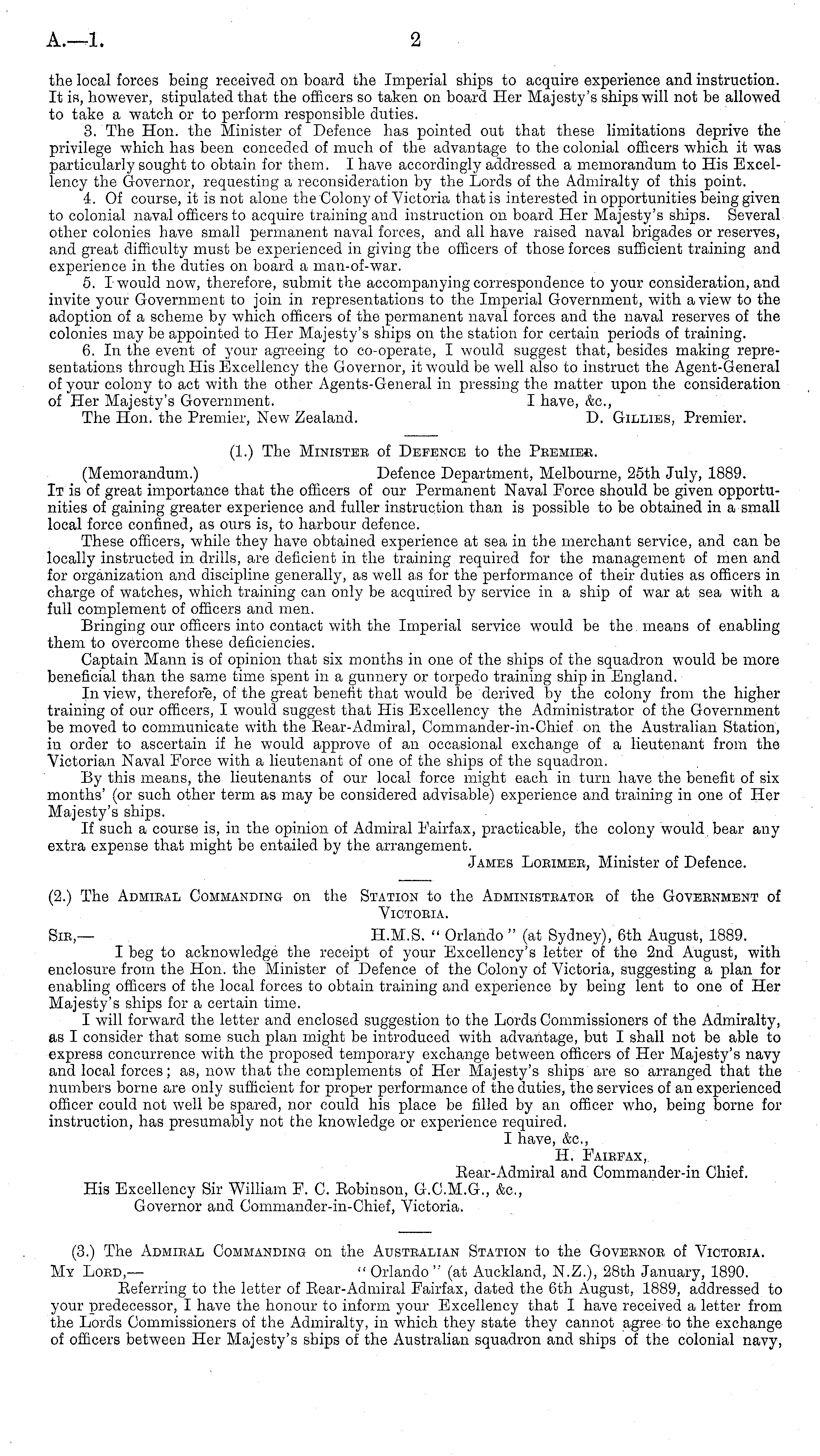 (1.) The Minister of Defence to the Premier. (Memorandum.) Defence Department, Melbourne, 25th July, 1889. It is of great importance that the officers of our Permanent Naval Force should be given opportunities of gaining greater experience and fuller instruction than is possible to be obtained in a small local force confined, as ours is, to harbour defence. These officers, while they have obtained experience at sea in the merchant service, and can be locally instructed in drills, are deficient in the training required for the management of men and for organization and discipline generally, as well as for the performance of their duties as officers in charge of watches, which training can only be acquired by service in a ship of war at sea with a full complement of officers and men. Bringing our officers into contact with the Imperial service would be the means of enabling them to overcome these deficiencies. Captain Mann is of opinion that six months in one of the ships of the squadron would be more beneficial than the same time spent in a gunnery or torpedo training ship in England. In view, therefore, of the great benefit that would be derived by the colony from the higher training of our officers, I would suggest that His Excellency the Administrator of the Government be moved to communicate with the Bear-Admiral, Commander-in-Chief on the Australian Station, in order to ascertain if he would approve of an occasional exchange of a lieutenant from the Victorian Naval Force with a lieutenant of one of the ships of the squadron. By this means, the lieutenants of our local force might each in turn have the benefit of six months' (or such other term as may be considered advisable) experience and training in one of Her Majesty's ships. If such a course is, in the opinion of Admiral Fairfax, practicable, the colony would bear any extra expense that might be entailed by the arrangement. James Lorimer, Minister of Defence.