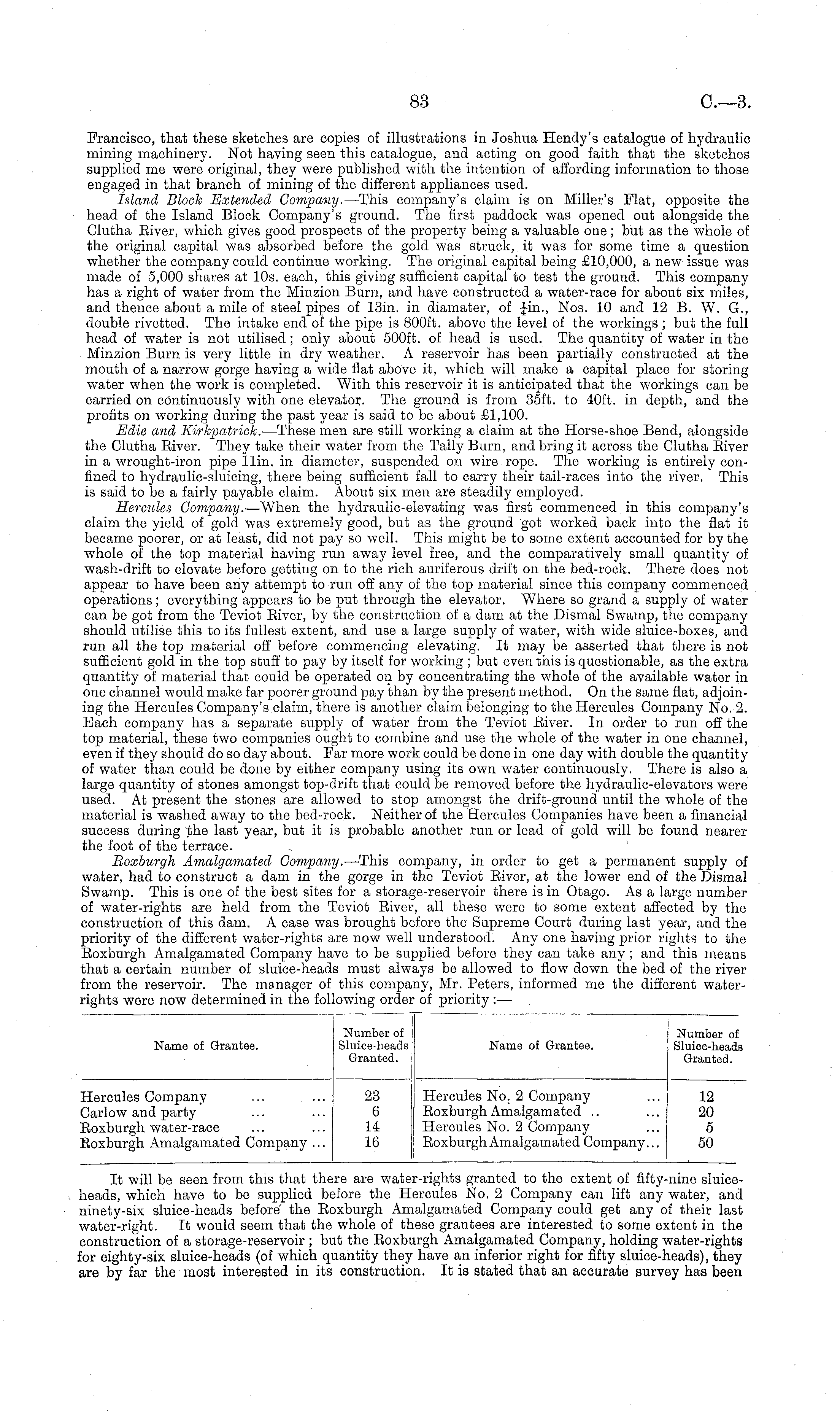 It will be seen from this that there are water-rights granted to the extent of fifty-nine sluiceheads, which have to be supplied before the Hercules No. 2 Company can lift any water, and ninety-six sluice-heads before the Roxburgh Amalgamated Company could get any of their last water-right. It would seem that the whole of these grantees are interested to some extent in the construction of a storage-reservoir ; but the Roxburgh Amalgamated Company, holding water-rights for eighty-six sluice-heads (of which quantity they have an inferior right for fifty sluice-heads), they are by far the most interested in its construction. It is stated that an accurate survey has been