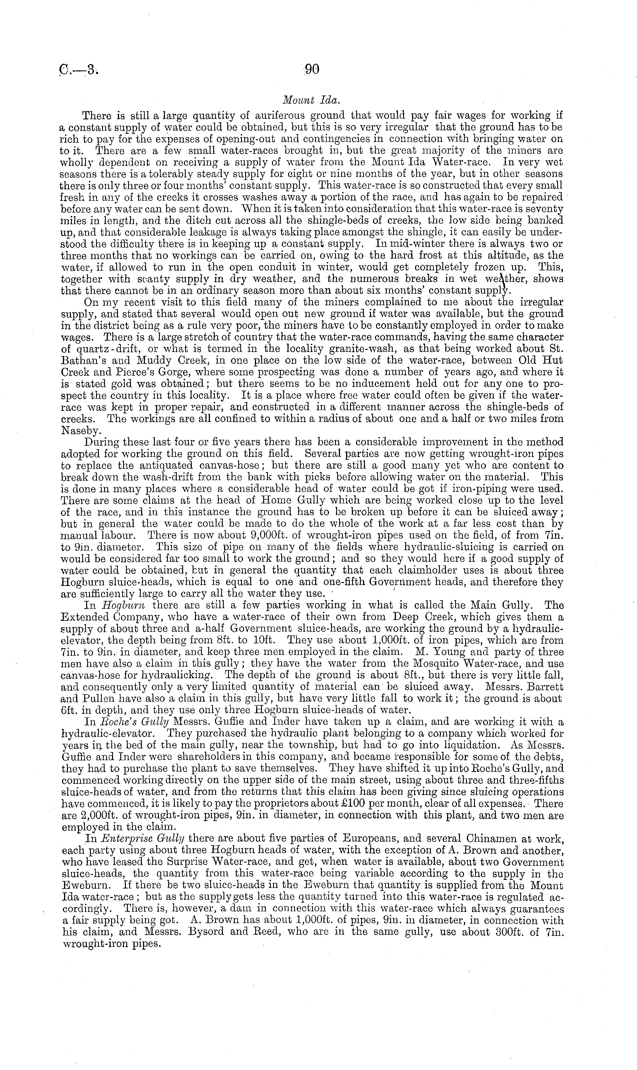 Mount Ida. There is still a large quantity of auriferous ground that would pay fair wages for working if a constant supply of water could be obtained, but this is so very irregular that the ground has to be rich to pay for the expenses of opening-out and contingencies in connection with bringing water on to it. There are a few small water-races brought in, but the great majority of the miners are wholly dependent on receiving a supply of water from the Mount Ida Water-race. In very wet seasons there is a tolerably steady supply for eight or nine months of the year, but in other seasons there is only three or four months' constant supply. This water-race is so constructed that every small fresh in any of the creeks it crosses washes away a portion of the race, and has again to be repaired before any water can be sent down. When it is taken into consideration that this water-race is seventy miles in length, and the ditch cut across all the shingle-beds of creeks, the low side being banked up, and that considerable leakage is always taking place amongst the shingle, it can easily be understood the difficulty there is in keeping up a constant supply. In mid-winter there is always two or three months that no workings can be carried on, owing to the hard frost at this altitude, as the water, if allowed to run in the open conduit in winter, would get completely frozen up. This, together with scanty supply in dry weather, and the numerous breaks in wet weather, shows that there cannot be in an ordinary season more than about six months' constant supply. On my recent visit to this field many of the miners complained to me about the irregular supply, and stated that several would open out new ground if water was available, but the ground in the district being as a rule very poor, the miners have to be constantly employed in order to make wages. There is a large stretch of country that the water-race commands, having the same character of quartz - drift, or what is termed in the locality granite-wash, as that being worked about St. Bathan's and Muddy Creek, in one place on the low side of the water-race, between Old Hut Creek and Pierces Gorge, where some prospecting was done a number of years ago, and where it is stated gold was obtained; but there seems to be no inducement held out for any one to prospect the country in this locality. It is a place where free water could often be given if the waterrace was kept in proper repair, and constructed in a different manner across the shingle-beds of creeks. The workings are all confined to within a radius of about one and a half or two miles from Naseby. During these last four or five years there has been a considerable improvement in the method adopted for working the ground on this field. Several parties are now getting wrought-iron pipes to replace the antiquated canvas-hose; but there are still a good many yet who are content to break down the wash-drift from the bank with picks before allowing water on the material. This is done in many places where a considerable head of water could be got if iron-piping were used. There are some claims at the head of Home Gully which are being worked close up to the level of the race, and in this instance the ground has to be broken up before it can be sluiced away; but in general the water could be made to do the whole of the work at a far less cost than by manual labour. There is now about 9,000 ft. of wrought-iron pipes used on the field, of from 7in. to 9m. diameter. This size of pipe oil many of the fields where hydraulic-sluicing is carried on would be considered far too small to work the ground; and so they would here if a good supply of water could be obtained, but in general the quantity that each claimholder uses is about three Hogburn sluice-heads, which is equal to one and one-fifth Government heads, and therefore they are sufficiently large to carry all the water they use. In Hogburn there are still a few parties working in what is called the Main Gully. The Extended Company, who have a water-race of their own from Deep Creek, which gives them a supply of about three and a-half Government sluice-heads, are working the ground by a hydraulicelevator, the depth being from Bft. to 10ft. They use about I,oooft. of iron pipes, which are from 7in. to 9in. in diameter, and keep three men employed in the claim. M. Young and party of three men have also a claim in this gully; they have the water from the Mosquito Water-race, and use canvas-hose for hydraulicking. The depth of the ground is about Bft., but there is very little fall, and consequently only a very limited quantity of material can be sluiced away. Messrs. Barrett and Pullen have also a claim in this gully, but have very little fall to work it; the ground is about 6ft. in depth, and they use only three Hogburn sluice-heads of water. In Boche's Gully Messrs. Guffie and Inder have taken up a claim, and are working it with a hydraulic-elevator. They purchased the hydraulic plant belonging to a company which worked for years in. the bed of the main gully, near the township, but had to go into liquidation. As Messrs. Guffie and Inder were shareholders in this company, and became responsible for some of the debts, they had to purchase the plant to save themselves. They have shifted it up into Roche's Gully, and commenced working directly on the upper side of the main street, using about three and three-fifths sluice-heads of water, and from the returns that this claim has been giving since sluicing operations have commenced, it is likely to pay the proprietors about £100 per month, clear of all expenses. There are 2,000 ft. of wrought-iron pipes, 9in. in diameter, in connection with this plant, and two men are employed in the claim. In Enterprise Gully there are about five parties of Europeans, and several Chinamen at work, each party using about three Hogburn heads of water, with the exception of A. Brown and another, who have leasee! the Surprise Water