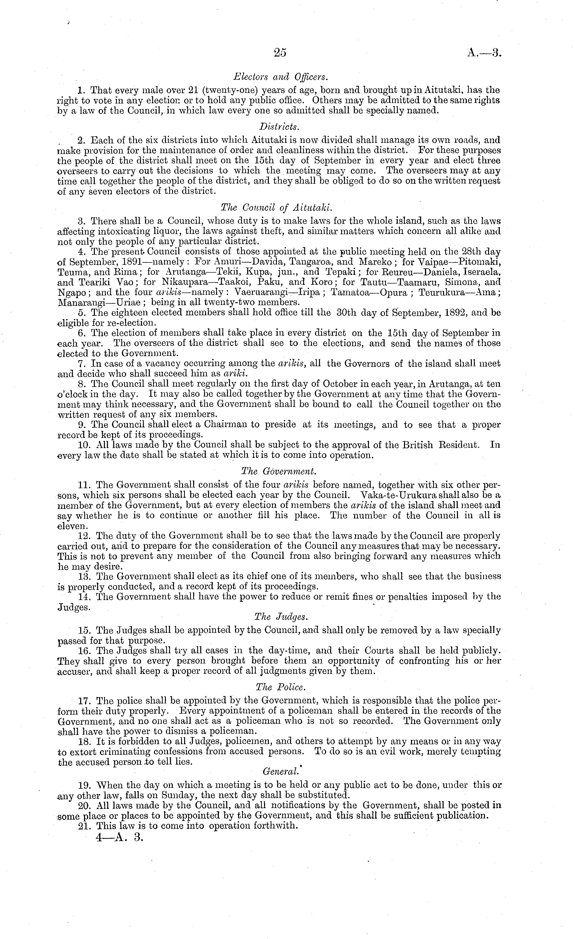 Electors and Officers. 1. That every male over 21 (twenty-one) years of age, born and brought up in Aitutaki, has the right to vote in any election or to hold any public office. Others may be admitted to the same rights by a law of the Council, in which law every one so admitted shall be specially named. Districts. 2. Each of the six districts into which Aitutaki is now divided shall manage its own roads, and make provision for the maintenance of order and cleanliness within the district. For these purposes the people of the district shall meet on the 15th day of September in every year and elect three overseers to carry out the decisions to which the meeting may come. The overseers may at any time call together the people of the district, and they shall be obliged to do so on the written request of any seven electors of the district. The Council of Aitutaki. 3. There shall be a Council, whose duty is to make laws for the whole island, such as the laws affecting intoxicating liquor, the laws against theft, and similar matters which concern all alike and not only the people of any particular district. 4. The present Council consists of those appointed at the public meeting held on the 28th day of September, 1891 —namely : For Amuri—Davida, Tangaroa, and Mareko ; for Vaipae —Pitomaki, Teuma, and Eima; for Arutanga —Tekii, Kupa, jun., and Tepaki; for Eeureu—Daniela, Iseraela, and Teariki Vao; for Nikaupara—Taakoi, Paku, and Koro; for Tautu—Taamaru, Simona, and Ngapo ; and the four arikis —namely : Vaeruarangi—lripa ; Tamatoa—Opura ; Teurukura —Ama; Manarangi—Uriae ; being in all twenty-two members. 5. The eighteen elected members shall hold office till the 30th day of September, 1892, and be eligible for re-election. 6. The election of members shall take place in every district on the 15th day of September in each year. The overseers of the district shall see to the elections, and send the names of those elected to the Government. 7. In case of a vacancy occurring among the arikis, all the Governors of the island shall meet and decide who shall succeed him as ariki. 8. The Council shall meet regularly on the first day of October in each year, in Arutanga, at ten o'clock in the day. It may also be called together by the Government at any time that the Government may think necessary, and the Government shall be bound to call the Council together on the written request of any six members. 9. The Council shall elect a Chairman to preside at its meetings, and to see that a proper record be kept of its proceedings. 10. All laws made by the Council shall be subject to the approval of the British Eesident. In every law the date shall be stated at which it is to come into operation. The Government. 11. The Government shall consist of the four arikis before named, together with six other persons, which six persons shall be elected each year by the Council. Vaka-te-Urukura shall also be a member of the Government, but at every election of members the arikis of the island shall meet and say whether he is to continue or another fill his place. The number of the Council in all is eleven. 12. The duty of the Government shall be to see that the laws made by the Council are properly carried out, arid to prepare for the consideration of the Council any measures that maybe necessary. This is not to prevent any member of the Council from also bringing forward any measures which he may desire. 13. The Government shall elect as its chief one of its members, who shall see that the business is properly conducted, and a record kept of its proceedings. 14. The Government shall have the power to reduce or remit fines or penalties imposed by the Judges. The Judges. 15. The Judges shall bo appointed by the Council, and shall only be removed by a law specially passed for that purpose. 16. The Judges shall try all cases in the day-time, and their Courts shall be held publicly. They shall give to every person brought before them an opportunity of confronting his or her accuser, and shall keep a proper record of all. judgments given by them. The Police. 17. The police shall be appointed by the Government, which is responsible that the police perform their duty properly. Every appointment of a policeman shall be entered in the records of the Government, and no one shall act as a policeman who is not so recorded. The Government only shall have the power to dismiss a policeman. 18. It is forbidden to all Judges, policemen, and others to attempt by any means or in any way to extort criminating confessions from accused persons. To do so is an evil work, merely tempting the accused person .to tell lies. General. 19. When the day on which a meeting is to be held or any public act to be done, under this or any other law, falls on Sunday, the next day shall be substituted. 20. All laws made by the Council, and all notifications by the Government, shall be posted in some place or places to be appointed by the Government, and this shall be sufficient publication. 21. This law is to come into operation forthwith. 4—A. 3.