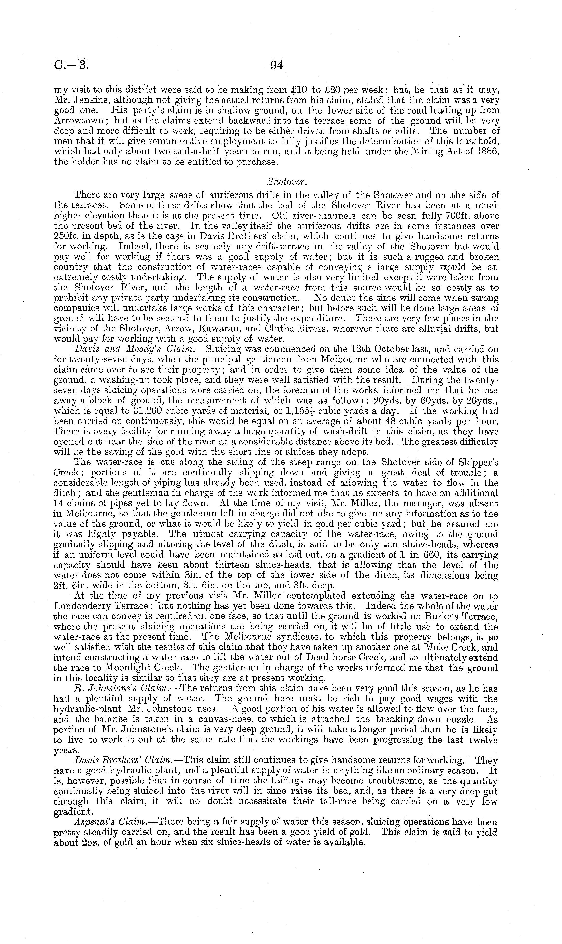 my visit to this district were said to be making from £10 to £20 per week; but, be that as it may, Mr. Jenkins, although not giving the actual returns from his claim, stated that the claim was a very good one. His party's claim is in shallow ground, on the lower side of the road leading up from Arrowtown; but as the claims extend backward into the terrace some of the ground will be very deep and more difficult to Work; requiring to be either driven from shafts or adits. The number of men that it will give remunerative employment to fully justifies the determination of this leasehold, which had only about two-and-a-half years to run, and it being held under the Mining Act of 1886, the holder has no claim to be entitled to purchase. Shotover. There are very large areas of auriferous drifts in the valley of the Shotover and on the side of the terraces. Some of these drifts show that the bed of the Shotover Biver has been at a much higher elevation than it is at the present time. Old river-channels can be seen fully 700 ft. above the present bed of the river. In the valley itself the .auriferous drifts are in some instances over 250 ft. in depth, as is the case in Davis Brothers' claim, which continues to give handsome returns for working. Indeed, there is scarcely any drift-terrace in the valley of the Shotover but would pay well for working if there was a good supply of water; but it is such a rugged and broken country that the construction of water-races capable of conveying a large supply vsould be an extremely costly undertaking. The supply of water is also very limited except it were taken from the Shotover River, and the length of a water-race from this source would be so costly as to prohibit any private party undertaking its construction. No doubt the time will come when strong companies will undertake large works of this character; but before such will be done large areas of ground will have to be secured to them to justify the expenditure. There are very few places in the vicinity of the Shotover, Arrow, Kawarau, and Clutha Rivers, wherever there are alluvial drifts, but would pay for working with a good supply of water. Davis and Moody's Claim. —Sluicing was commenced on the 12th October last, and carried on for twenty-seven days, when the principal gentlemen from Melbourne who are connected with this claim came over to see their property; and in order to give them some idea of the value of the ground, a washing-up took place, and they were well satisfied with the result. During the twentyseven days sluicing operations were carried on, the foreman of the works informed me that he ran away a block of ground, the measurement of which was as follows : 20yds. by 60yds. by 26yds., which is equal to 31,200 cubic yards of material, or 1,155$ cubic yards a day. If the working had been carried on continuously, this would be equal on an average of about 48 cubic yards per hour. There is every facility for running away a large quantity of wash-drift in this claim, as they have opened out near the side of the river at a considerable distance above its bed. The greatest difficulty will be the saving of the gold with the short line of sluices they adopt. The water-race is cut along the siding of the steep range on the Shotover side of Skipper's Creek; portions of it are continually slipping down and giving a great deal of trouble; a considerable length of piping has already been used, instead of allowing the water to flow in the ditch; and the gentleman in charge of the work informed me that he expects to have an additional 14 chains of pipes yet to lay down. At the time of my visit, Mr. Miller, the manager, was absent in Melbourne, so that the gentleman left in charge did not like to give me any information as to the value of the ground, or what it would be likely to yield in gold per cubic yard; but he assured me it was highly payable. The utmost carrying capacity of the water-race, owing to the ground gradually slipping and altering the level of the ditch, is said to be only ten sluice-heads, whereas if an uniform level could have been maintained as laid out, on a gradient of 1 in 660, its carrying capacity should have been about thirteen sluice-heads, that is allowing that the level of the water does not come within 3in. of the top of the lower side of the ditch, its dimensions being 2ft. 6in. wide in the bottom, 3ft. 6in. on the top, and 3ft. deep. At the time of my previous visit Mr. Miller contemplated extending the water-race on to Londonderry Terrace ; but nothing has yet been done towards this. Indeed the whole of the water the race can convey is required on one face, so that until the ground is worked on Burkes Terrace, where the present sluicing operations are being carried on, it will be of little use to extend the water-race at the present time. The Melbourne syndicate, to which this property belongs, is so well satisfied with the results of this claim that they have taken up another one at Moke Creek, and intend constructing a water-race to lift the water out of Dead-horse Creek, and to ultimately extend the race to Moonlight Creek. The gentleman in charge of the works informed me that the ground in this locality is similar to that they are at present working. B. Johnstone's Claim. —The returns from this claim have been very good this season, as he has had a plentiful supply of water. The ground here must be rich to pay good wages with the hydraulic-plant Mr. Johnstone uses. A good portion of his water is allowed to flow over the face, and the balance is taken in a canvas-hose, to which is attached the breaking-down nozzle. As portion of Mr. Johnstone's claim is very deep ground, it will take a longer period than he is likely to live to work it out at the same rate that the workings have been progressing the last twelve years. Davis Brothers' Claim. —This claim still continues to give handsome returns for working. They have a good hydraulic plant, and a plentiful supply 