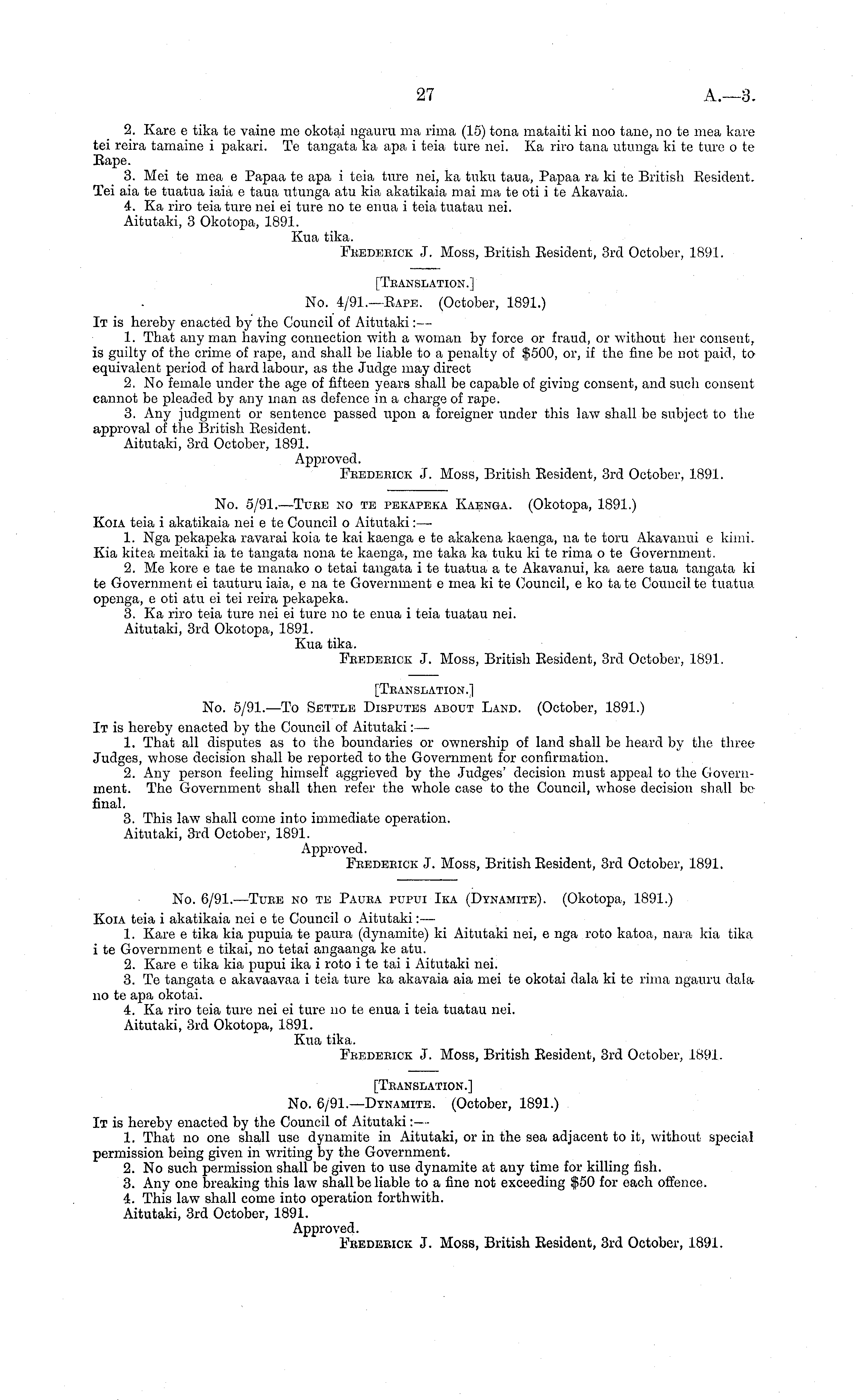 2. Kare c tika te vaine me okotai ngauru ma rima (15) tona mataiti ki noo tane, no te mea kare tei reira tamaine i pakari. Te tangata ka apa i teia ture nei. Ka riro tana utunga kite ture ote Eape. 3. Mci te mea c Papaa te apa i teia ture nei, ka tuku taua, Papaa ra kite British Eesident. Tei aia te tuatua iaia c taua utunga atu kia akatikaia mai ma te oti i te Akavaia. 4. Ka riro teia ture nei ci ture no te enua i teia tuatau nei. Aitutaki, 3 Okotopa, 1891. Kua tika. Frederick J. Moss, British Eesident, 3rd October, 1891.