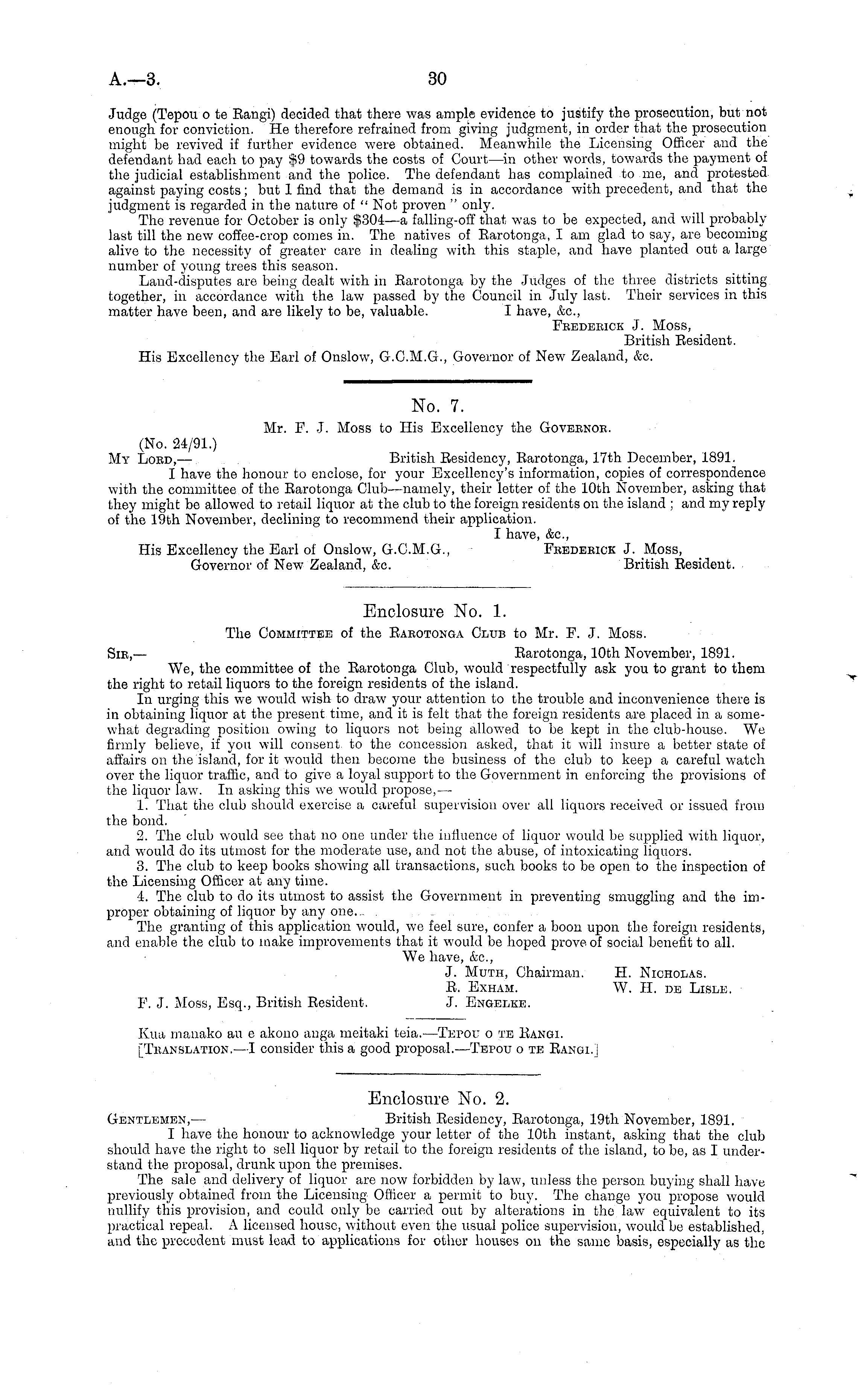 Enclosure No. 1. The Committee of the Earotonga Club to Mr. F. J. Moss. Sir, — Earotonga, 10th November, 1891. We, the committee of the Earotonga Club, would respectfully ask you to grant to them the right to retail liquors to the foreign residents of the island. In urging this we would wish to draw your attention to the trouble and inconvenience there is in obtaining liquor at the present time, and it is felt that the foreign residents are placed in a somewhat degrading position owing to liquors not being allowed to be kept in the club-house. We firmly believe, if you will consent, to the concession asked, that it will insure a better state of affairs on the island, for it would then become the business of the club to keep a careful watch over the liquor traffic, and to give a loyal support to the Government in enforcing the provisions of the liquor law. In asking this we would propose,— 1. That the club should exercise a careful supervision over all liquors received or issued from the bond. 2. The club would see that no one under the influence of liquor would be supplied with liquor, and would do its utmost for the moderate use, and not the abuse, of intoxicating liquors. 3. The club to keep books showing all transactions, such books to be open to the inspection of the Licensing Officer at any time. 4. The club to do its utmost to assist the Government in preventing smuggling and the improper obtaining of liquor by any one... . The granting of this application would, we feel sure, confer a boon upon the foreign residents, and enable the club to make improvements that it would be hoped prove of social benefit to all. We have, &c, J. Muth, Chairman. H. Nicholas. E. Exham. W. H. de Lisle. F. J. Moss, Esq., British Eesident. J. Engelke.
