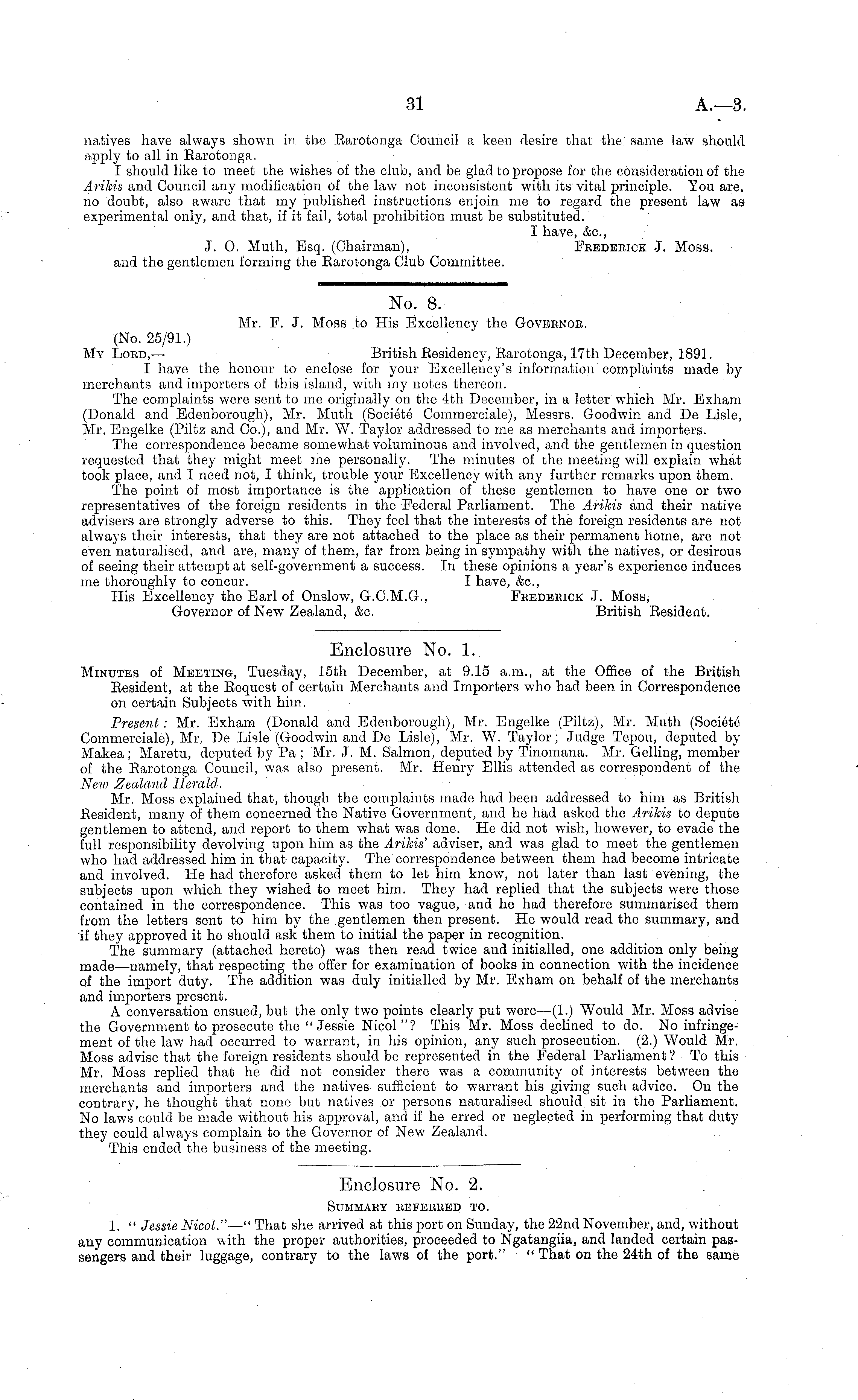 Enclosure No. 1. Minutes of Meeting, Tuesday, 15th December, at 9.15 a.m., at the Office of the British Eesident, at the Bequest of certain Merchants and Importers who had been in Correspondence on certain Subjects with him. Present: Mr. Exham (Donald and Edenborough), Mr. Engelke (Piltz), Mr. Muth (Societe Commerciale), Mr. De Lisle (Goodwin and De Lisle), Mr. W. Taylor; Judge Tepou, deputed by Makea; Maretu, deputed by Pa ; Mr, J. M. Salmon, deputed by Tinomana. Mr. Gelling, member of the Earotonga Council, was also present. Mr. Henry Ellis attended as correspondent of the New Zealand Herald. Mr. Moss explained that, though the complaints made had been addressed to him as British Eesident, many of them concerned the Native Government, and he had asked the Arikis to depute gentlemen to attend, and report to them what was done. He did not wish, however, to evade the full responsibility devolving upon him as the Arikis' adviser, and was glad to meet the gentlemen who had addressed him in that capacity. The correspondence between them had become intricate and involved. He had therefore asked them to let him know, not later than last evening, the subjects upon which they wished to meet him. They had replied that the subjects were those contained in the correspondence. This was too vague, and he had therefore summarised them from the letters sent to him by the gentlemen then present. He would read the summary, and if they approved it he should ask them to initial the paper in recognition. The summary (attached hereto) was then read twice and initialled, one addition only being made—namely, that respecting the offer for examination of books in connection with the incidence of the import duty. The addition was duly initialled by Mr. Exham on behalf of the merchants and importers present. A conversation ensued, but the only two points clearly put were—(l.) Would Mr. Moss advise the Government to prosecute the " Jessie Nicol"? This Mr. Moss declined to do. No infringement of the law had occurred to warrant, in his opinion, any such prosecution. (2.) Would Mr. Moss advise that the foreign residents should be represented in the Federal Parliament ? To this Mr. Moss replied that he did not consider there was a community of interests between the merchants and importers and the natives sufficient to warrant his giving such advice. On the contrary, he thought that none but natives or persons naturalised should sit in the Parliament. No laws could be made without his approval, and if he erred or neglected in performing that duty they could always complain to the Governor of New Zealand. This ended the business of the meeting.