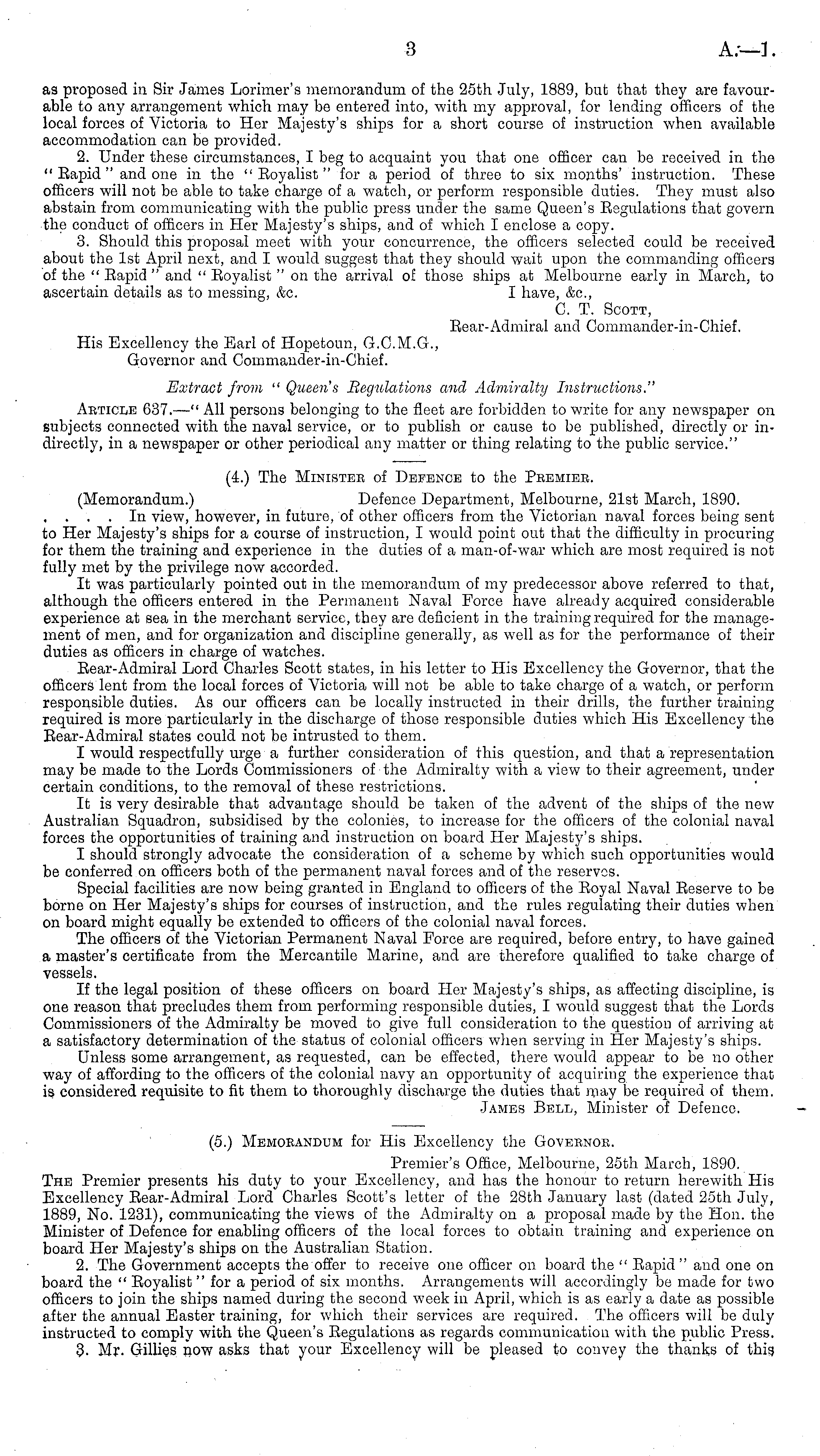 (5.) Memorandum for His Excellency the Governor. Premier's Office, Melbourne, 25th March, 1890. The Premier presents his duty to your Excellency, and has the honour to return herewith His Excellency Bear-Admiral Lord Charles Scott's letter of the 28th January last (dated 25th July, 1889, No. 1231), communicating the views of the Admiralty on a proposal made by the Hon. the Minister of Defence for enabling officers of the local forces to obtain training and experience on board Her Majesty's ships on the Australian Station. 2. The Government accepts the offer to receive one officer on board the " Bapid " and one on board the " Boyalist " for a period of six months. Arrangements will accordingly be made for two officers to join the ships named during the second week in April, which is as early a date as possible after the annual Easter training, for which their services are required. The officers will be duly instructed to comply with the Queen's Begulations as regards communication with the public Press. 3. Mr. Gillies now asks that your Excellency will be pleased to convey the thanks of this