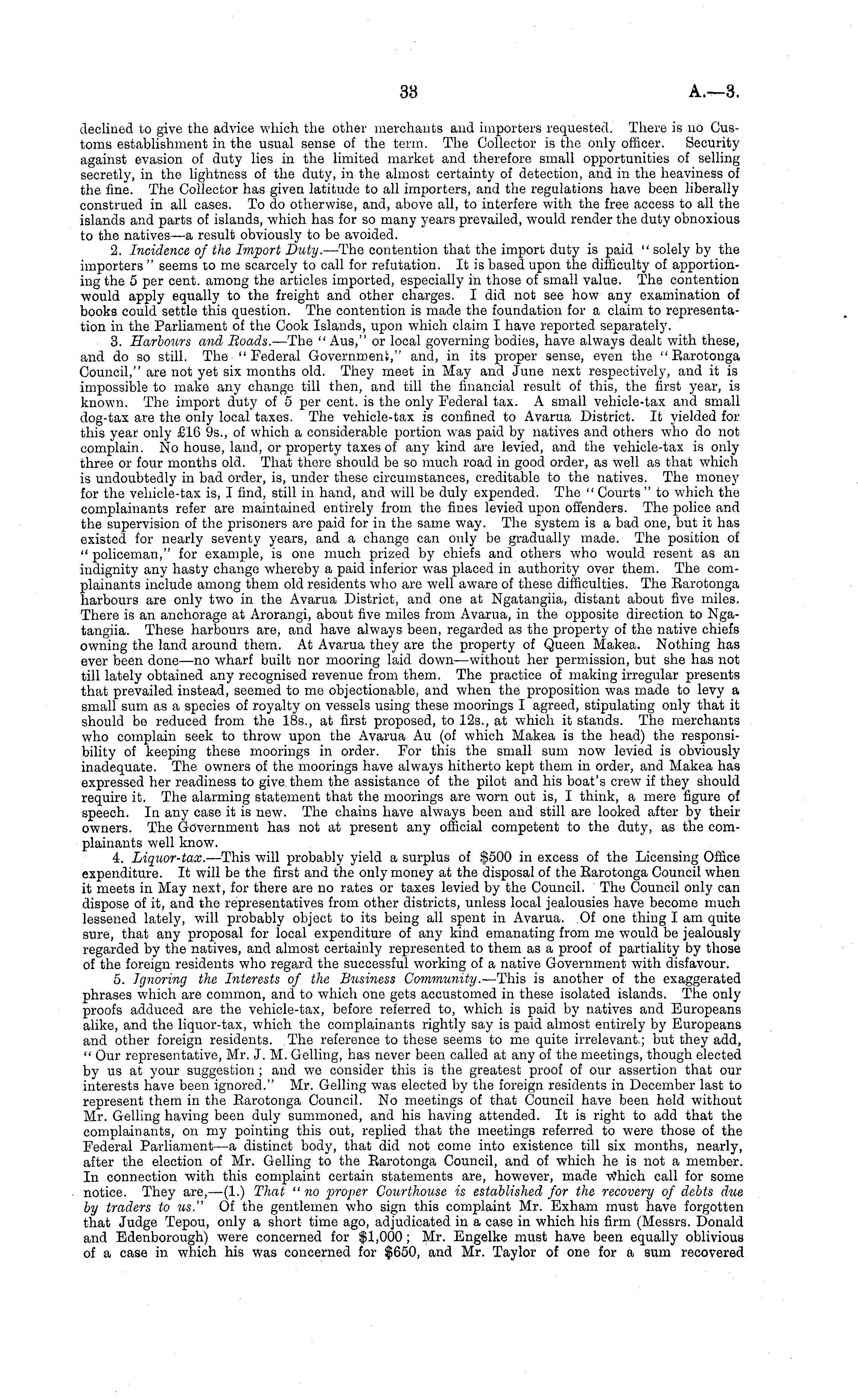 declined to give the advice which the other merchants and importers requested. There is no Customs establishment in the usual sense of the term. The Collector is the only officer. Security against evasion of duty lies in the limited market and therefore small opportunities of selling secretly, in the lightness of the duty, in the almost certainty of detection, and in the heaviness of the fine. The Collector has given latitude to all importers, and the regulations have been liberally construed in all cases. To do otherwise, and, above all, to interfere with the free access to all the islands and parts of islands, which has for so many years prevailed, would render the duty obnoxious to the natives—a result obviously to be avoided. 2. Incidence of the Import Duty. —The contention that the import duty is paid " solely by the importers " seems to me scarcely to call for refutation. It is based upon the difficulty of apportioning the 5 per cent, among the articles imported, especially in those of small value. The contention would apply equally to the freight and other charges. I did not see how any examination of books could settle this question. The contention is made the foundation for a claim to representation in the Parliament of the Cook Islands, upon which claim I have reported separately. 3. Harbours and Roads. —The " Aus," or local governing bodies, have always dealt with these, and do so still. The "Federal Government," and, in its proper sense, even the "Earotonga Council," are not yet six months old. They meet in May and June next respectively, and it is impossible to make any change till then, and till the financial result of this, the first year, is known. The import duty of 5 per cent, is the only Federal tax. A small vehicle-tax and small dog-tax are the only local taxes. The vehicle-tax is confined to Avarua District. It yielded for this year only £16 95., of which a considerable portion was paid by natives and others who do not complain. No house, land, or property taxes of any kind are levied, and the vehicle-tax is only three or four months old. That there should be so much road in good order, as well as that which is undoubtedly in bad order, is, under these circumstances, creditable to the natives. The money for the vehicle-tax is, I find, still in hand, and will be duly expended. The " Courts "to which the complainants refer are maintained entirely from the fines levied upon offenders. The police and the supervision of the prisoners are paid for in the same way. The system is a bad one, but it has existed for nearly seventy years, and a change can only be gradually made. The position of " policeman," for example, is one much prized by chiefs and others who would resent as an indignity any hasty change whereby a paid inferior was placed in authority over them. The complainants include among them old residents who are well aware of these difficulties. The Earotonga harbours are only two in the Avarua District, and one at Ngatangiia, distant about five miles. There is an anchorage at Arorangi, about five miles from Avarua, in the opposite direction to Ngatangiia. These harbours are, and have always been, regarded as the property of the native chiefs owning the land around them. At Avarua they are the property of Queen Makea. Nothing has ever been done —no wharf built nor mooring laid down —-without her permission, but she has not till lately obtained any recognised revenue from them. The practice of making irregular presents that prevailed instead, seemed to me objectionable, and when the proposition was made to levy a small sum as a species of royalty on vessels using these moorings I agreed, stipulating only that it should be reduced from the 18s., at first proposed, to 125., at which it stands. The merchants who complain seek to throw upon the Avarua Au (of which Makea is the head) the responsibility of keeping these moorings in order. For this the small sum now levied is obviously inadequate. The owners of the moorings have always hitherto kept them in order, and Makea has expressed her readiness to give, them the assistance of the pilot and his boat's crew if they should require it. The alarming statement that the moorings are worn out is, I think, a mere figure of speech. In any case it is new. The chains have always been and still are looked after by their owners. The Government has not at present any official competent to the duty, as the complainants well know. 4. Liquor-tax. —This will probably yield a surplus of $500 in excess of the Licensing Office expenditure. It will be the first and the only money at the disposal of the Earotonga Council when it meets in May next, for there are no rates or taxes levied by the Council. The Council only can dispose of it, and the representatives from other districts, unless local jealousies have become much lessened lately, will probably object to its being all spent in Avarua. Of one thing lam quite sure, that any proposal for local expenditure of any kind emanating from me would be jealously regarded by the natives, and almost certainly represented to them as a proof of partiality by those of the foreign residents who regard the successful working of a native Government with disfavour. 5. Ignoring the Interests of the Business Community. —This is another of the exaggerated phrases which are common, and to which one gets accustomed in these isolated islands. The only proofs adduced are the vehicle-tax, before referred to, which is paid by natives and Europeans alike, and the liquor-tax, which the complainants rightly say is paid almost entirely by Europeans and other foreign residents. The reference to these seems to me quite irrelevant.; but they add, " Our representative, Mr. J. M. Gelling, has never been called at any of the meetings, though elected by us at your suggestion; and we consider this is the greatest proof of our assertion that our interests have been ignored." Mr. Gelling was elected by the forei