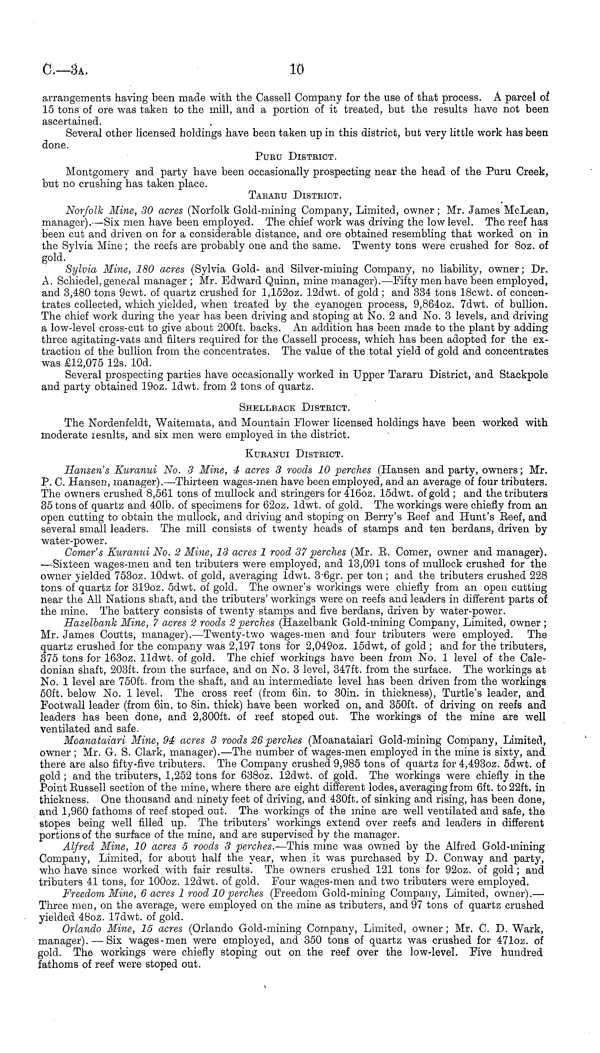 arrangements having been made with the Cassell Company for the use of that process. A parcel of 15 tons of ore was taken to the mill, and a portion of it treated, but the results have not been ascertained. Several other licensed holdings have been taken up in this district, but very little work has been done. Pueu Disteict. Montgomery and party have been occasionally prospecting near the head of the Puru Creek, but no crushing has taken place. Takabtj Disteict. Norfolk Mine, 30 acres (Norfolk Gold-mining Company, Limited, owner; Mr. James McLean, manager). —Six men have been employed. The chief work was driving the low level. The reef has been cut and driven on for a considerable distance, and ore obtained resembling that worked on in the Sylvia Mine; the reefs are probably one and the same. Twenty tons were crushed for Boz. of gold. Sylvia Mine, 180 acres (Sylvia Gold- and Silver-mining Company, no liability, owner; Dr. A. Schiedel, general manager ; Mr. Edward Quinn, mine manager). —Fifty men have been employed, and 3,480 tons 9cwt. of quartz crushed for 1,1520z. 12dwt. of gold; and 334 tons 18cwt. of concentrates collected, which yielded, when treated by the cyanogen process, 9,8640z. 7dwt. of bullion. The chief work during the year has been driving and stoping at No. 2 and No. 3 levels, and driving a low-level cross-cut to give about 200 ft. backs. An addition has been made to the plant by adding three agitating-vats and filters required for the Cassell process, which has been adopted for the extraction of the bullion from the concentrates. The value of the total yield of gold and concentrates was £12,075 12s. 10d. Several prospecting parties have occasionally worked in Upper Tararu District, and Stackpole and party obtained 19oz. ldwt. from 2 tons of quartz. Shellback Disteict. The Nordenfeldt, Waitemata, and Mountain Flower licensed holdings have been worked with moderate results, and six men were employed in the district. Kueanui District. Hansen's Kuranui No. 3 Mine, 4 acres 3 roods 10 perches (Hansen and party, owners; Mr. P. C. Hansen, manager).—Thirteen wages-men have been employed, and an average of four tributers. The owners crushed 8,561 tons of mullock and stringers for 4160z. 15dwt. of gold ; and the tributers 35 tons of quartz and 401b. of specimens for 620z. ldwt. of gold. The workings were chiefly from an open cutting to obtain the mullock, and driving and stoping on Berry's Eeef and Hunt's Eeef, and several small leaders. The mill consists of twenty heads of stamps and ten berdans, driven by water-power. Comer's Kuranui No. 2 Mine, 13 acres 1 rood 37perches (Mr. E. Comer, owner and manager). —Sixteen wages-men and ten tributers were employed, and 13,091 tons of mullock crushed for the owner yielded 7530z. lOdwt. of gold, averaging ldwt. 3'6gr. per ton ; and the tributers crushed 228 tons of quartz for 3190z. sdwt. of gold. The owner's workings were chiefly from an open cutting near the All Nations shaft, and the tributers' workings were on reefs and leaders in different parts of the mine. The battery consists of twenty stamps and five berdans, driven by water-power. Hazelbank Mine, 7 acres 2 roods 2 perches (Hazelbank Gold-mining Company, Limited, owner ; Mr. James Coutts, manager). —Twenty-two wages-men and four tributers were employed. The quartz crushed for the company was 2,197 tons for 2,0490z. 15dwt, of gold ; and for the tributers, 375 tons for 1630z. lldwt. of gold. The chief workings have been from No. 1 level of the Caledonian shaft, 203 ft. from the surface, and on No. 3 level, 347 ft. from the surface. The workings at No. 1 level are 750 ft. from the shaft, and an intermediate level has been driven from the workings 50ft. below No. 1 level. The cross reef (from 6in. to 30in. in thickness), Turtle's leader, and Footwall leader (from 6in. to Bin. thick) have been worked on, and 350 ft. of driving on reefs and leaders has been done, and 2,300 ft. of reef stoped out. The workings of the mine are well ventilated and safe. Moanataiari Mine, 94 acres 3 roods 26 perches (Moanataiari Gold-mining Company, Limited, owner; Mr. G. S. Clark, manager).—The number of wages-men employed in the mine is sixty, and there are also fifty-five tributers. The Company crushed 9,985 tons of quartz for 4,4930z. sdwt. of gold; and the tributers, 1,252 tons for 6380z. 12dwt. of gold. The workings were chiefly in the Point Eussell section of the mine, where there are eight different lodes, averaging from 6ft. to 22ft. in thickness. One thousand and ninety feet of driving, and 430 ft. of sinking and rising, has been done, and 1,960 fathoms of reef stoped out. The workings of the mine are well ventilated and safe, the stopes being well filled up. The tributers' workings extend over reefs and leaders in different portions of the surface of the mine, and are supervised by the manager. Alfred Mine, 10 acres 5 roods 3 perches. —This mine was owned by the Alfred Gold-mining Company, Limited, for about half the year, when .it was purchased by D. Conway and party, who have since worked with fair results. The owners crushed 121 tons for 920z. of gold; and tributers 41 tons, for lOOoz. 12dwt. of gold. Four wages-men and two tributers were employed. Freedom Mine, 6 acres 1 rood 10perches (Freedom Gold-mining Company, Limited, owner). —• Three men, on the average, were employed on the mine as tributers, and 97 tons of quartz crushed yielded 48oz. 17dwt. of gold. Orlando Mine, 15 acres (Orlando Gold-mining Company, Limited, owner; Mr. C. D. Wark, manager). — Six wages-men were employed, and 350 tons of quartz was crushed for 4710z. of gold. The workings were chiefly stoping out on the reef over the low-level. Five hundred fathoms of reef were stoped out.