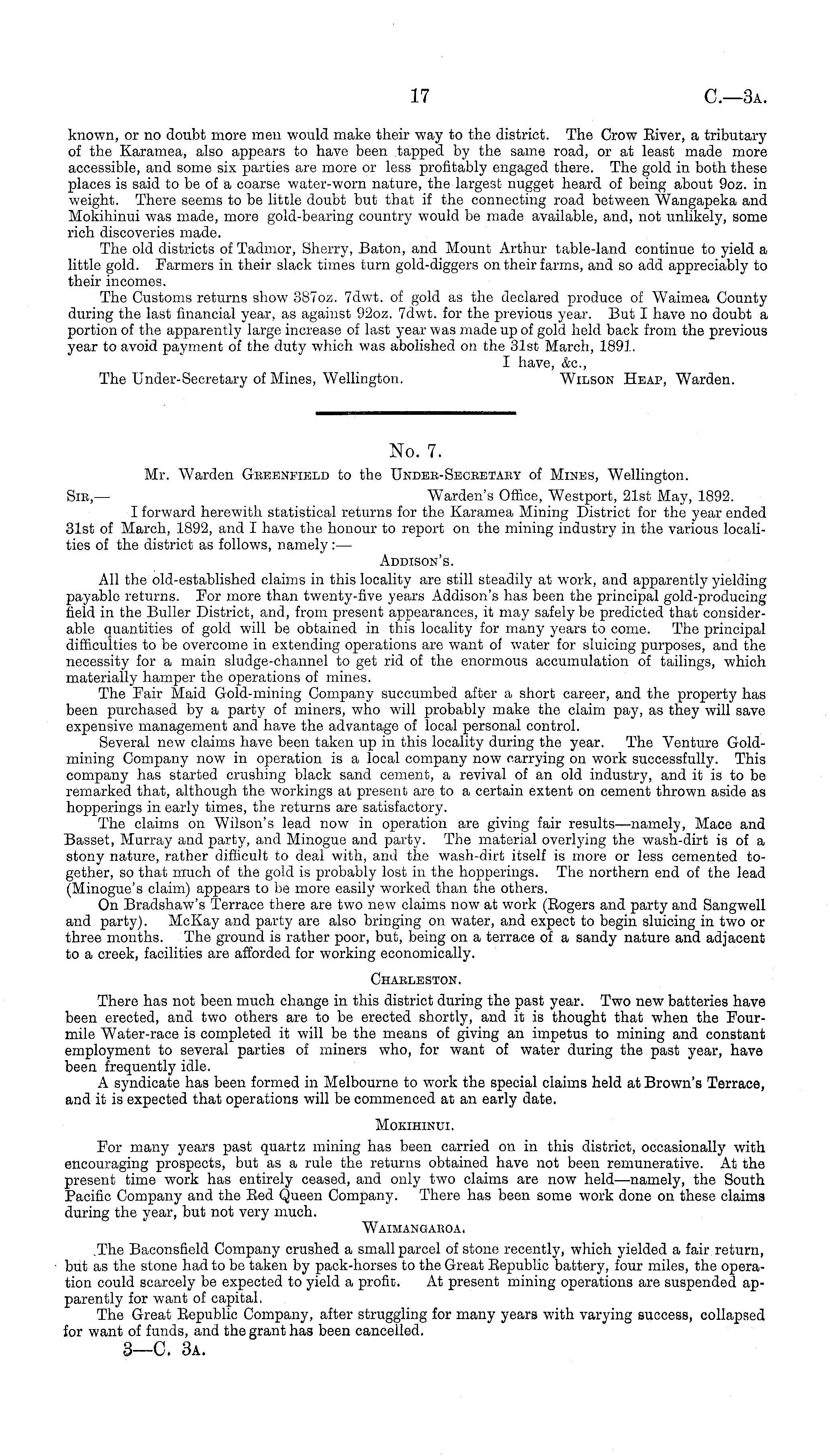 known, or no doubt more men would make their way to the district. The Crow Eiver, a tributary of the Karamea, also appears to have been tapped by the same road, or at least made more accessible, and some six parties are more or less profitably engaged there. The gold in both these places is said to be of a coarse water-worn nature, the largest nugget heard of being about 9oz. in weight. There seems to be little doubt but that if the connecting road between Wangapeka and Mokihinui was made, more gold-bearing country would be made available, and, not unlikely, some rich discoveries made. The old districts of Tadmor, Sherry, Baton, and Mount Arthur table-land continue to yield a little gold. Farmers in their slack times turn gold-diggers on their farms, and so add appreciably to their incomes. The Customs returns show 3870z. 7dwt. of gold as the declared produce of Waimea County during the last financial year, as against 920z. 7dwt. for the previous year. But I have no doubt a portion of the apparently large increase of last year was made up of gold held back from the previous year to avoid payment of the duty which was abolished on the 31st March, 1891. I have, &c, The Under-Secretary of Mines, Wellington. Wilson Heap, Warden.