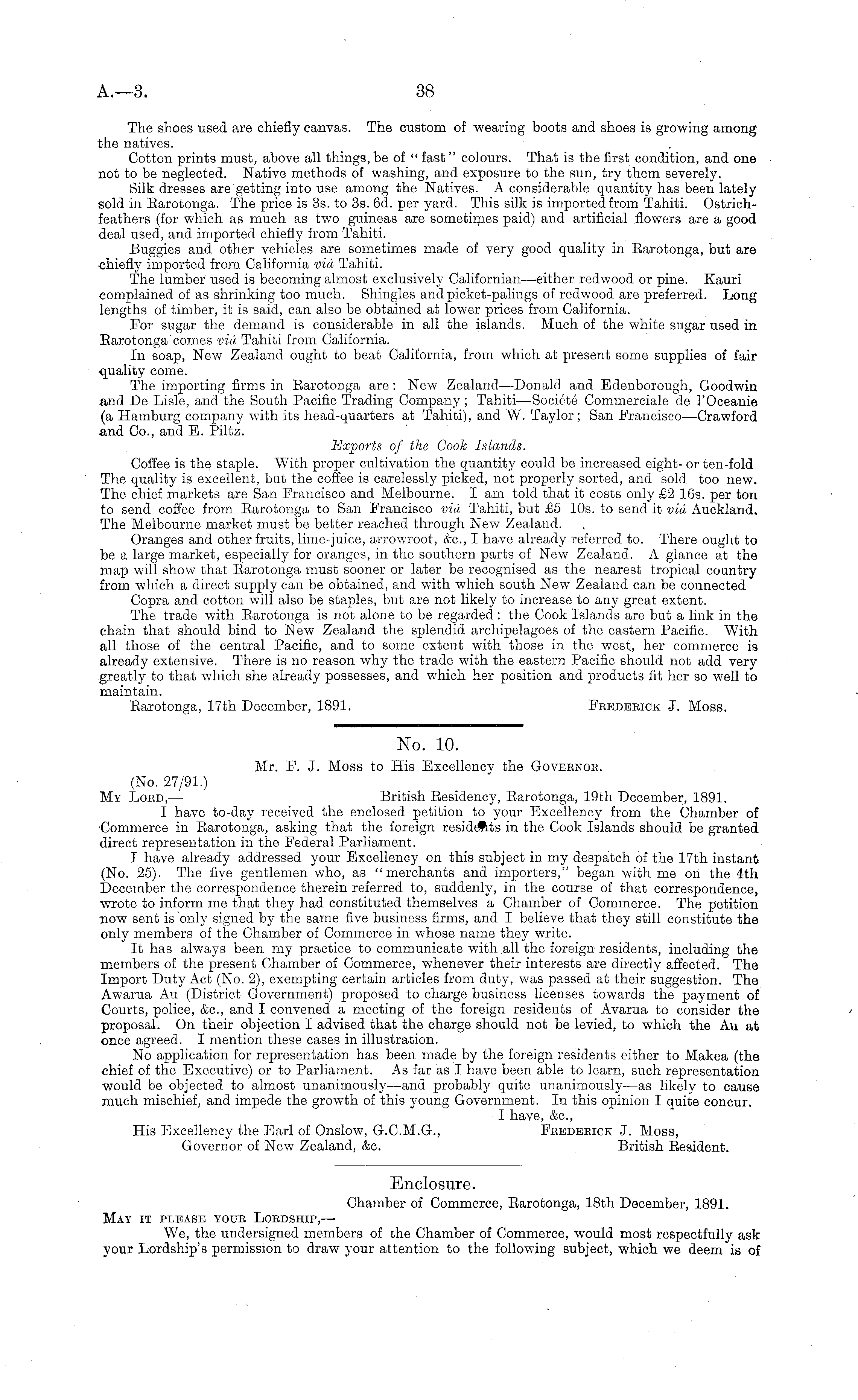 No. 10. Mr. F. J. Moss to His Excellency the Governor. (No. 27/91.) My Lord, — British Eesidency, Earotonga, 19th December, 1891. I have to-day received the enclosed petition to your Excellency from the Chamber of Commerce in Earotonga, asking that the foreign residents in the Cook Islands should be granted direct representation in the Federal Parliament. I have already addressed your Excellency on this subject in my despatch of the 17th instant (No. 25). The five gentlemen who, as "merchants and importers," began with me on the 4th December the correspondence therein referred to, suddenly, in the course of that correspondence, wrote to inform me that they had constituted themselves a Chamber of Commerce. The petition now sent is only signed by the same five business firms, and I believe that they still constitute the only members of the Chamber of Commerce in whose name they write. It has always been my practice to communicate with all the foreign residents, including the members of the present Chamber of Commerce, whenever their interests are directly affected. The Import Duty Act (No. 2), exempting certain articles from duty, was passed at their suggestion. The Awarua Au (District Government) proposed to charge business licenses towards the payment of Courts, police, &c, and I convened a meeting of the foreign residents of Avarua to consider the proposal. On their objection I advised that the charge should not be levied, to which the Au at once agreed. I mention these cases in illustration. No application for representation has been made by the foreign residents either to Makea (the chief of the Executive) or to Parliament. As far as I have been able to learn, such representation would be objected to almost unanimously—and probably quite unanimously—as likely to cause much mischief, and impede the growth of this young Government. In this opinion I quite concur. I have, &c, His Excellency the Earl of Onslow, G.C.M.G., Frederick J. Moss, Governor of New Zealand, &c. British Eesident.