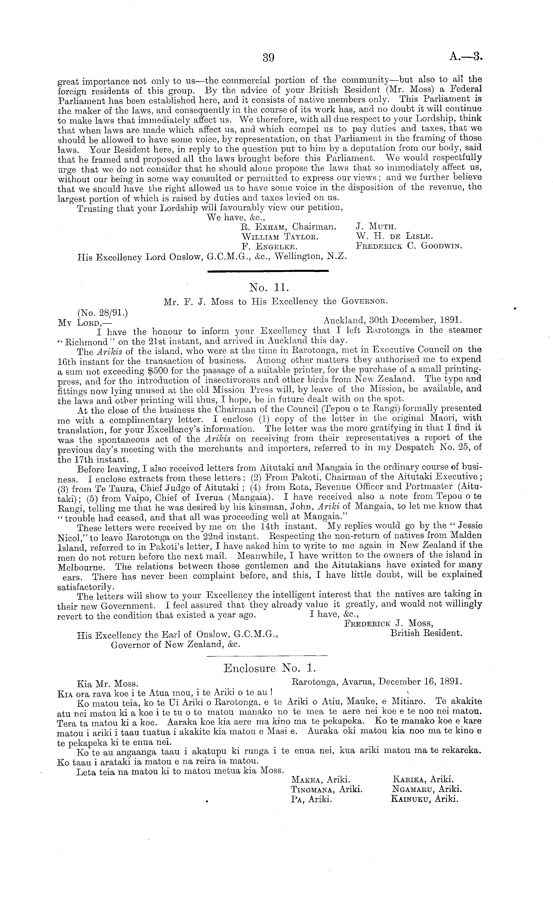 Enclosure No. 1. Kia Mr. Moss. Earotonga, Avarua, December 16, 1891. Kia ora rava koe i te Atua mou, i te Ariki o te au ! i Ko matou teia, ko te Ui Ariki o Earotonga, c te Ariki o Atiu, Mauke, c Mitiaro. Te_ akakite atu nei matou ki a koe i te tv o to matou manako no te mea te acre nei koe c te noo nei matou. Tera ta matou ki a koe. Aaraka koe kia acre ma kino ma te pekapeka. Ko te manako koe c kare matou i ariki i taau tuatua i akakite kia matou c Masi c. Auraka oki matou kia noo ma te kino c te pekapeka kite enua nei. Ko te au angaanga taau i akatupu ki runga i te enua nei, kua ariki matou ma te rekareka. Ko taau i arataki ia matou c na reira ia matou. Leta teia na matou ki to matou metua kia Moss. Makea, Ariki. Karika, Ariki. Tinomana, Ariki. Ngamaru, Ariki. Pa, Ariki. Kainuku, Ariki.