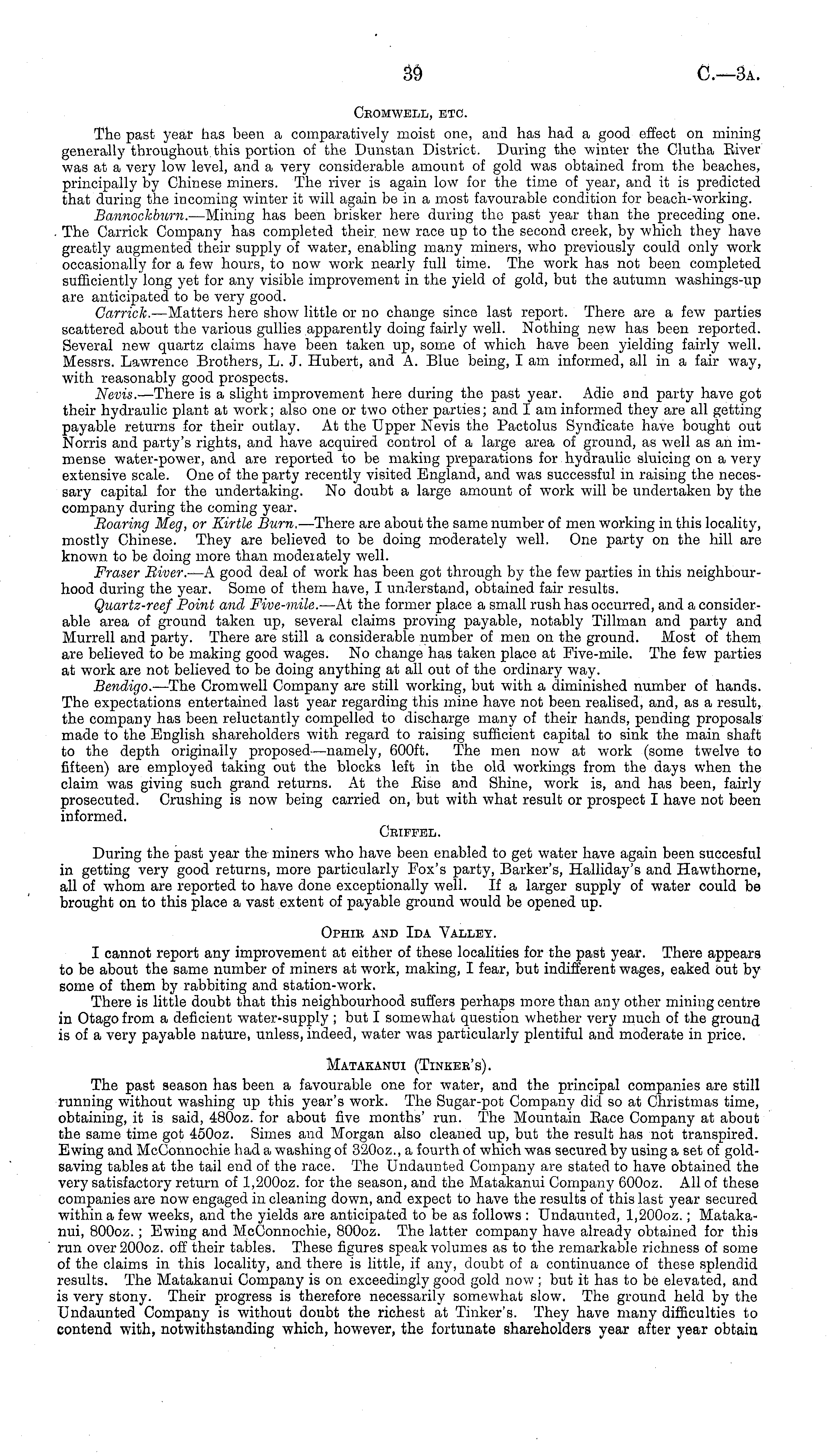 Ckomwell, etc. The past year has been a comparatively moist one, and has had a good effect on mining generally throughout this portion of the Dunstan District. During the winter the Clutha Eiver was at a very low level, and a very considerable amount of gold was obtained from the beaches, principally by Chinese miners. The river is again low for the time of year, and it is predicted that during the incoming winter it will again be in a most favourable condition for beach-working. Bannockburn. —Mining has been brisker here during the past year than the preceding one. . The Carrick Company has completed their new race up to the second creek, by which they have greatly augmented their supply of water, enabling many miners, who previously could only work occasionally for a few hours, to now work nearly full time. The work has not been completed sufficiently long yet for any visible improvement in the yield of gold, but the autumn washings-up are anticipated to be very good. Carrick. —Matters here show little or no change since last report. There are a few parties scattered about the various gullies apparently doing fairly well. Nothing new has been reported. Several new quartz claims have been taken up, some of which have been yielding fairly well. Messrs. Lawrence Brothers, L. J. Hubert, and A. Blue being, I am informed, all in a fair way, with reasonably good prospects. Nevis. —There is a slight improvement here during the past year. Adie and party have got their hydraulic plant at work; also one or two other parties; and I am informed they are all getting payable returns for their outlay. At the Upper Nevis the Pactolus Syndicate have bought out Norris and party's rights, and have acquired control of a large area of ground, as well as an immense water-power, and are reported to be making preparations for hydraulic sluicing on a very extensive scale. One of the party recently visited England, and was successful in raising the necessary capital for the undertaking. No doubt a large amount of work will be undertaken by the company during the coming year. Roaring Meg, or Kirtle Burn. —There are about the same number of men working in this locality, mostly Chinese. They are believed to be doing moderately well. One party on the hill are known to be doing more than moderately well. Fraser Biver. —A good deal of work has been got through by the few parties in this neighbourhood during the year. Some of them have, I understand, obtained fair results. Quartz-reef Point and Five-mile. —At the former place a small rush has occurred, and a considerable area of ground taken up, several claims proving payable, notably Tillman and party and Murrell and party. There are still a considerable number of men on the ground. Most of them are believed to be making good wages. No change has taken place at Five-mile. The few parties at work are not believed to be doing anything at all out of the ordinary way. Bendigo. —The Cromwell Company are still working, but with a diminished number of hands. The expectations entertained last year regarding this mine have not been realised, and, as a result, the company has been reluctantly compelled to discharge many of their hands, pending proposals made to the English shareholders with regard to raising sufficient capital to sink the main shaft to the depth originally proposed—namely, 600 ft. The men now at work (some twelve to fifteen) are employed taking out the blocks left in the old workings from the days when the claim was giving such grand returns. At the Eise and Shine, work is, and has been, fairly prosecuted. Crushing is now being carried on, but with what result or prospect I have not been informed. Ceiffel. During the past year the miners who have been enabled to get water have again been succesful in getting very good returns, more particularly Fox's party, Barker's, Halliday's and Hawthorne, all of whom are reported to have done exceptionally well. If a larger supply of water could be brought on to this place a vast extent of payable ground would be opened up. Ophie and Ida Valley. I cannot report any improvement at either of these localities for the past year. There appears to be about the same number of miners at work, making, I fear, but indifferent wages, caked but by some of them by rabbiting and station-work. There is little doubt that this neighbourhood suffers perhaps more than any other mining centre in Otago from a deficient water-supply ; but I somewhat question whether very much of the ground is of a very payable nature, unless, indeed, water was particularly plentiful and moderate in price. Matakanui (Tinkee's). The past season has been a favourable one for water, and the principal companies are still running without washing up this year's work. The Sugar-pot Company did so at Christmas time, obtaining, it is said, 480oz. for about five months' run. The Mountain Eace Company at about the same time got 4500z. Simes and Morgan also cleaned up, but the result has not transpired. Ewing and McConnochie had a washing of 3200z., a fourth of which was secured by using a set of goldsaving tables at the tail end of the race. The Undaunted Company are stated to have obtained the very satisfactory return of 1,2000z. for the season, and the Matakanui Company 600oz. All of these companies are now engaged in cleaning down, and expect to have the results of this last year secured within a few weeks, and the yields are anticipated to be as follows : Undaunted, l,200oz.; Matakanui, 800oz. ; Ewing and McConnochie, 800oz. The latter company have already obtained for this run over 200oz. off their tables. These figures speak volumes as to the remarkable richness of some of the claims in this locality, and there is little, if any, doubt of a continuance of these splendid results. The Matakanui Company is on exceedingly good gold now ; but it has to be elevated, and is very stony. Their progress is therefore necessarily somewhat slow. The ground held by 