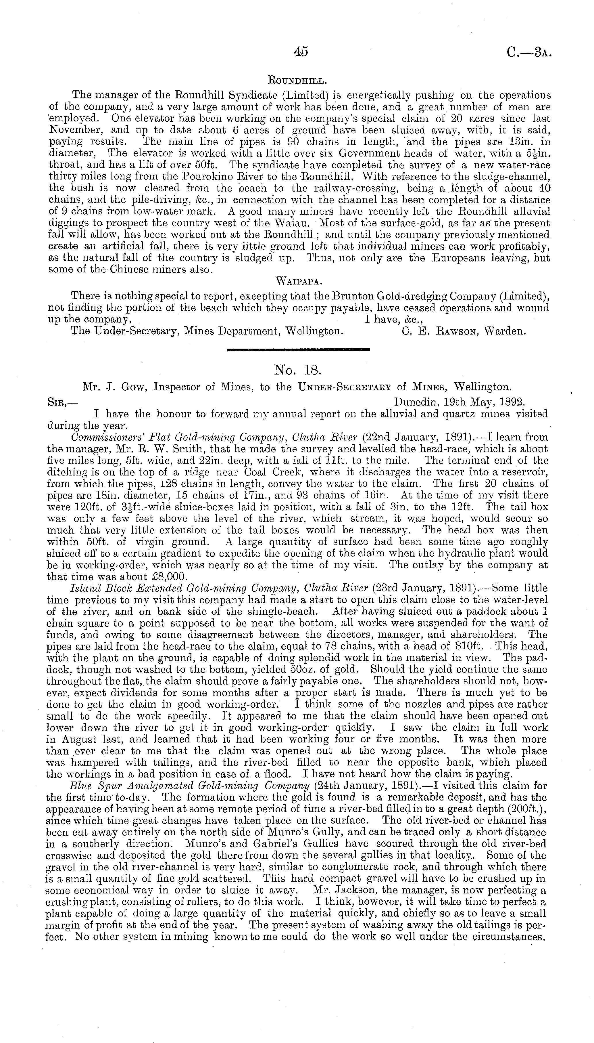No. 18. Mr. J. Gow, Inspector of Mines, to the Undee- Secretary of Mines, Wellington. Sib,— Dunedin, 19th May, 1892. I have the honour to forward my annual report on the alluvial and quartz mines visited during the year. Commissioners' Flat Gold-mining Company, Glutha River (22nd January, 1891). —I learn from the manager, Mr. E. W. Smith, that he made the survey and levelled the head-race, which is about five miles long, sft. wide, and 22in. deep, with a fall of lift, to the mile. The terminal end of the ditching is on the top of a ridge near Coal Creek, where it discharges the water into a reservoir, from which the pipes, 128 chains in length, convey the water to the claim. The first 20 chains of pipes are 18in. diameter, 15 chains of 17in., and 93 chains of 16in. At the time of my visit there were 120 ft. of 3-|ft.-wide sluice-boxes laid in position, with a fall of 3in. to the 12ft. The tail box was only a few feet above the level of the river, which stream, it was hoped, would scour so much that very little extension of the tail boxes would be necessary. The head box was then within 50ft. of virgin ground. A large quantity of surface had been some time ago roughly sluiced off to a certain gradient to expedite the opening of the claim when the hydraulic plant would be in working-order, which was nearly so at the time of my visit. The outlay by the company at that time was about £8,000. Island Block Extended Gold-mining Company, Glutha River (23rd January, 1891). —borne little time previous to my visit this company had made a start to open this claim close to the water-level of the river, and on bank side of the shingle-beach. After having sluiced out a paddock about 1 chain square to a point supposed to be near the bottom, all works were suspended for the want of funds, and owing to some disagreement between the directors, manager, and shareholders. The pipes are laid from the head-race to the claim, equal to 78 chains, with a head of 810 ft. This head, with the plant on the ground, is capable of doing splendid work in the material in view. The paddock, though not washed to the bottom, yielded 50oz. of gold. Should the yield continue the same throughout the flat, the claim should prove a fairly payable one. The shareholders should not, however, expect dividends for some months after a proper start is made. There is much yet to be done to get the claim in good working-order. I think some of the nozzles and pipes are rather small to do the work speedily. It appeared to me that the claim should have been opened out lower down the river to get it in good working-order quickly. I saw the claim in full work in August last, and learned that it had been working four or five months. It was then more than ever clear to me that the claim was opened out at the wrong place. The whole place was hampered with tailings, and the river-bed filled to near the opposite bank, which placed the workings in a bad position in case of a flood. I have not heard how the claim is paying. Blue Spur Amalgamated Gold-mining Company (24th January, 1891). —I visited this claim for the first time to-day. The formation where the gold is found is a remarkable deposit, and has the appearance of having been at some remote period of time a river-bed filled in to a great depth (200 ft.), since which time great changes have taken place on the surface. The old river-bed or channel has been cut away entirely on the north side of Munro's Gully, and can be traced only a short distance in a southerly direction. Munro's and Gabriel's Gullies have scoured through the old river-bed crosswise and deposited the gold there from down the several gullies in that locality. Some of the gravel in the old river-channel is very hard, similar to conglomerate rock, and through which there is a small quantity of fine gold scattered. This hard compact gravel will have to be crushed up in some economical way in order to sluice it away. Mr. Jackson, the manager, is now perfecting a crushing plant, consisting of rollers, to do this work. I think, however, it will take time to perfect a plant capable of doing a large quantity of the material quickly, and chiefly so as to leave a small margin of profit at the end of the year. The present system of washing away the old tailings is perfect. No other system in mining known to me could do the work so well under the circumstances.