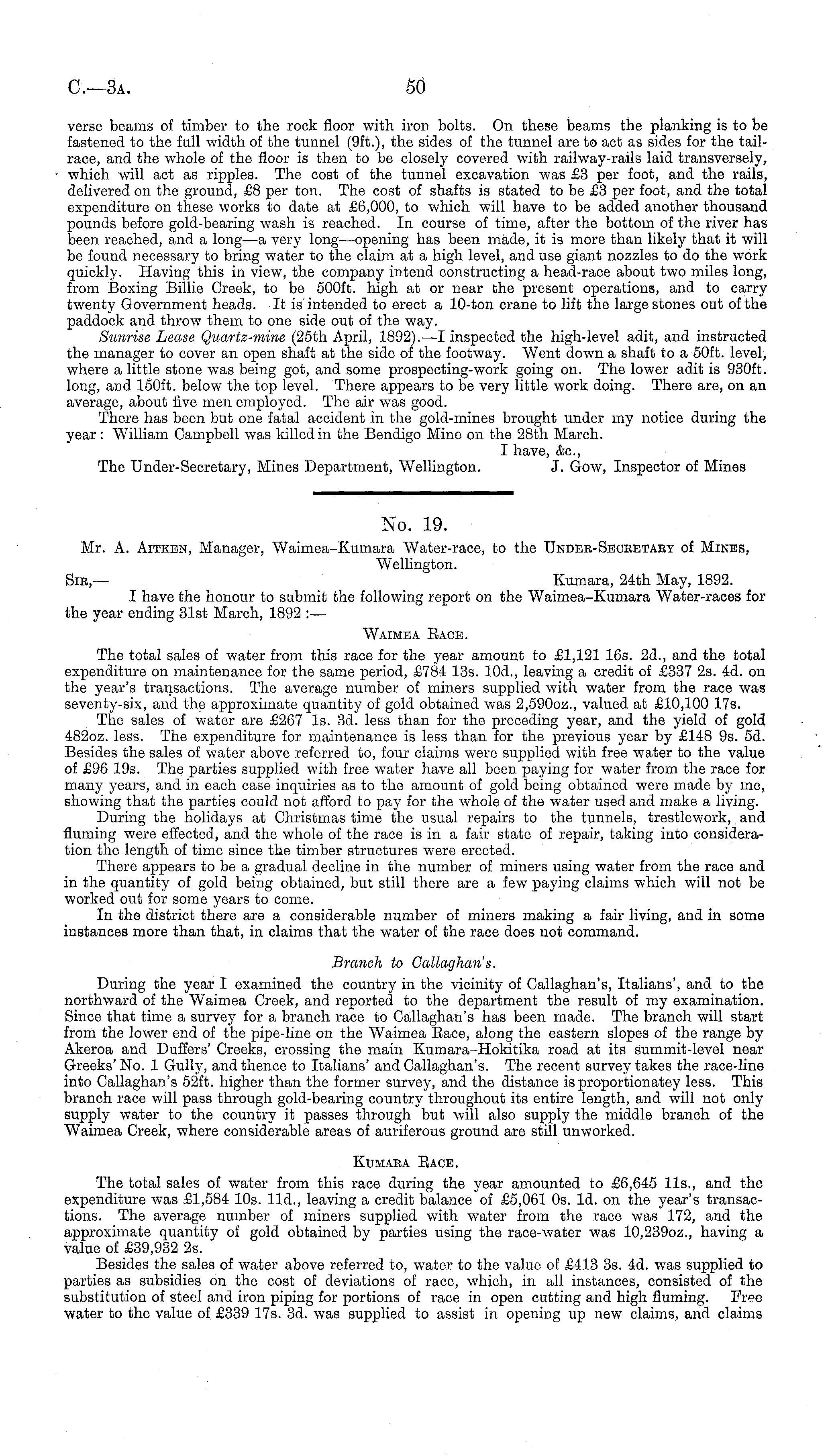 verse beams of timber to the rock floor with iron bolts. On these beams the planking is to be fastened to the full width of the tunnel (9ft.), the sides of the tunnel are to act as sides for the tailrace, and the whole of the floor is then to be closely covered with railway-rails laid transversely, which will act as ripples. The cost of the tunnel excavation was £3 per foot, and the rails, delivered on the ground, £8 per ton. The cost of shafts is stated to be £3 per foot, and the total expenditure on these works to date at £6,000, to which will have to be added another thousand pounds before gold-bearing wash is reached. In course of time, after the bottom of the river has been reached, and a long —a very long —opening has been made, it is more than likely that it will be found necessary to bring water to the claim at a high level, and use giant nozzles to do the work quickly. Having this in view, the company intend constructing a head-race about two miles long, from Boxing Billie Creek, to be 500 ft. high at or near the present operations, and to carry twenty Government heads. It is intended to erect a 10-ton crane to lift the large stones out of the paddock and throw them to one side out of the way. Sunrise Lease Quartz-mine (25th April, 1892). —I inspected the high-level adit, and instructed the manager to cover an open shaft at the side of the footway. Went down a shaft to a 50ft. level, where a little stone was being got, and some prospecting-work going on. The lower adit is 930 ft. long, and 150 ft. below the top level. There appears to be very little work doing. There are, on an average, about five men employed. The air was good. There has been but one fatal accident in the gold-mines brought under my notice during the year: William Campbell was killed in the Bendigo Mine on the 28th March. I have, &c, The Under-Secretary, Mines Department, Wellington. J. Gow, Inspector of Mines