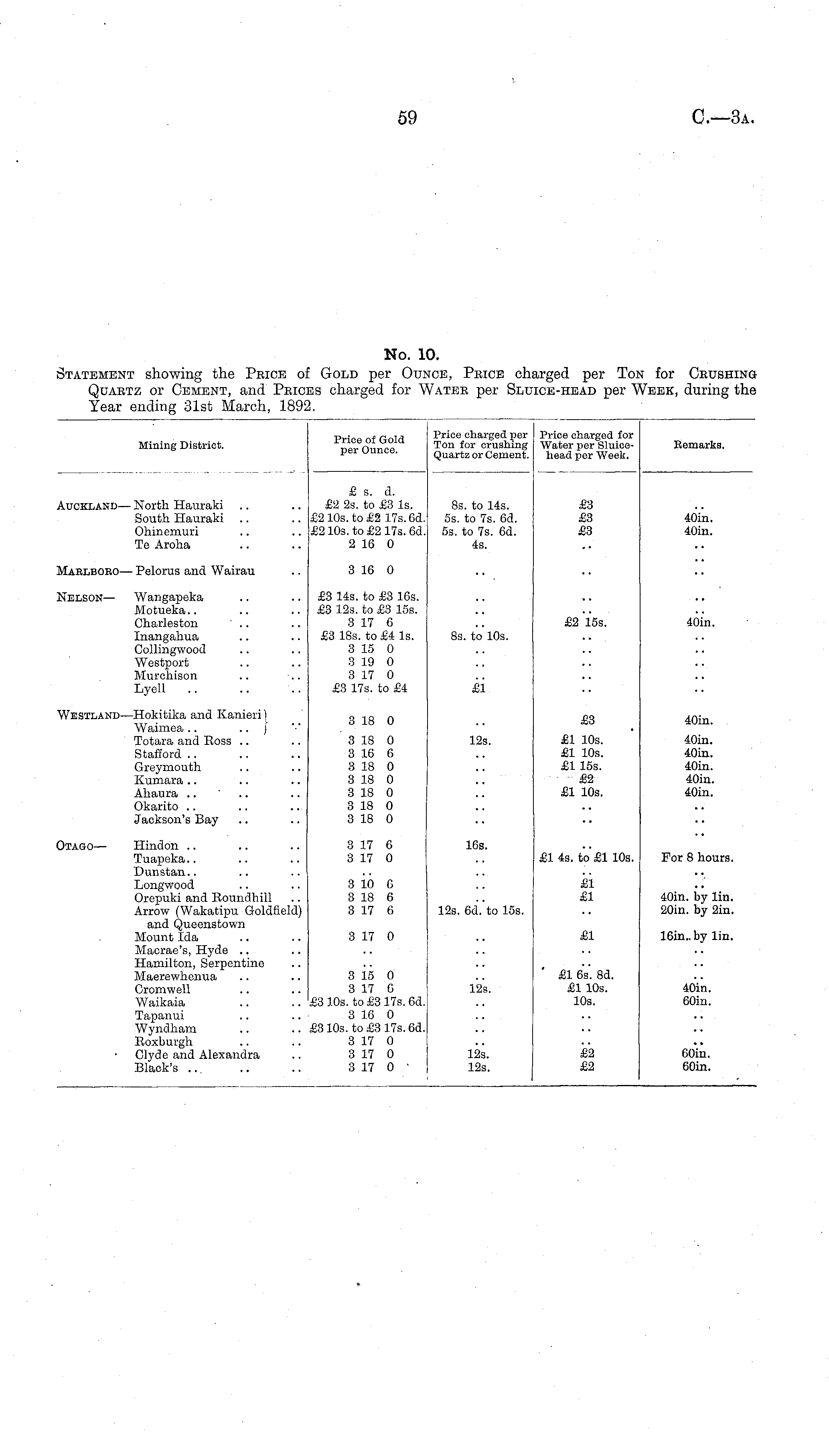 No. 10. Statement showing the Price of Gold per Ounce, Price charged per Ton for Crushing Quartz or Cement, and Prices charged for Water per Sluice-head per Week, during the Year ending 31st March, 1892.