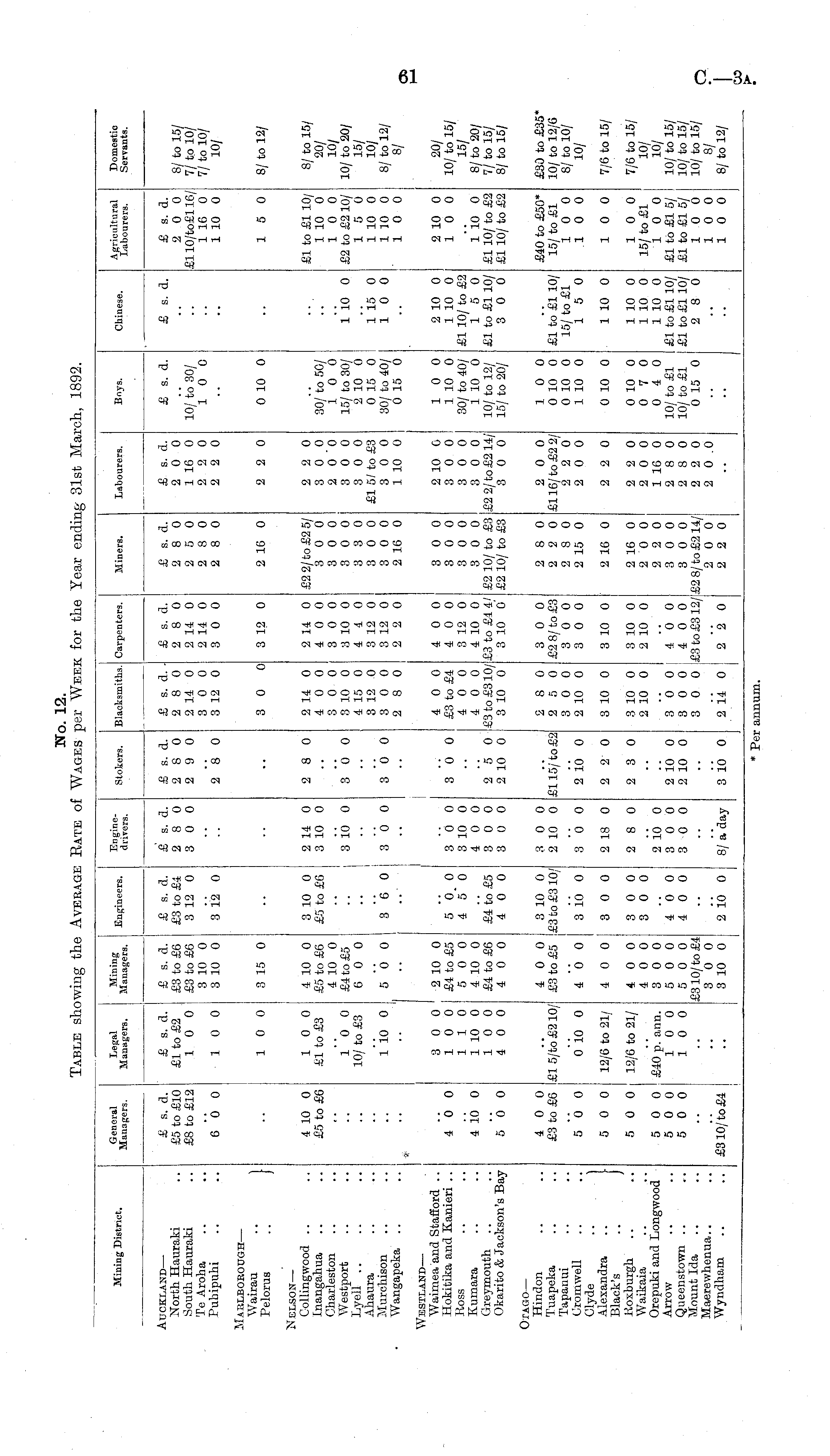 Mining District, General Managers. Legal Managers. Mining Managers. Engineers. Enginedrivers. Stokers. Blacksmiths. Carpenters. Miners. Labourers. Boys. Chinese. Agricultural Labourers. Domestic Servants. Auckland — North Hauraki South Hauraki Tβ Aroha Puhipuhi £ s. d. £5 to £10 £8 to £12 £ s. d. £1 to £2 10 0 £ s. d. £3 to £6 £3 to £6 3 10 0 3 10 0 £ s. a. £3 to £4 3 12 0 £ s. d. 2 8 0 3 0 0 £ s. d. 2 8 0 2 9 0 £ s. d. 2 8 0 2 14 0 3 0 0 3 12 0 £ s. d. 2 8 0 2 14 0 2 14 0 3 0 0 £ s. d. 2 8 0 2 5 0 2 8 0 2 8 0 £ s. a. 2 0 0 1 16 0 2 2 0 2 2 0 £ S. d. 10/ to 30/ 10 0 £ s. d. £ s. d. 2 0 0 £110/to£116/ 1 16 0 1 10 0 8/ to 15/ 7/ to 10/ 7/ to 10/ 10/ 6 0 0 10 0 3 12 0 2 '8 0 JIablbobough — Wairau .. ) Pelorus 10 0 3 15 0 3 0 0 3 12 0 2 16 0 2 2 0 0 10 0 15 0 8/ to 12/ Nelson — Collingwood .. Inangahua Charleston Westport Lyell .. Ahaura Murchison Wangapeka .. 4 10 0 £5 to £6 10 0 £1 to £3 10 0 10/ to £3 4 10 0 £5 to £6 4 10 0 £4 to £5 6 0 0 3 10 0 £5 to £6 •• I 2 14 0 3 10 0 3 10 0 2 8 0 3 0 0 2 14 0 4 0 0 3 0 0 3 10 0 4 15 0 3 12 0 3 0 0 2 8 0 2 14 0 4 0 0 3 0 0 3 10 0 4 4 0 3 12 0 3 12 0 2 2 0 I £2 2/to £2 5/ 3 0 0 3 0 0 3 0 0 3 3 0 3 0 0 3 0 0 2 16 0 2 2 0 3 0 0 2 0 '0 3 0 0 3 0 0 £1 5/ to £3 3 0 0 1 10 0 30/ to 50/ 10 0 15/ to 30/ 2 10 0 0 15 0 30/ to 40/ 0 15 0 1 10 0 £1 to £1 10/ 1 10 0 10 0 £2 to £2 10/ 15 0 1 10 0 1 10 0 10 0 8/ to 15/ 20/ 10/ 10/ to 20/ 15/ 10/ 8/ to 12/ 8/ 1 10 0 5 '6 0 1 3 6 0 3 0 0 3 0 0 l'is o 10 0 •• I 1 I i I •• Westland — Waimea and Stafford .. Hokitika and Kanieri .. Koss Kumara Greymouth Okarito & -Jackson's Bay 4 0 0 4 10 0 3 0 0 10 0 110 1 10 0 10 0 4 0 0 ' 2 10 0 £4 to £5 5 0 0 4 10 0 £4 to £6 4 0 0 5 0 0 4 5 - 0 3 0 0 3 10 0 4 0 0 3 0 0 3 0 0 3 0 0 '■ 4 0 0 £3 to £4 4 0 0 4 0 0 £3 to £310/ 3 10 0 4 0 0 4 0 0 3 12 0 4 10 0 £3 to £4 H 3 10 0' 3 0 0 3 0 0 3 0 0 3 0 0 £2 10/ to £3 £2 10/ to £3 2 10 0 3 0 0 3 0 0 3 0 0 £2 2/to £2 14/ 3 0 0 10 0 1 10 0 30/ to 40/ 1 10 0 10/ to 12/ 15/ to 20/ 2 10 0 1 10 0 £1 10/ to £2 15 0 £1 to £1 10/ 3 0 0 2 10 0 10 0 1 10 0 £1 10/ to £2 £1 10/ to £2 20/ 10/ to 15/ 15/ 8/to 20/ 7/ to 15/ 8/ to 15/ 5 '6 0 £4 to £5 4 0 0 2 5 0 2 10 0 Otago — Hindon Tuapeka Tapanui Cromwell Clyde .. 1 Alexandra .. I Black's .. j Koxburgk Waikaia Orepuki and Longwood Arrow Queenstown Mount Ida Maerewhenua Wyndham 4 0 0 £3 to £6 I 5 0 0 5 0 0 5 0 0 l£l 5/to'£2 10/ o'io o 12/6 to 21/ 12/6 to 21/ 4 0 0 £3 to £5 4 0 0 1 4 0 0 4 0 0 4 0 0 3 0 0 5 0 0 5 0 0 £310/ to £4 3 0 0 3 10 0 3 10 0 !£3 to £310/ 3 10 0 3 0 0 3 0 0 3 0 0 3 0 0 2 10 0 3 0 0 2 18 0 2 8 0 £115/ to £21 2 10 0 2 2 0 2 3 0 2 8 0 2 5 0 3 0 0 2 10 0 3 10 0 3 10 0 2 10 0 3 0 0 £2 8/ to £3 3 0 0 3 0 0 3 10 0 3 10 0 2 10 0 2 8 0 2 2 0 2 8 0 2 15 0 2 16 0 2 16 0 2 0 0 2 2 0 3 0 0 3 0 0 £2 8/to £214/ 2 0 0 2 2 0 2 0 0 £116/ to £2 2/ 2 2 0 2 0 0 2 2 0 2 2 0 2 0 0 1 16 0 2 8 0 2 8 0 2 2 0 2 0 .0 10 0 0 10 0 0 10 0 1 10 0 0 10 0 0 10 0 0 7 0 0 4 0 10/ to £1 10/ to £1 0 15 0 £1 to £1 10/ 15/ to £1 15 0 1 10 0 1 10 0 1 10 0 1 10 0 £1 to £1 10/ £1 to £1 10/ 2 8 0 £40 to £50* 15/ to £1 10 0 10 0 10 0 10 0 15/ to £1 10 0 1 £1 to £1 5/ i £1 to £1 5/ I 1 0 0 I 10 0! 10 0 £30 to £35' 10/ to 12/G 8/to 10/ 10/ 7/6 to 15/ 7/6 to 15/ 10/ 10/ 10/ to 15/ 10/ to 15/ 10/ to 15/ 8/ 8/ to 12/ 5 0 0 5 0 0 5 0 0 £40 p. ann. 10 0 10 0 4 0 0 4 0 0 2 10 0 3 0 0 3 0 0 2 10 0 2 10 0 3 0 0 i 3 0 0 3 0 0; I 4 0 0 4 0 0 £3 to £312/ '■ £3 10/ to £4 I 2 10 0 8/ a day 3 10 0 2 14 0 I I 2 2 0 .. * Pel ,urn