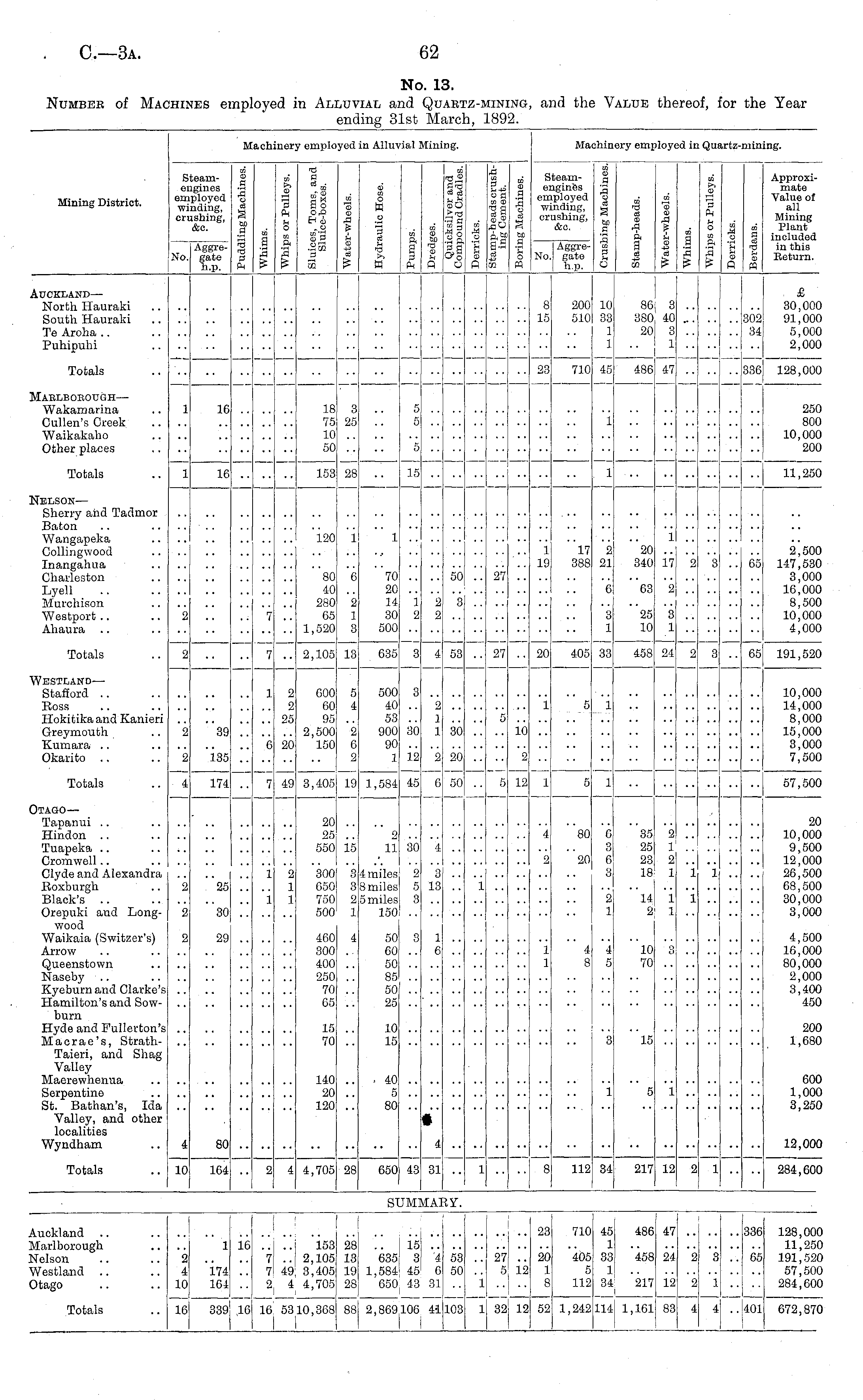 No. 13. Number of Machines employed in Alluvial and Quartz-mining, and the Value thereof, for the Year ending 31st March, 1892.
