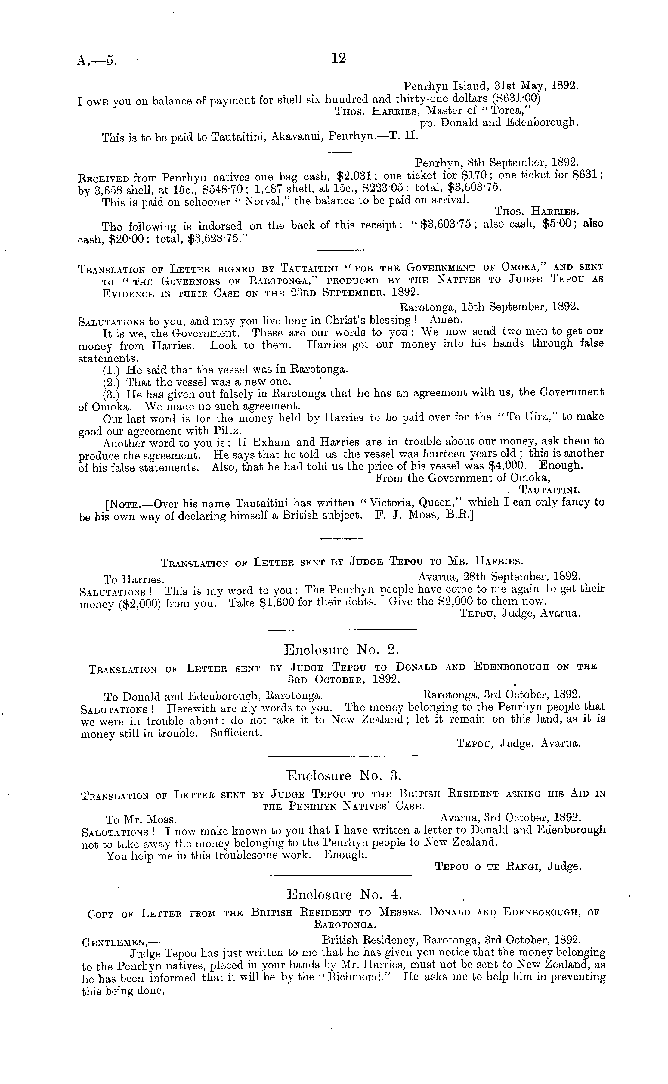 Enclosure No. 2. Teanslation of Lettee sent by Judge Tepou to Donald and Edenboeough on the 3ed Octobee, 1892. To Donald and Edenborough, Earotonga. Earotonga, 3rd October, 1892. Salutations ! Herewith are my words to you. The money belonging to the Penrhyn people that we were in trouble about: do not take it to New Zealand; let it remain on this land, as it is money still in trouble. Sufficient. Tepou, Judge, Avarua.
