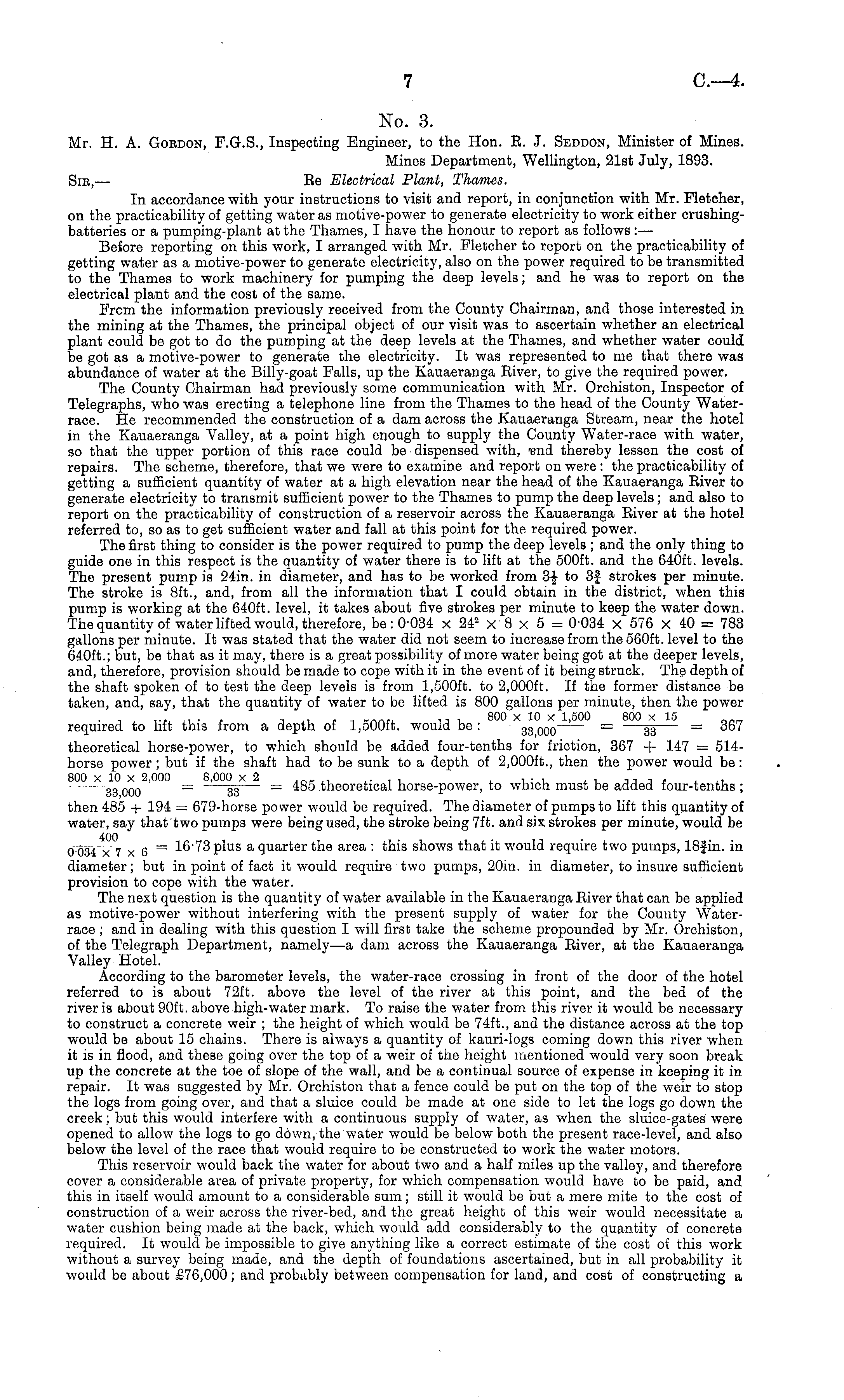 No. 3. Mr. H. A. Gordon, F.G.S., Inspecting Engineer, to the Hon. E. J. Seddon, Minister of Mines. Mines Department, Wellington, 21st July, 1893. Sir, — Ec Electrical Plant, Thames. In accordance with your instructions to visit and report, in conjunction with Mr. Fletcher, on the practicability of getting water as motive-power to generate electricity to work either crushingbatteries or a pumping-plant at the Thames, I have the honour to report as follows : — Before reporting on this work, I arranged with Mr. Fletcher to report on the practicability of getting water as a motive-power to generate electricity, also on the power required to be transmitted to the Thames to work machinery for pumping the deep levels; and he was to report on the electrical plant and the cost of the same. From the information previously received from the County Chairman, and those interested in the mining at the Thames, the principal object of our visit was to ascertain whether an electrical plant could be got to do the pumping at the deep levels at the Thames, and whether water could be got as a motive-power to generate the electricity. It was represented to me that there was abundance of water at the Billy-goat Falls, up the Kauaeranga Eiver, to give the required power. The County Chairman had previously some communication with Mr. Orchiston, Inspector of Telegraphs, who was erecting a telephone line from the Thames to the head of the County Waterrace. He recommended the construction of a dam across the Kauaeranga Stream, near the hotel in the Kauaeranga Valley, at a point high enough to supply the County Water-race with water, so that the upper portion of this race could be dispensed with, wid thereby lessen the cost of repairs. The scheme, therefore, that we were to examine and report on were : the practicability of getting a sufficient quantity of water at a high elevation near the head of the Kauaeranga Eiver to generate electricity to transmit sufficient power to the Thames to pump the deep levels; and also to report on the practicability of construction of a reservoir across the Kauaeranga Eiver at the hotel referred to, so as to get sufficient water and fall at this point for the required power. The first thing to consider is the power required to pump the deep levels ; and the only thing to guide one in this respect is the quantity of water there is to lift at the 500 ft. and the 640 ft. levels. The present pump is 24in. in diameter, and has to be worked from to 3f strokes per minute. The stroke is Bft., and, from all the information that I could obtain in the district, when this pump is working at the 640 ft. level, it takes about five strokes per minute to keep the water down. The quantity of water lifted would, therefore, be : 0-034 x 24 2 x 8 x 5 = 0-034 x 576 x 40 = 783 gallons per minute. It was stated that the water did not seem to increase from the 560 ft. level to the 640 ft.; but, be that as it may, there is a great possibility of more water being got at the deeper levels, and, therefore, provision should be made to cope with it in the event of it being struck. The depth of the shaft spoken of to test the deep levels is from 1,500 ft. to 2,000 ft. If the former distance be taken, and, say, that the quantity of water to be lifted is 800 gallons per minute, then the power required to lift this from a depth of 1,500 ft. would be: 33 000 "' = —33 — = 367 theoretical horse-power, to which should be added four-tenths for friction, 367 + 147 = 514---horse power; but if the shaft had to be sunk to a depth of 2,000 ft., then the power would be: -QQQQ ' = ——go — = 485 theoretical horse-power, to which must be added four-tenths; then 485 + 194 = 679-horse power would be required. The diameter of pumps to lift this quantity of water, say that two pumps were being used, the stroke being 7ft. and six strokes per minute, would be 0034 x7Y6 = 16'73plus a quarter the area : this shows that it would require two pumps, 18fin. in diameter; but in point of fact it would require two pumps, 20in. in diameter, to insure sufficient provision to cope with the water. The next question is the quantity of water available in the Kauaeranga Eiver that can be applied as motive-power without interfering with the present supply of water for the County Waterrace ; and in dealing with this question I will first take the scheme propounded by Mr. Orchiston, of the Telegraph Department, namely —a dam across the Kauaeranga Eiver, at the Kauaeranga Valley Hotel. According to the barometer levels, the water-race crossing in front of the door of the hotel referred to is about 72ft. above the level of the river at this point, and the bed of the river is about 90ft. above high-water mark. To raise the water from this river it would be necessary to construct a concrete weir ; the height of which would be 74ft., and the distance across at the top would be about 15 chains. There is always a quantity of kauri-logs coming down this river when it is in flood, and these going over the top of a weir of the height mentioned would very soon break up the concrete at the toe of slope of the wall, and be a continual source of expense in keeping it in repair. It was suggested by Mr. Orchiston that a fence could be put on the top of the weir to stop the logs from going over, and that a sluice could be made at one side to let the logs go down the creek; but this would interfere with a continuous supply of water, as when the sluice-gates were opened to allow the logs to go down, the water would be below both the present race-level, and also below the level of the race that would require to be constructed to work the water motors. This reservoir would back the water for about two and a half miles up the valley, and therefore cover a considerable area of private property, for which compensation would have to be paid, and this in itself would amount to a considerable sum; still it would be but a mere mite to the cost of construction of a we