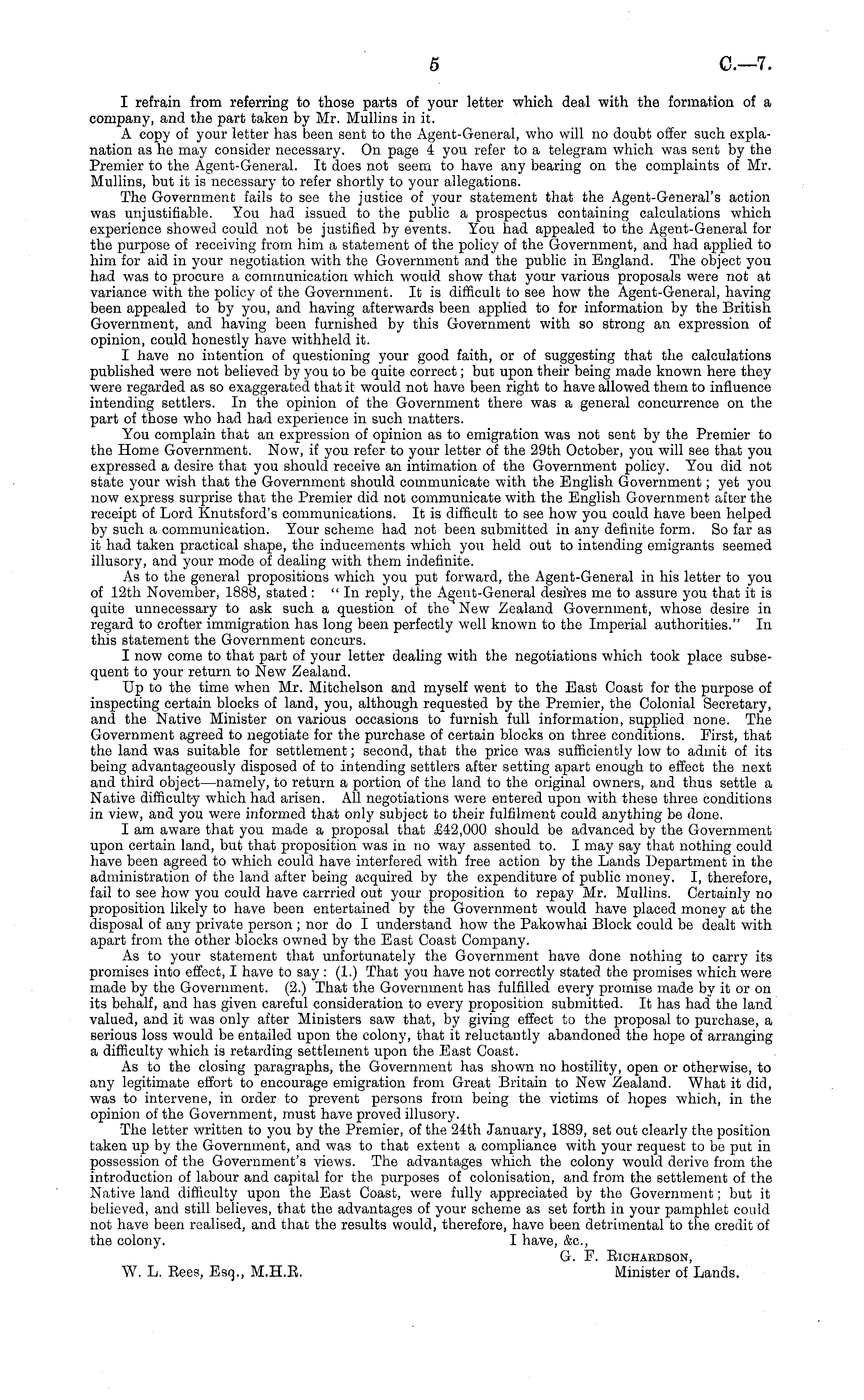 I refrain from referring to those parts of your letter which deal with the formation of a company, and the part taken by Mr. Mullins in it. A copy of your letter has been sent to the Agent-General, who will no doubt offer such explanation as he may consider necessary. On page 4 you refer to a telegram which was sent by the Premier to the Agent-General. It does not seem to have any bearing on the complaints of Mr. Mullins, but it is necessary to refer shortly to your allegations. The Government fails to see the justice of your statement that the Agent-General's action was unjustifiable. You had issued to the public a prospectus containing calculations which experience showed could not be justified by events. You had appealed to the Agent-General for the purpose of receiving from him a statement of the policy of the Government, and had applied to him for aid in your negotiation with the Government and the public in England. The object you had was to procure a communication which would show that your various proposals were not at variance with the policy of the Government. It is difficult to see how the Agent-General, having been appealed to by you, and having afterwards been applied to for information by the British Government, and having been furnished by this Government with so strong an expression of opinion, could honestly have withheld it. I have no intention of questioning your good faith, or of suggesting that the calculations published were not believed by you to be quite correct; but upon their being made known here they were regarded as so exaggerated that it would not have been right to have allowed them to influence intending settlers. In the opinion of the Government there was a general concurrence on the part of those who had had experience in such matters. You complain that an expression of opinion as to emigration was not sent by the Premier to the Home Government. Now, if you refer to your letter of the 29th October, you will see that you expressed a desire that you should receive an intimation of the Government policy. You did not state your wish that the Government should communicate with the English Government ; yet you now express surprise that the Premier did not communicate with the English Government after the receipt of Lord Knutsford's communications. It is difficult to see how you could have been helped by such a communication. Your scheme had not been submitted in any definite form. So far as it had taken practical shape, the inducements which you held out to intending emigrants seemed illusory, and your mode of dealing with them indefinite. As to the general propositions which you put forward, the Agent-General in his letter to you of 12th November, 1888, stated: "In reply, the Agent-General desires me to assure you that it is quite unnecessary to ask such a question of the New Zealand Government, whose desire in regard to crofter immigration has long been perfectly well known to the Imperial authorities." In this statement the Government concurs. I now come to that part of your letter dealing with the negotiations which took place subsequent to your return to New Zealand. Up to the time when Mr. Mitchelson and myself went to the East Coast for the purpose of inspecting certain blocks of land, you, although requested by the Premier, the Colonial Secretary, and the Native Minister on various occasions to furnish full information, supplied none. The Government agreed to negotiate for the purchase of certain blocks on three conditions. First, that the land was suitable for settlement; second, that the price was sufficiently low to admit of its being advantageously disposed of to intending settlers after setting apart enough to effect the next and third object—namely, to return a portion of the land to the original owners, and thus settle a Native difficulty which had arisen. All negotiations were entered upon with these three conditions in view, and you were informed that only subject to their fulfilment could anything be done. I am aware that you made a proposal that £42,000 should be advanced by the Government upon certain land, but that proposition was in no way assented to. I may say that nothing could have been agreed to which could have interfered with free action by the Lands Department in the administration of the land after being acquired by the expenditure of public money. I, therefore, fail to see how you could have carrried out your proposition to repay Mr. Mullins. Certainly no proposition likely to have been entertained by the Government would have placed money at the disposal of any private person ; nor do I understand how the Pakowhai Block could be dealt with apart from the other blocks owned by the East Coast Company. As to your statement that unfortunately the Government have done nothing to carry its promises into effect, I have to say : (1.) That you have not correctly stated the promises which were made by the Government. (2.) That the Government has fulfilled every promise made by it or on its behalf, and has given careful consideration to every proposition submitted. It has had the land valued, and it was only after Ministers saw that, by giving effect to the proposal to purchase, a serious loss would be entailed upon the colony, that it reluctantly abandoned the hope of arranging a difficulty which is retarding settlement upon the East Coast. As to the closing paragraphs, the Government has shown no hostility, open or otherwise, to any legitimate effort to encourage emigration from Great Britain to New Zealand. What it did, was to intervene, in order to prevent persons from being the victims of hopes which, in the opinion of the Government, must have proved illusory. The letter written to you by the Premier, of the 24th January, 1889, set out clearly the position taken up by the Government, and was to that extent a compliance with your request to be put in possession of the Government's views. The advantages which the colony would deriv
