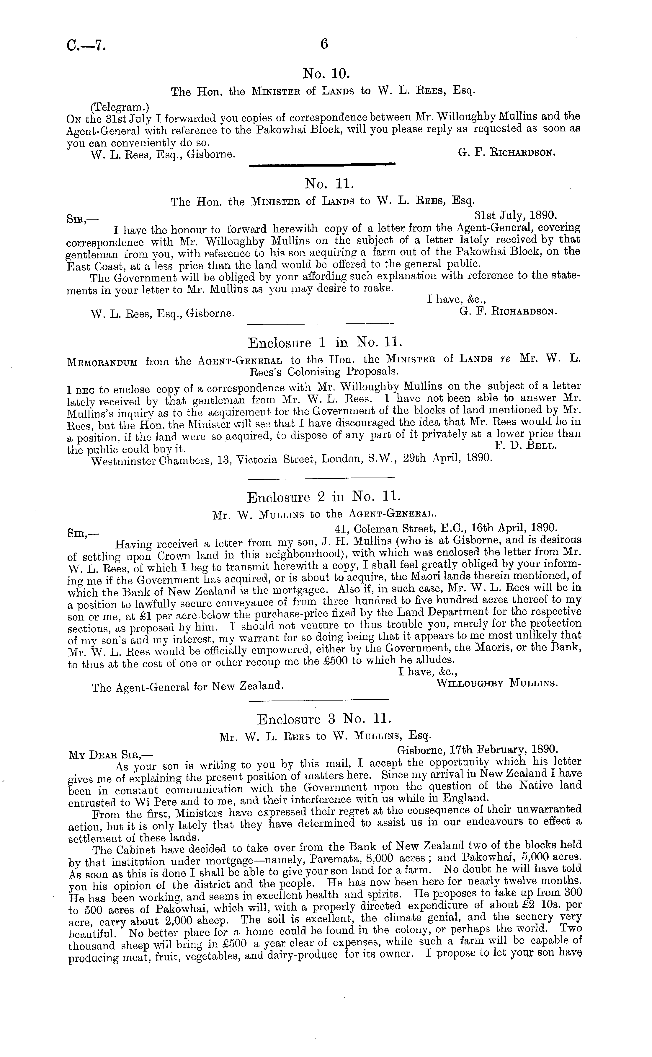 Enclosure 3 No. 11. Mr. W. L. Eees to W. Mullins, Esq. My Dear Sir,- ~ T Gisborne, 17th February, 1890 As your son is writing to you by this mail, I accept the opportunity which his letter gives me of explaining the present position'of matters here. Since my arrival in New Zealand I have been in constant communication with the Government upon the question of the Native land entrusted to Wi Pere and to me, and their interference with us while m England. From the first Ministers have expressed their regret at the consequence of their unwarranted action, but it is only lately that they have determined to assist us in our endeavours to effect a settlement of these lands. The Cabinet have decided to take over from the Bank of New Zealand two of the blocks held by that institution under mortgage-namely, Paremata, 8,000 acres ; and Pakowhai, 5 000 acres As soon as this is done I shall be able to give your son land for a farm. No doubt he will have told you his opinion of the district and the people. He has now been here for nearly twelve months He has been working, and seems in excellent health and spirits. He proposes to take up from 300 to 500 acres of Pakowhai, which will, with a properly directed expenditure of about £2 10s. per acre carry about 2,000 sheep. The soil is excellent, the climate genial, and the scenery very beautiful No better place for a home could be found in the colony, or perhaps the world. Iwo thousand sheep will bring in £500 a year clear of expenses, while such a farm will be capable of producing meat, fruit, vegetables, and dairy-produce for its owner. I propose to let your son have