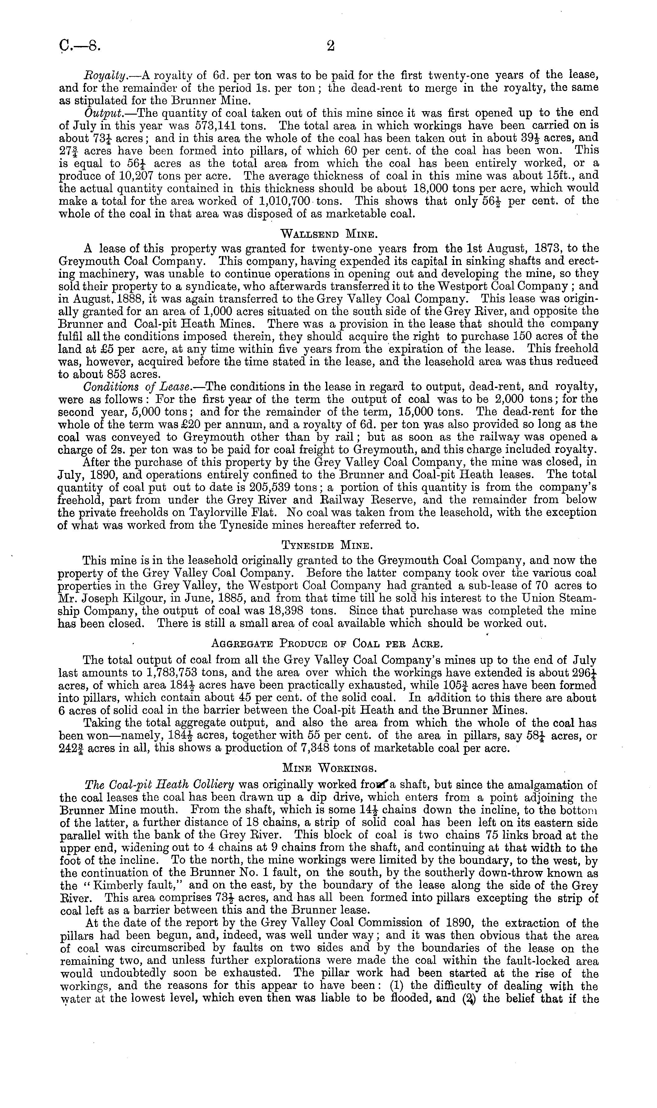 Royalty. —A royalty of 6d. per ton was to be paid for the first twenty-one years of the lease, and for the remainder of the period Is. per ton; the dead-rent to merge in the royalty, the same as stipulated for the Brunner Mine. Output. —The quantity of coal taken out of this mine since it was first opened up to the end of July in this year was 573,141 tons. The total area in which workings have been carried on is about 73J acres; and in this area the whole of the coal has been taken out in about 39J acres, and 27-f acres have been formed into pillars, of which 60 per cent, of the coal has been won. This is equal to 56J acres as the total area from which the coal has been entirely worked, or a produce of 10,207 tons per acre. The average thickness of coal in this mine was about 15ft., and the actual quantity contained in this thickness should be about 18,000 tons per acre, which would make a total for the area worked of 1,010,700 tons. This shows that only per cent, of the whole of the coal in that area was disposed, of as marketable coal. Wallsend Mine. A lease of this property was granted for twenty-one years from the Ist August, 1873, to the Greymouth Coal Company. This company, having expended its capital in sinking shafts and erecting machinery, was unable to continue operations in opening out and developing the mine, so they sold their property to a syndicate, who afterwards transferred it to the Westport Coal Company ; and in August, 1888, it was again transferred to the Grey Valley Coal Company. This lease was originally granted for an area of 1,000 acres situated on the south side of the Grey Eiver, and opposite the Brunner and Coal-pit Heath Mines. There was a provision in the lease that should the company fulfil all the conditions imposed therein, they should acquire the right to purchase 150 acres of the land at £5 per acre, at any time within five years from the expiration of the lease. This freehold was, however, acquired before the time stated in the lease, and the leasehold area was thus reduced to about 853 acres. Conditions of Lease. —The conditions in the lease in regard to output, dead-rent, and royalty, were as follows : For the first year of the term the output of coal was to be 2,000 tons; for the second year, 5,000 tons; and for the remainder of the term, 15,000 tons. The dead-rent for the whole of the term was £20 per annum, and a royalty of 6d. per ton was also provided so long as tne coal was conveyed to Greymouth other than by rail; but as soon as the railway was opened a charge of 2s. per ton was to be paid for coal freight to Greymouth, and this charge included royalty. After the purchase of this property by the Grey Valley Coal Company, the mine was closed, in July, 1890, and operations entirely confined to the Brunner and Coal-pit Heath leases. The total quantity of coal put out to date is 205,539 tons ; a portion of this quantity is from the company's freehold, part from under the Grey Eiver and Railway Eeserve, and the remainder from below the private freeholds on Taylorville Flat. No coal was taken from the leasehold, with the exception of what was worked from the Tyneside mines hereafter referred to. Tyneside Mine. This mine is in the leasehold originally granted to the Greymouth Coal Company, and now the property of the Grey Valley Coal Company. Before the latter company took over the various coal properties in the Grey Valley, the Westport Coal Company had granted a sub-lease of 70 acres to Mr. Joseph Kilgour, in June, 1885, and from that time till he sold his interest to the Union Steamship Company, the output of coal was 18,398 tons. Since that purchase was completed the mine has been closed. There is still a small area of coal available which should be worked out. Aggregate Produce op Coal pee Acee. The total output of coal from all the Grey Valley Coal Company's mines up to the end of July last amounts to 1,783,753 tons, and the area over which the workings have extended is about 296J acres, of which area 184-J- acres have been practically exhausted, while 105f- acres have been formed into pillars, which contain about 45 per cent, of the solid coal. In addition to this there are about 6 acres of solid coal in the barrier between the Coal-pit Heath and the Brunner Mines. Taking the total aggregate output, and also the area from which the whole of the coal has been won —namely, 184-J- acres, together with 55 per cent, of the area in pillars, say 58J acres, or 242f acres in all, this shows a production of 7,348 tons of marketable coal per acre. Mine "Workings. The Coal-pit Heath Colliery was originally worked froso a shaft, but since the amalgamation of the coal leases the coal has been drawn up a dip drive, which enters from a point adjoining the Brunner Mine mouth. From the shaft, which is some 14-J chains down the incline, to the bottom of the latter, a further distance of 18 chains, a strip of solid coal has been left on its eastern side parallel with the bank of the Grey Eiver. This block of coal is two chains 75 links broad at the upper end, widening out to 4 chains at 9 chains from the shaft, and continuing at that width to the foot of the incline. To the north, the mine workings were limited by the boundary, to the west, by the continuation of the Brunner No. 1 fault, on the south, by the southerly down-throw known as the " Kimberly fault," and on the east, by the boundary of the lease along the side of the Grey Eiver. This area comprises 73-J- acres, and has all been formed into pillars excepting the strip of coal left as a barrier between this and the Brunner lease. At the date of the report by the Grey Valley Coal Commission of 1890, the extraction of the pillars had been begun, and, indeed, was well under way; and it was then obvious that the area of coal was circumscribed by faults on two sides and by the boundaries of the lease on the remaining two, and unless further explorations were made the coal within the fault-locked are