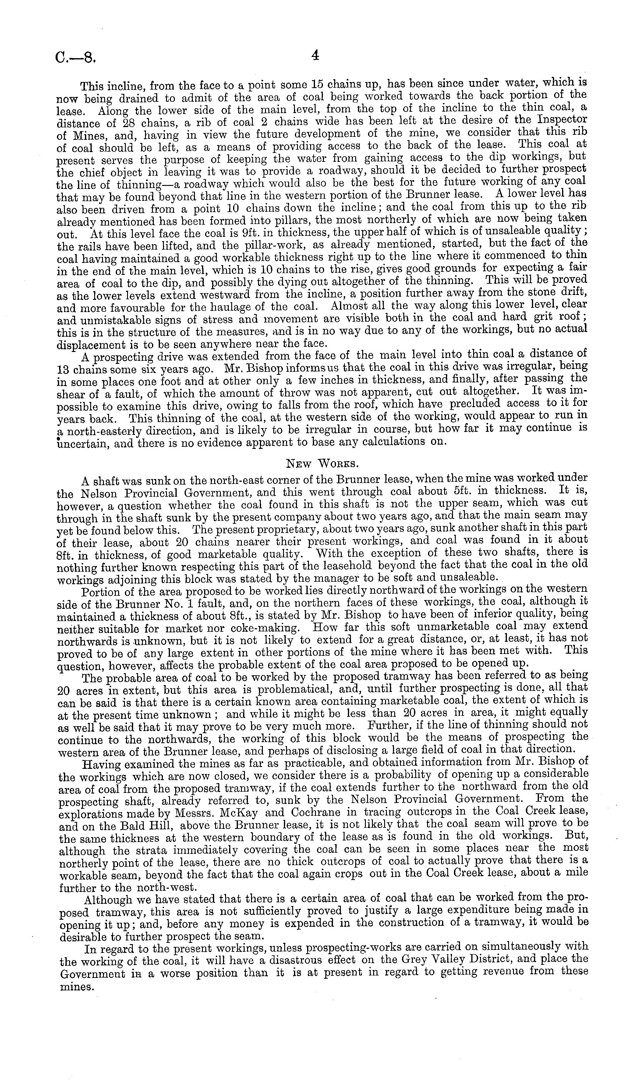 This incline, from the face to a point some 15 chains up, has been since under water, which is now being drained to admit of the area of coal being worked towards the back portion of the lease. Along the lower side of the main level, from the top of the incline to the thin coal, a distance of 28 chains, a rib of coal 2 chains wide has been left at the desire of the Inspector of Mines, and, having in view the future development of the mine, we consider that this rib of coal should be left, as a means of providing access to the back of the lease. This coal at present serves the purpose of keeping the water from gaining access to the dip workings, but the chief object in leaving it was to provide a roadway, should it be decided to further prospect the line of thinning—a roadway which would also be the best for the future working of any coal that may be found beyond that line in the western portion of the Brunner lease. A lower level has also been driven from a point 10 chains down the incline; and the coal from this up to the rib already mentioned has been formed into pillars, the most northerly of which are now being taken out. At this level face the coal is 9ft. in thickness, the upper half of which is of unsaleable quality ; the rails have been lifted, and the pillar-work, as already mentioned, started, but the fact of the coal having maintained a good workable thickness right up to the line where it commenced to thin in the end of the main level, which is 10 chains to the rise, gives good grounds for expecting a fair area of coal to the dip, and possibly the dying out altogether of the thinning. This will be proved as the lower levels extend westward from the incline, a position further away from the stone drift, and more favourable for the haulage of the coal. Almost all the way along this lower level, clear and unmistakable signs of stress and movement are visible both in the coal and hard grit roof ; this is in the structure of the measures, and is in no way due to any of the workings, but no actual displacement ie to be seen anywhere near the face. A prospecting drive was extended from the face of the main level into thin coal a distance of 13 chains some six years ago. Mr. Bishop informs us that the coal in this drive was irregular, being in some places one foot and at other only a few inches in thickness, and finally, after passing the shear of a fault, of which the amount of throw was not apparent, cut out altogether. It was impossible to examine this drive, owing to falls from the roof, which have precluded access to it for years back. This thinning of the coal, at the western side of the working, would appear to run in a north-easterly direction, and is likely to be irregular in course, but how far it may continue is uncertain, and there is no evidence apparent to base any calculations on. New Woeks. A shaft was sunk on the north-east corner of the Brunner lease, when the mine was worked under the Nelson Provincial Government, and this went through coal about sft. in thickness. It is, however, a question whether the coal found in this shaft is not the upper seam, which was cut through in the shaft sunk by the present company about two years ago, and that the main seam may yet be°found below this. The present proprietary" about two years ago, sunk another shaft in this part of their lease, about 20 chains nearer their present workings, and coal was found in it about Bft. in thickness, of good marketable quality. With the exception of these two shafts, there is nothing further known respecting this part of the leasehold beyond the fact that the coal in the old workings adjoining this block was stated by the manager to be soft and unsaleable. Portion of the area proposed to be worked lies directly northward of the workings on the western side of the Brunner No. 1 fault, and, on the northern faces of these workings, the coal, although it maintained a thickness of about Bft., is stated by Mr. Bishop to have been of inferior quality, being neither suitable for market nor coke-making. How far this soft unmarketable coal may extend northwards is unknown, but it is not likely to extend for a great distance, or, at least, it has not proved to be of any large extent in other portions of the mine where it has been met with. This question, however, affects the probable extent of the coal area proposed to be opened up. The probable area of coal to be worked by the proposed tramway has been referred to as being 20 acres in extent, but this area is problematical, and, until further prospecting is done., all that can be said is that there is a certain known area containing marketable coal, the extent_ of which is at the present time unknown ; and while it might be less than 20 acres in area, it might equally as well be said that it may prove to be very much more. Further, if the line of thinning should not continue to the northwards, the working of this block would be the means of prospecting the western area of the Brunner lease, and perhaps of disclosing a large field of coal in that direction. Having examined the mines as far as practicable, and obtained information from Mr. Bishop of the workings which are now closed, we consider there is a probability of opening up a considerable area of coal from the proposed tramway, if the coal extends further to the northward from the old prospecting shaft, already referred to, sunk by the Nelson Provincial Government. From the explorations made by Messrs. McKay and Cochrane in tracing outcrops in the Coal Creek lease, and on the Bald Hill, above the Brunner lease, it is not likely that the coal seam will prove to be the same thickness at the western boundary of the lease as is found in the old workings. But, although the strata immediately covering the coal can be seen in some places near the most northerly point of the lease, there are no thick outcrops of coal to actually prove that there is a workable seam, beyond the fact that the coal again cr
