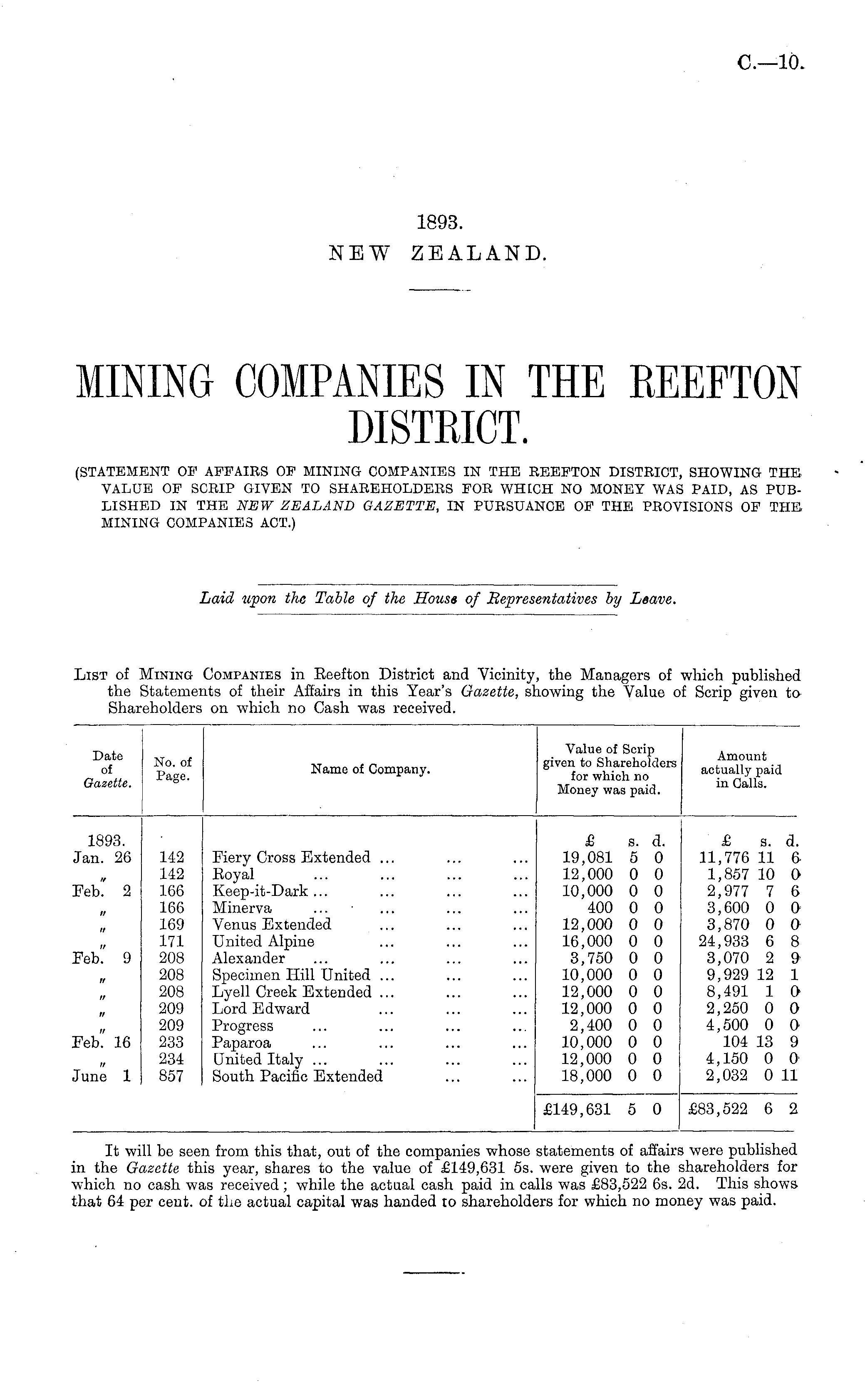 MINING COMPANIES IN THE REEFTON DISTRICT. (STATEMENT OF AFFAIRS OF MINING COMPANIES IN THE REEFTON DISTRICT, SHOWING THE VALUE OF SCRIP GIVEN TO SHAREHOLDERS FOR WHICH NO MONEY WAS PAID, AS PUBLISHED IN THE NEW ZEALAND GAZETTE, IN PURSUANCE OF THE PROVISIONS OF THE MINING COMPANIES ACT.)