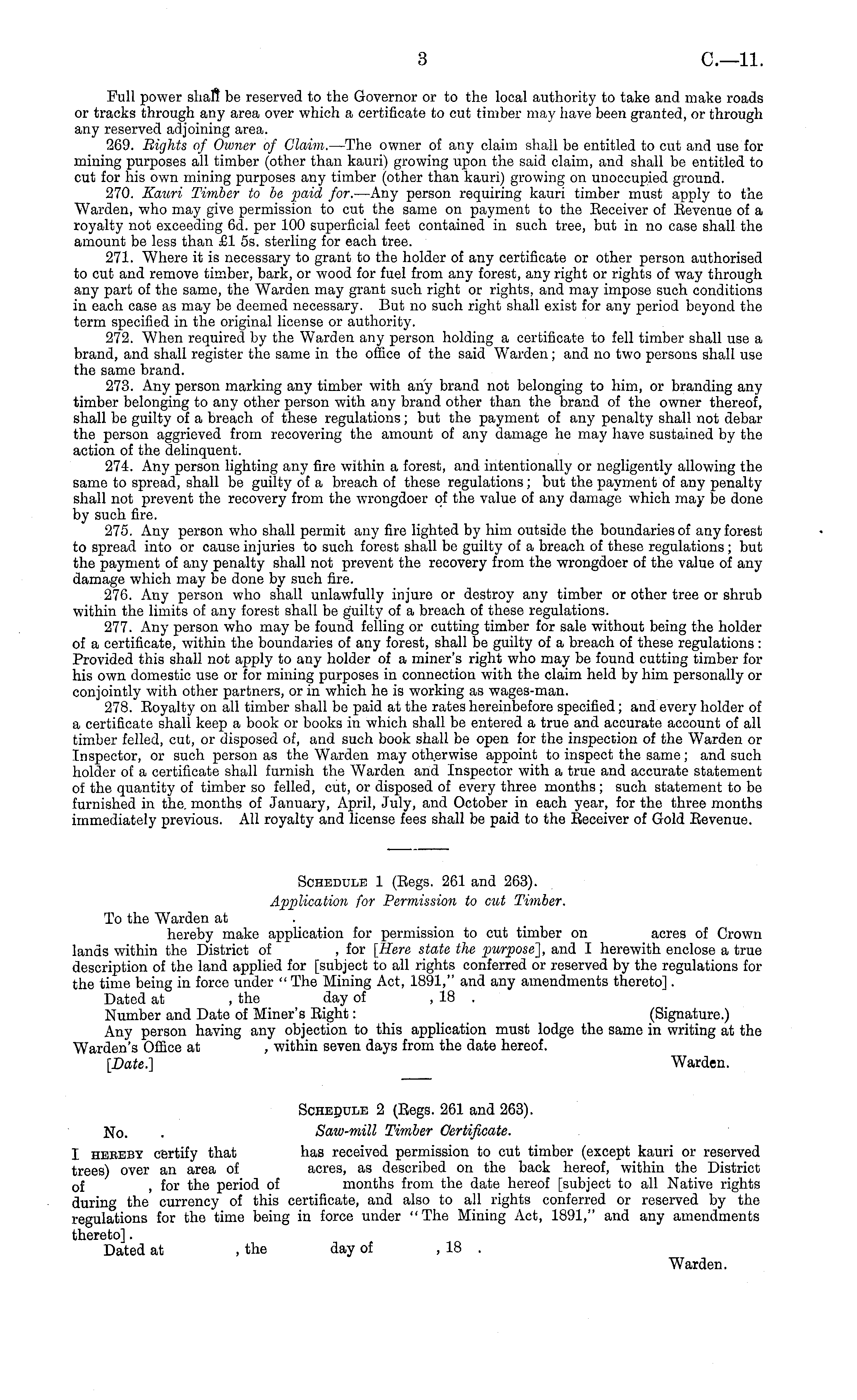 Full power shall be reserved to the Governor or to the local authority to take and make roads or tracks through any area over which a certificate to cut timber may have been granted, or through any reserved adjoining area. 269. Bights of Owner of Claim. —The owner of any claim shall be entitled to cut and use for mining purposes all timber (other than kauri) growing upon the said claim, and shall be entitled to cut for his own mining purposes any timber (other than kauri) growing on unoccupied ground. 270. Kauri Timber to be paid for. —Any person requiring kauri timber must apply to the Warden, who may give permission to cut the same on payment to the Receiver of Revenue of a royalty not exceeding 6d. per 100 superficial feet contained in such tree, but in no case shall the amount be less than £1 ss. sterling for each tree. 271. Where it is necessary to grant to the holder of any certificate or other person authorised to cut and remove timber, bark, or wood for fuel from any forest, any right or rights of way through any part of the same, the Warden may grant such right or rights, and may impose such conditions in each case as may be deemed necessary. But no such right shall exist for any period beyond the term specified in the original license or authority. 272. When required by the Warden any person holding a certificate to fell timber shall use a brand, and shall register the same in the office of the said Warden ; and no two persons shall use the same brand. 273. Any person marking any timber with any brand not belonging to him, or branding any timber belonging to any other person with any brand other than the brand of the owner thereof, shall be guilty of a breach of these regulations; but the payment of any penalty shall not debar the person aggrieved from recovering the amount of any damage he may have sustained by the action of the delinquent. 274. Any person lighting any fire within a forest, and intentionally or negligently allowing the same to spread, shall be guilty of a breach of these regulations; but the payment of any penalty shall not prevent the recovery from the wrongdoer of the value of any damage which may be done by such fire. 275. Any person who shall permit any fire lighted by him outside the boundaries of any forest to spread into or cause injuries to such forest shall be guilty of a breach of these regulations; but the payment of any penalty shall not prevent the recovery from the wrongdoer of the value of any damage which may be done by such fire. 276. Any person who shall unlawfully injure or destroy any timber or other tree or shrub within the limits of any forest shall be guilty of a breach of these regulations. 277. Any person who may be found felling or cutting timber for sale without being the holder of a certificate, within the boundaries of any forest, shall be guilty of a breach of these regulations: Provided this shall not apply to any holder of a miner's right who may be found cutting timber for his own domestic use or for mining purposes in connection with the claim held by him personally or conjointly with other partners, or in which he is working as wages-man. 278. Royalty on all timber shall be paid at the rates hereinbefore specified; and every holder of a certificate shall keep a book or books in which shall be entered a true and accurate account of all timber felled, cut, or disposed of, and such book shall be open for the inspection of the Warden or Inspector, or such person as the Warden may otherwise appoint to inspect the same; and such holder of a certificate shall furnish the Warden and Inspector with a true and accurate statement of the quantity of timber so felled, cut, or disposed of every three months; such statement to be furnished in the. months of January, April, July, and October in each year, for the three months immediately previous. All royalty and license fees shall be paid to the Receiver of Gold Revenue.
