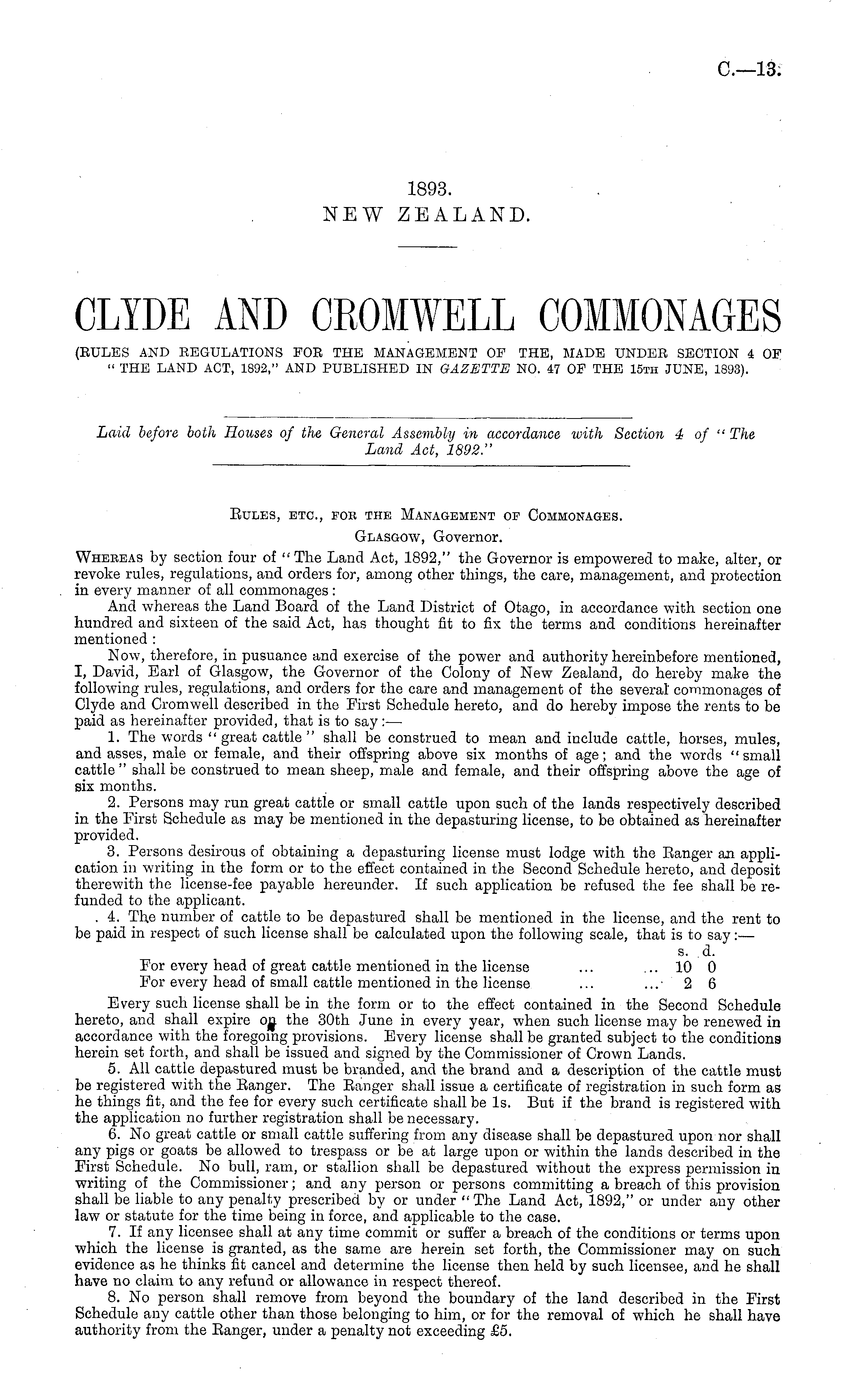 CLYDE AND CROMWELL COMMONAGES (RULES AND REGULATIONS FOR THE MANAGEMENT OF THE, MADE UNDER SECTION 4 OF "THE LAND ACT, 1892," AND PUBLISHED IN GAZETTE NO. 47 OF THE 15th JUNE, 1893).