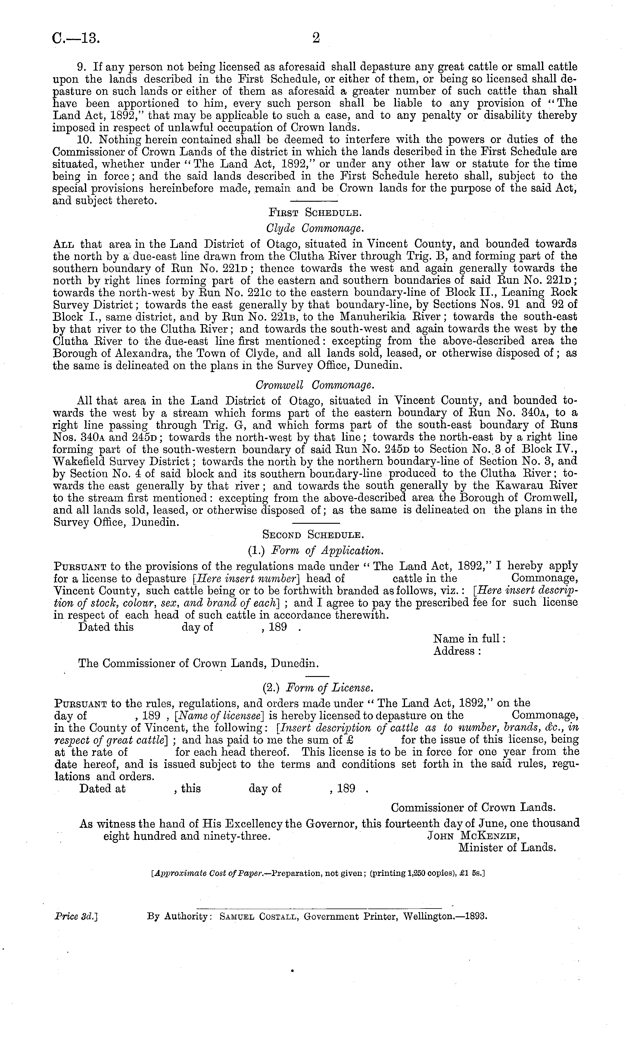 (2.) Form of License. Pursuant to the rules, regulations, and orders made under " The Land Act, 1892," on the day of , 189 , [Name of licensee] is hereby licensed to depasture on the Commonage, in the County of Vincent, the following: [Insert description of cattle as to number, brands, &c, in respect of great cattle] ; and has paid to me the sum of £ for the issue of this license, being at the rate of for each head thereof. This license is to be in force for one year from the date hereof, and is issued subject to the terms and conditions set forth in the said rules, regulations and orders. Dated at , this day of , 189 . Commissioner of Crown Lands. As witness the hand of His Excellency the Governor, this fourteenth day of June, one thousand eight hundred and ninety-three. John McKenzie, Minister of Lands. [Approximate Cost of Paper.— Preparation, not given; (printing 1,250 copies), £1 ss.]